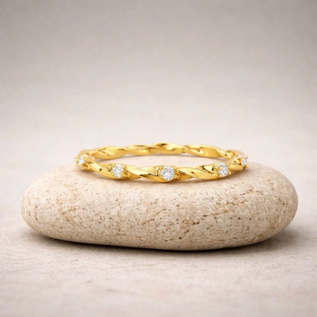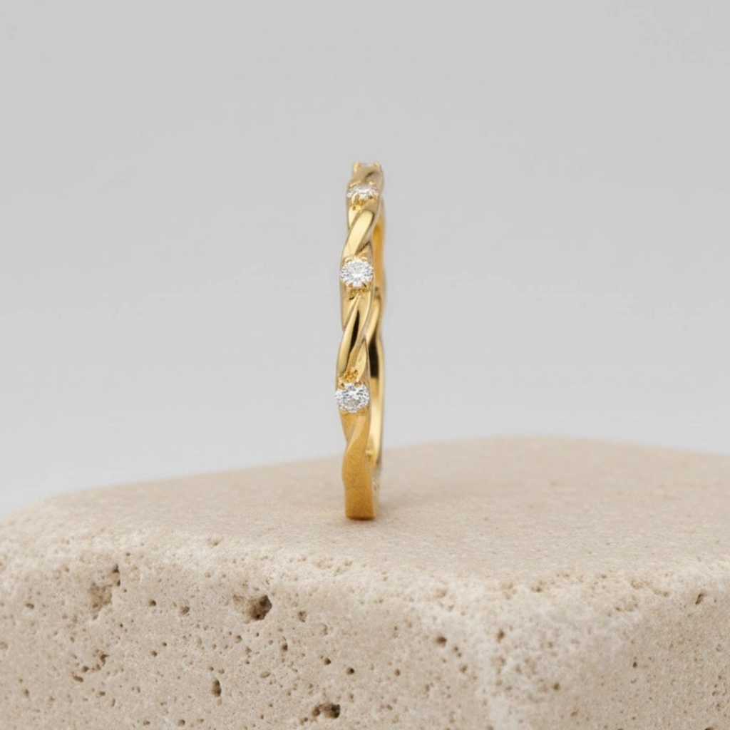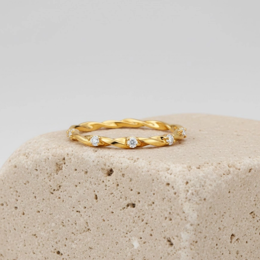 Minimal yarım tur formu ile tektaş pırlantanın sade ışıltısını bir araya getiren bu yüzük, zarif ve modern bir duruş sunar.