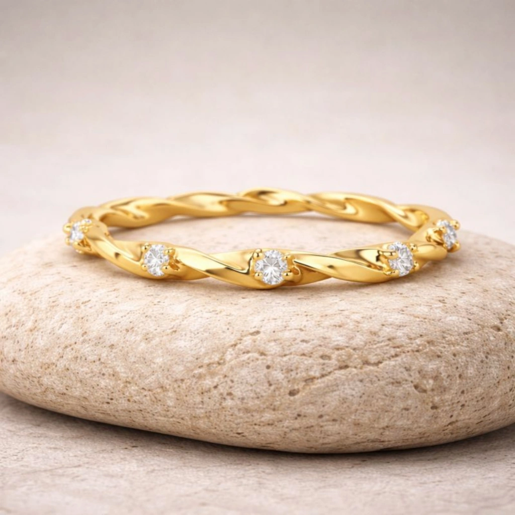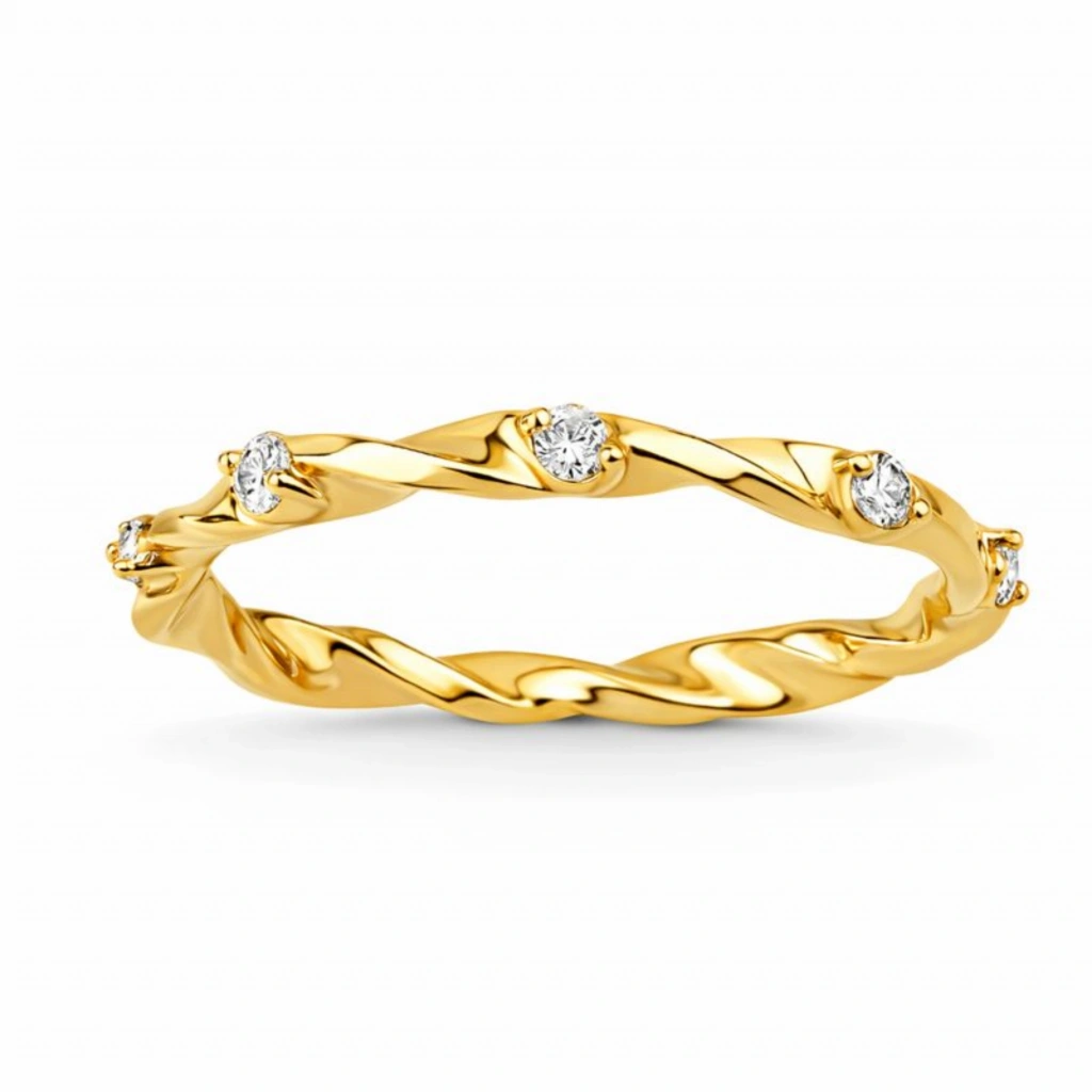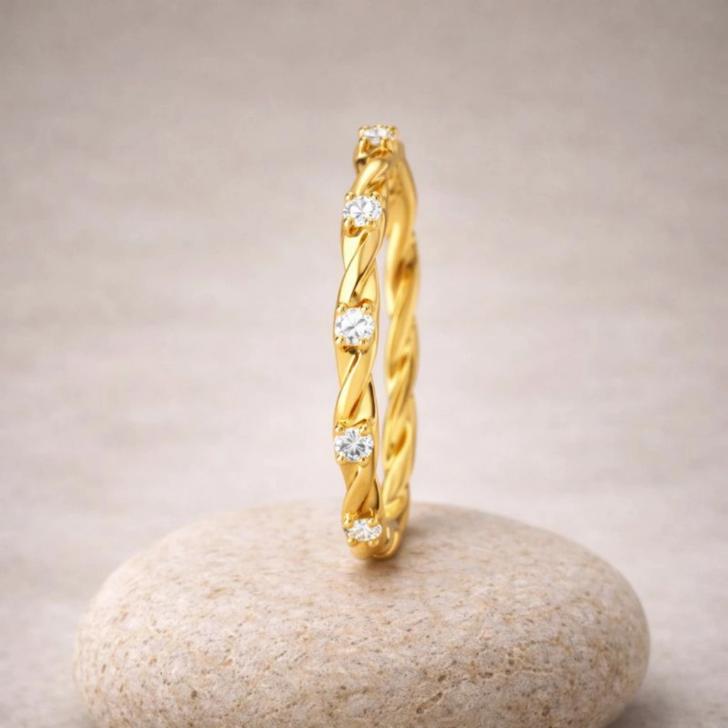 Minimal yarım tur formu ile tektaş pırlantanın sade ışıltısını bir araya getiren bu yüzük, zarif ve modern bir duruş sunar.