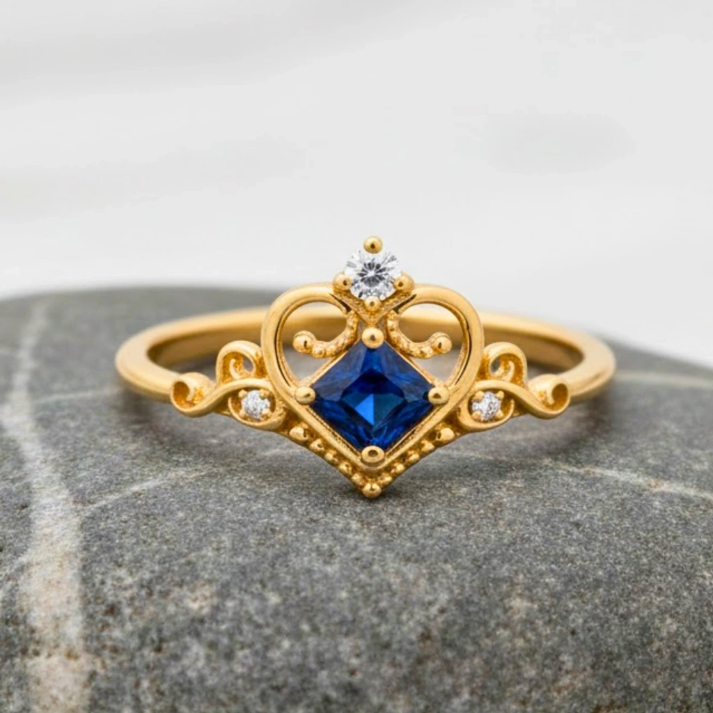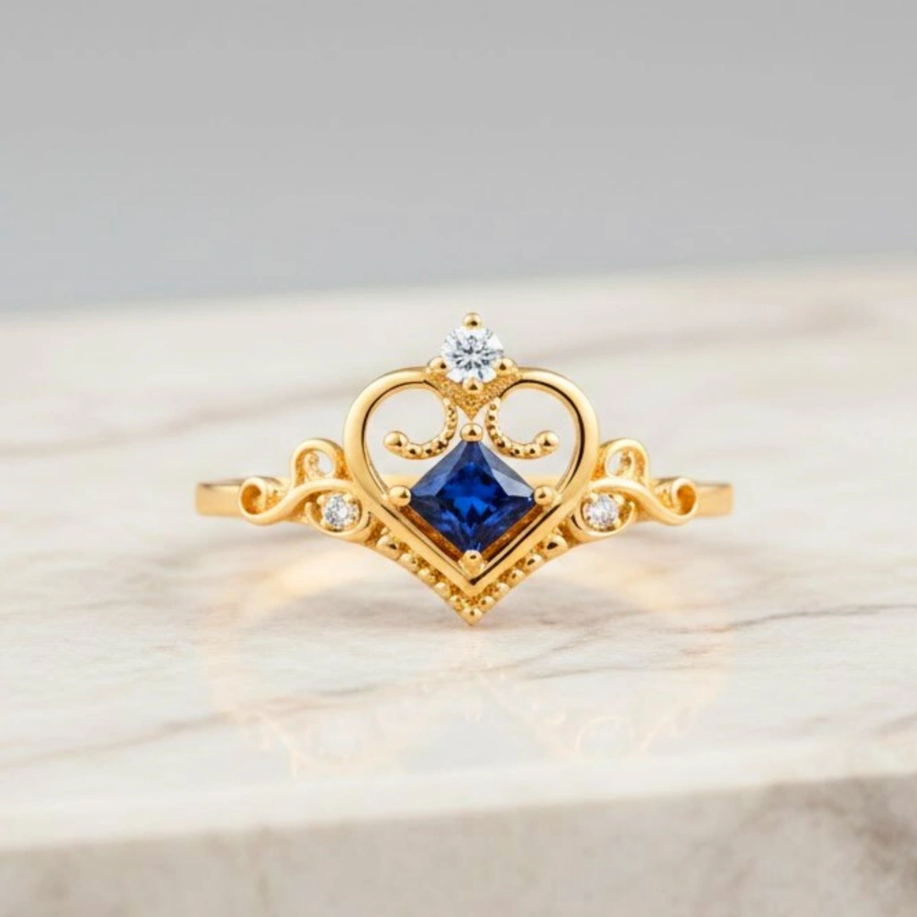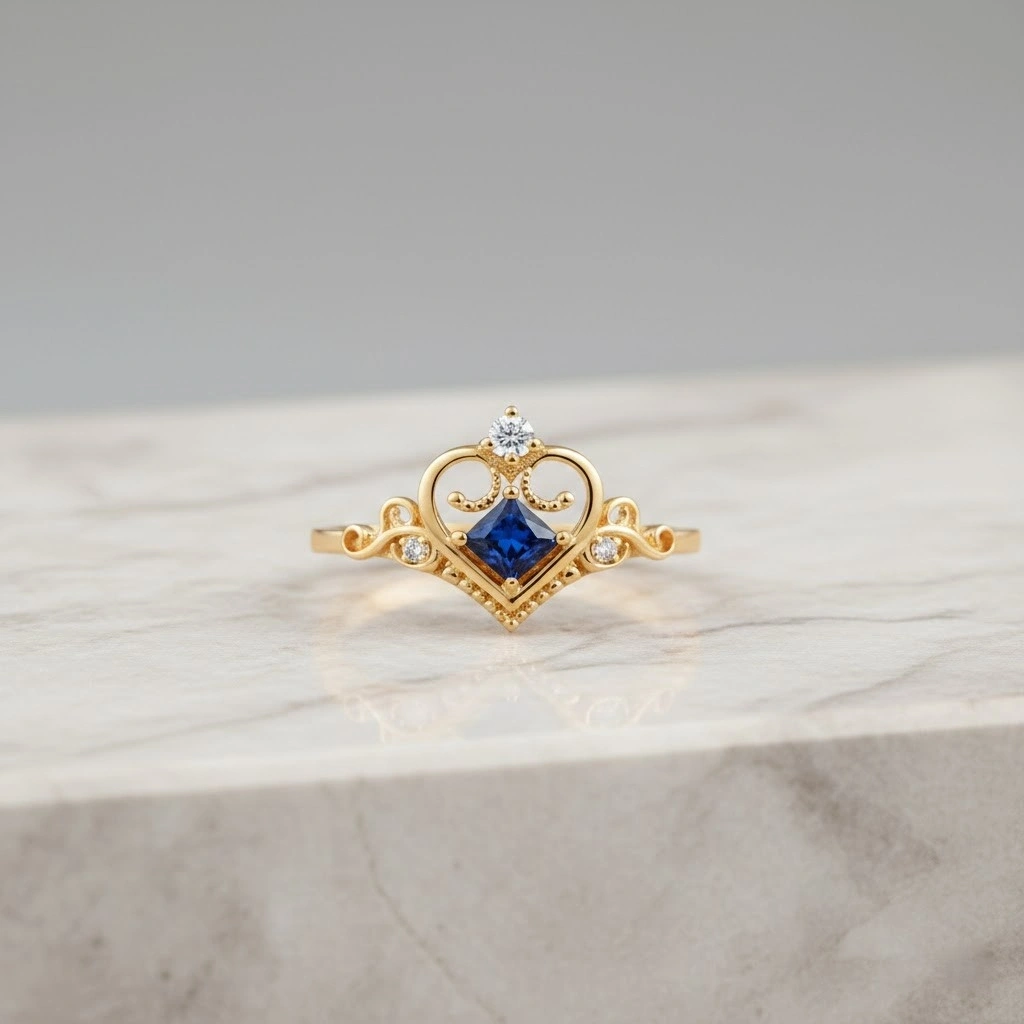 Zarafetin mavi ışıltıyla birleştiği bu özel tasarım yüzük, kraliçe tacı formuyla göz alıcı bir duruş sunar.