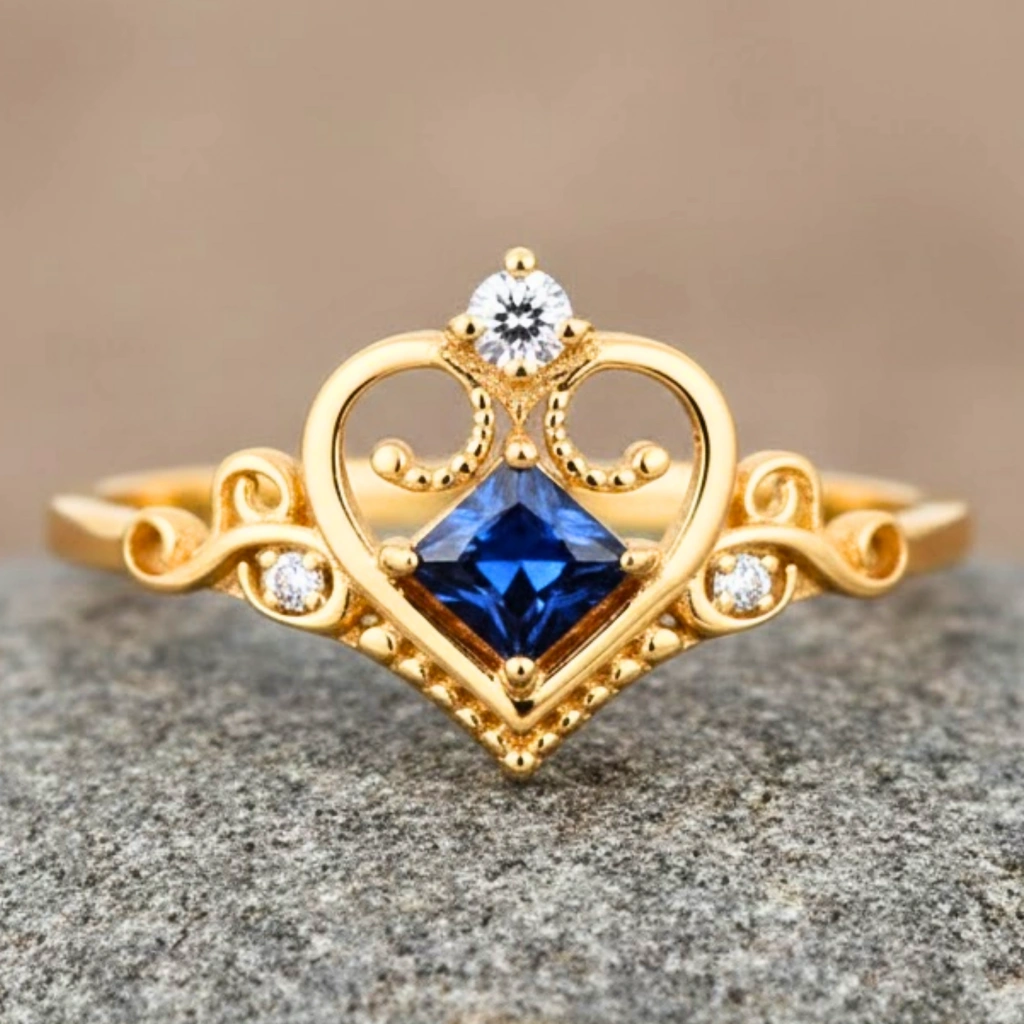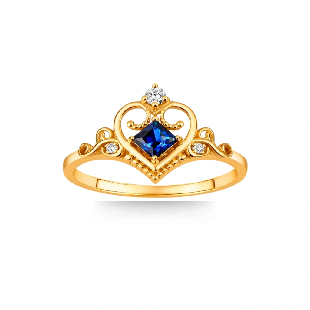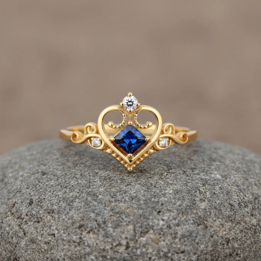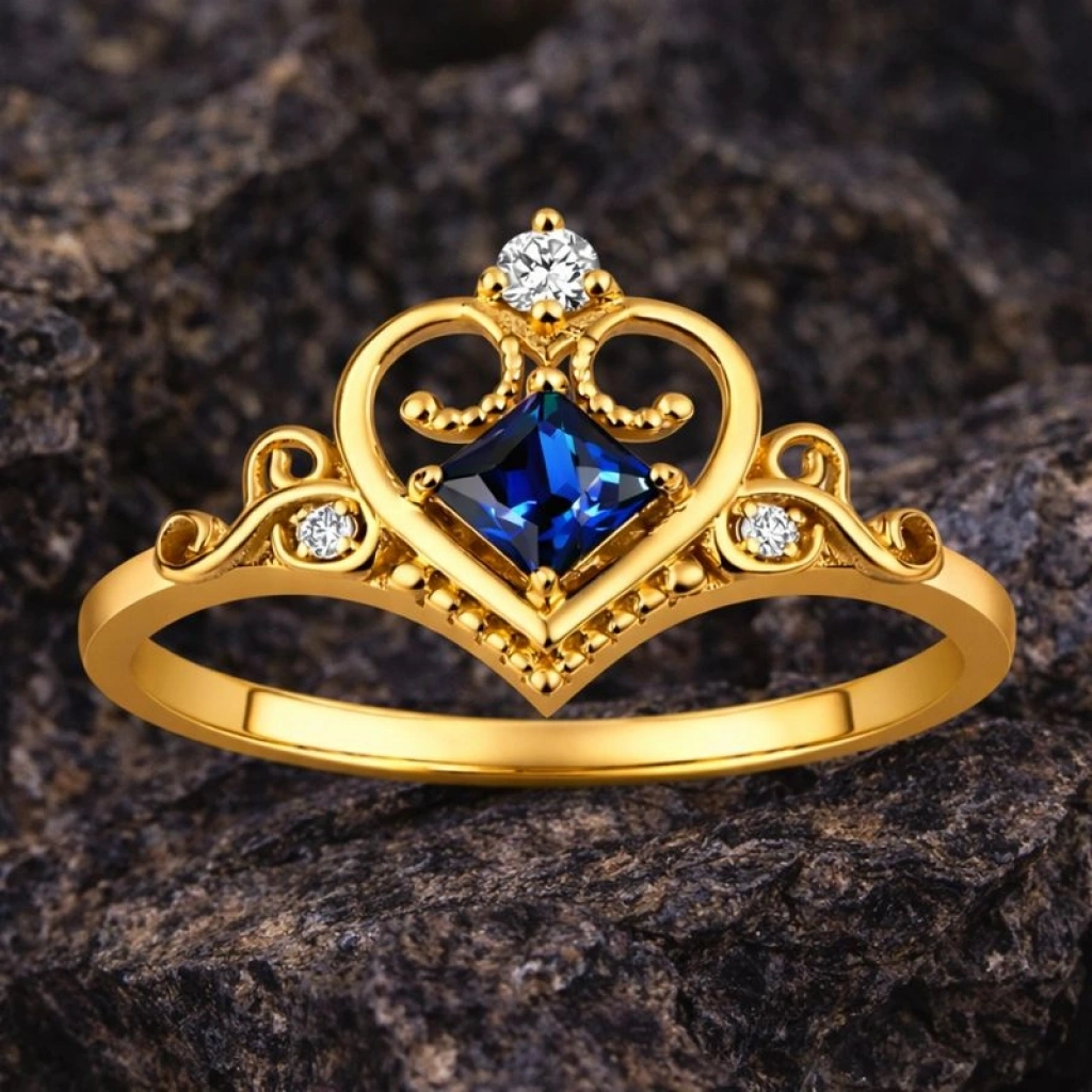 Zarafetin mavi ışıltıyla birleştiği bu özel tasarım yüzük, kraliçe tacı formuyla göz alıcı bir duruş sunar.