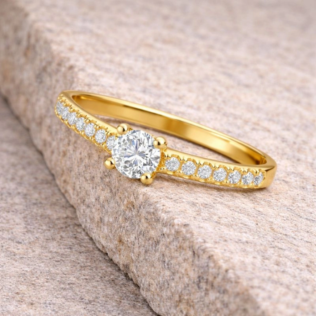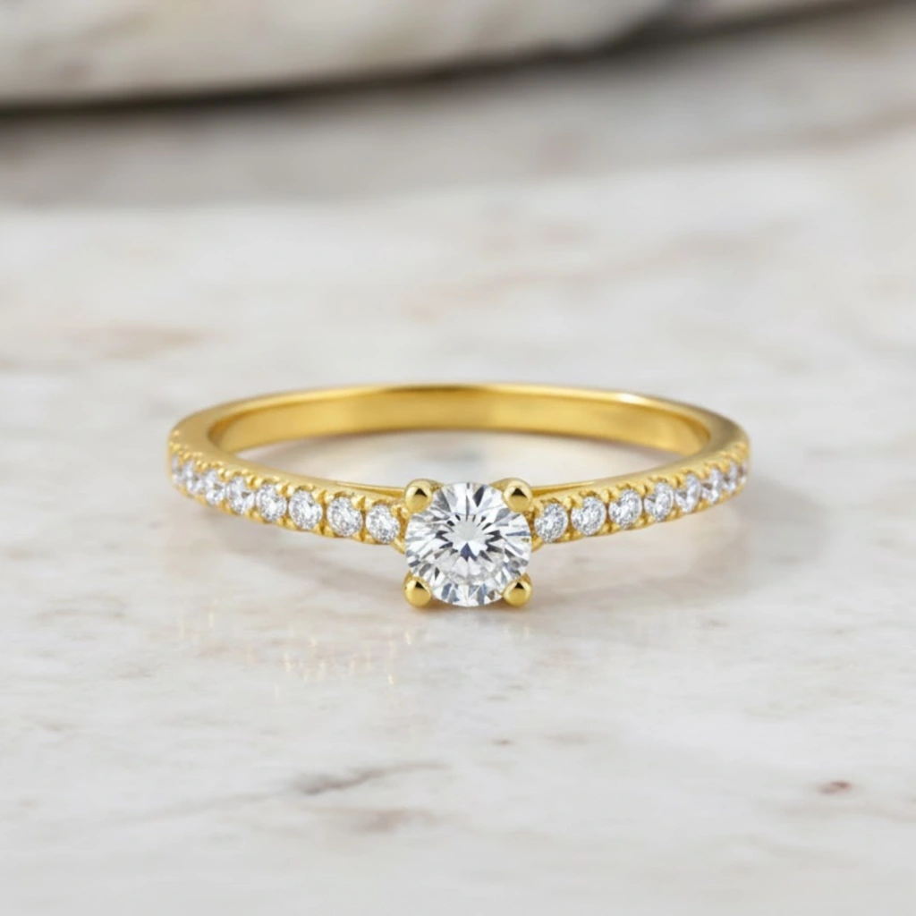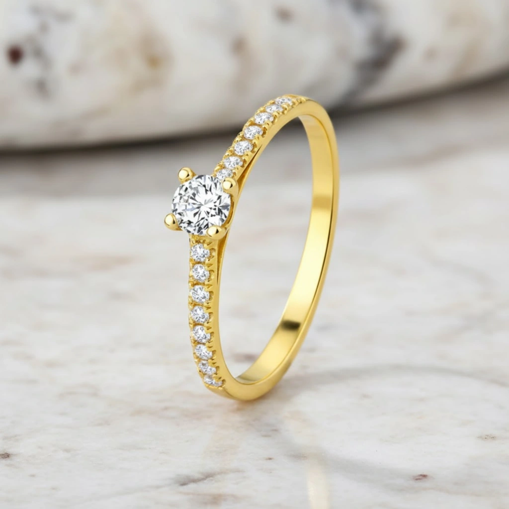 Zarif duruşu güçlü ışıltıyla birleştiren bu 14 Ayar Altın 0.30 Karat Pırlanta Yüzük, modern çizgilerle yorumlanan zamansız tektaş stilini sunar. Özenle seçilmiş pırlantaların ışığı büyüleyici şekilde yansıtmasıyla hem günlük kullanıma hem de özel anlara eşlik eder.