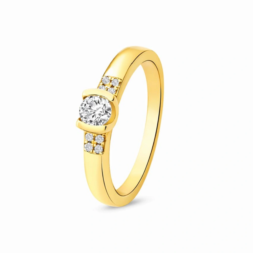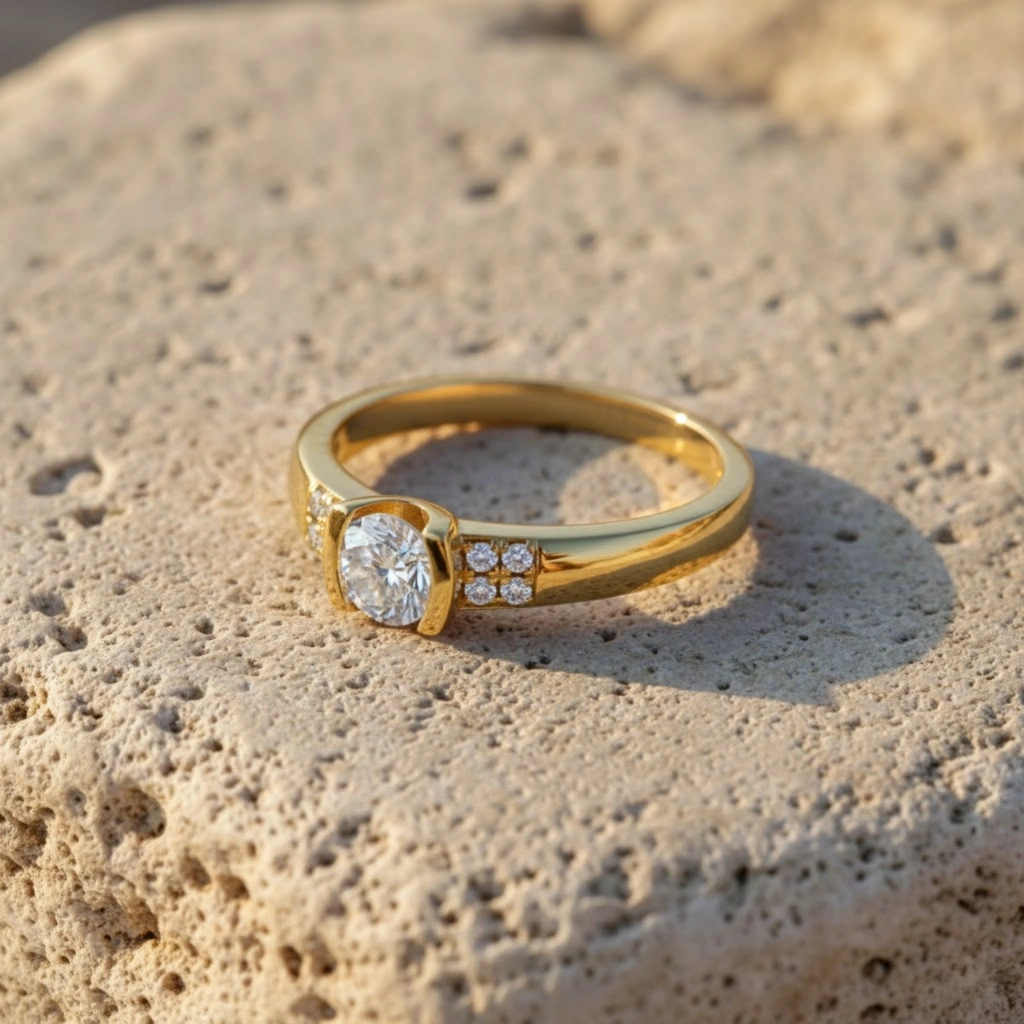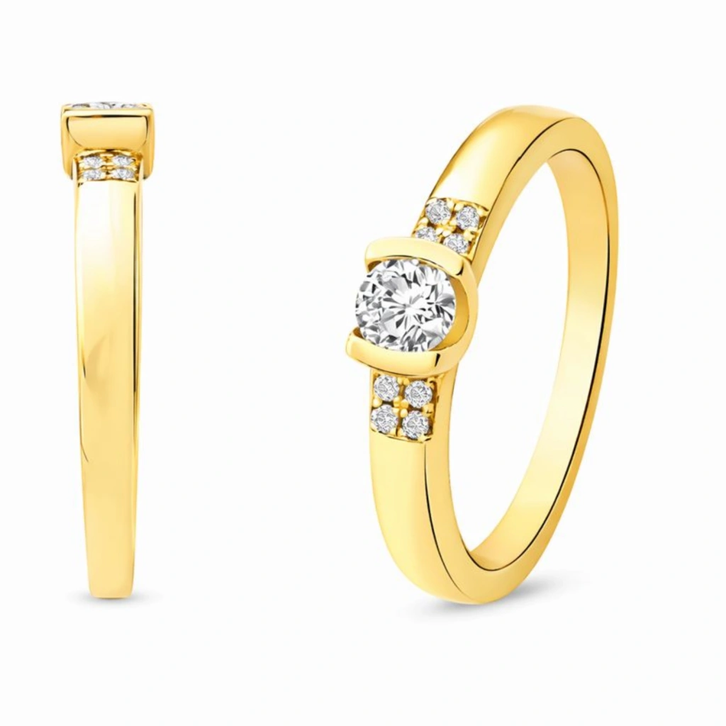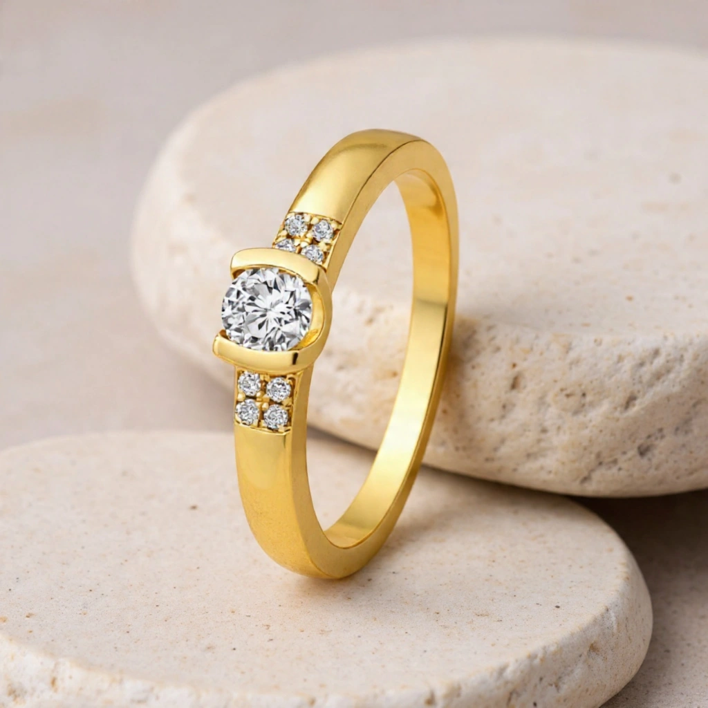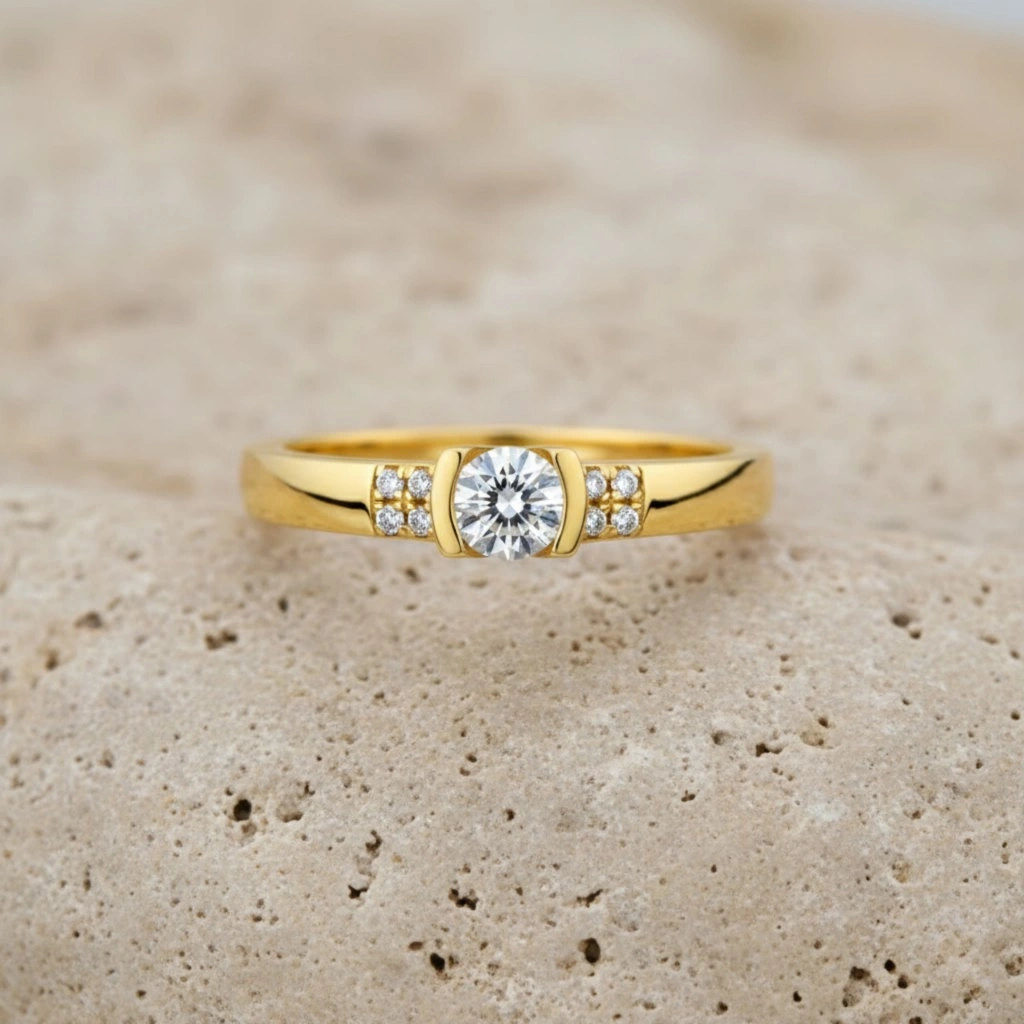 Zarif tasarımı ve dengeli taş yerleşimiyle öne çıkan bu yüzük, tektaş görünümünü alyans formunun modern şıklığıyla birleştirir.
