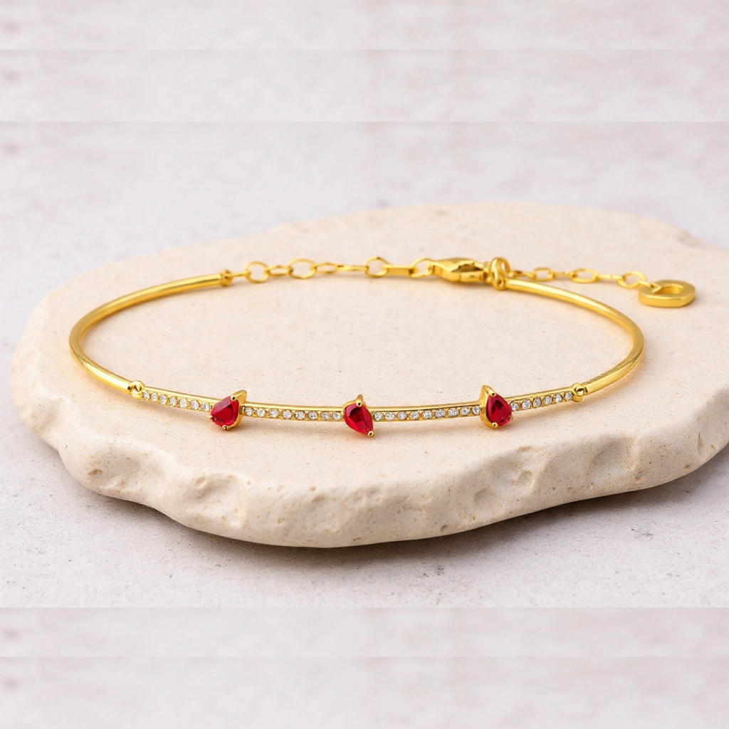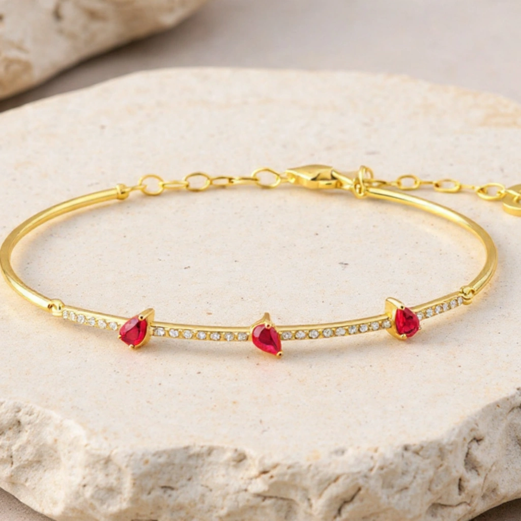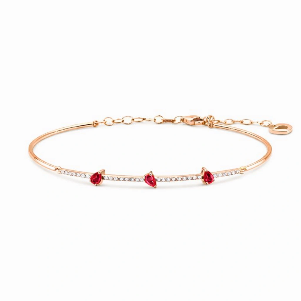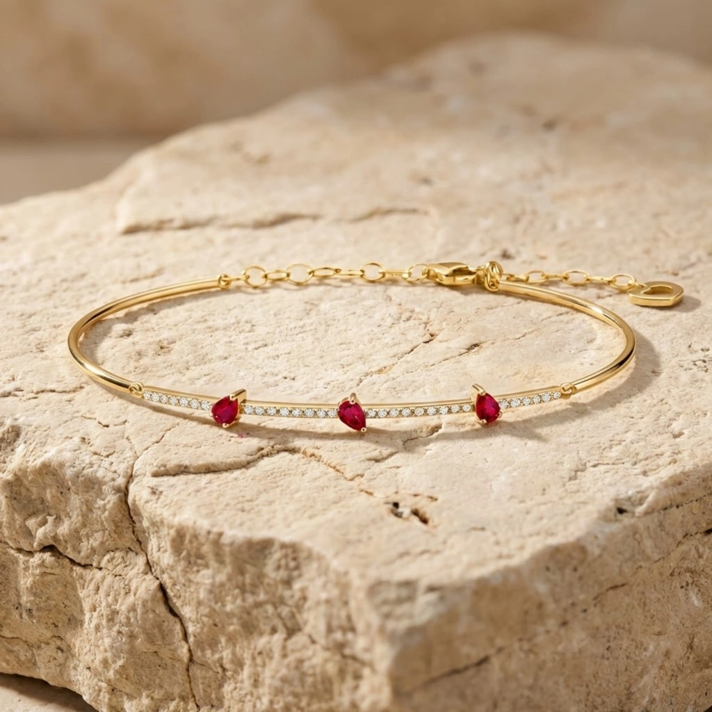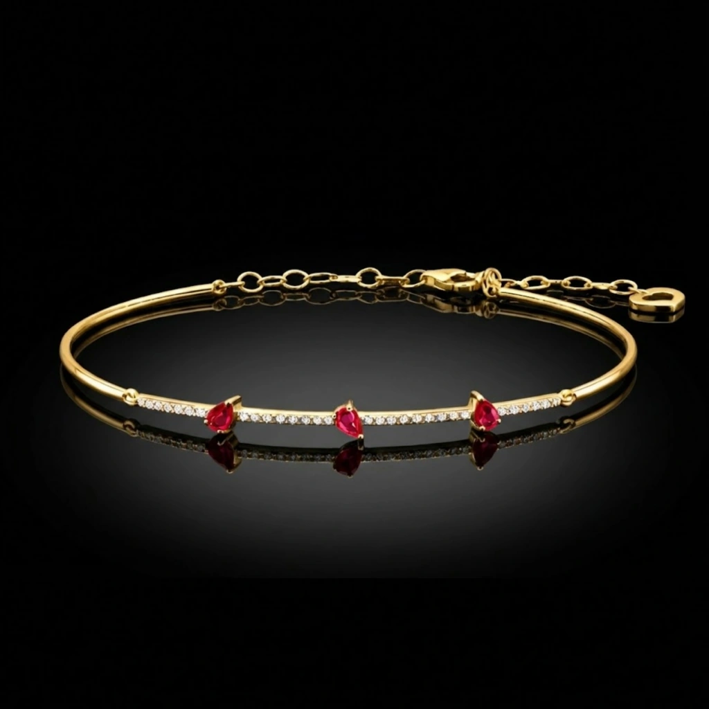 Damla kesim yakutun güçlü rengi ile pırlantanın zarif ışıltısını bir araya getiren bu bileklik, bilekte sofistike ve feminen bir etki yaratır.