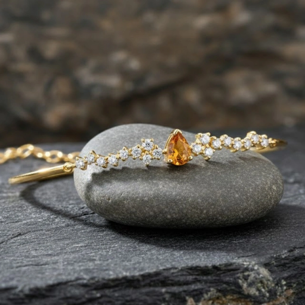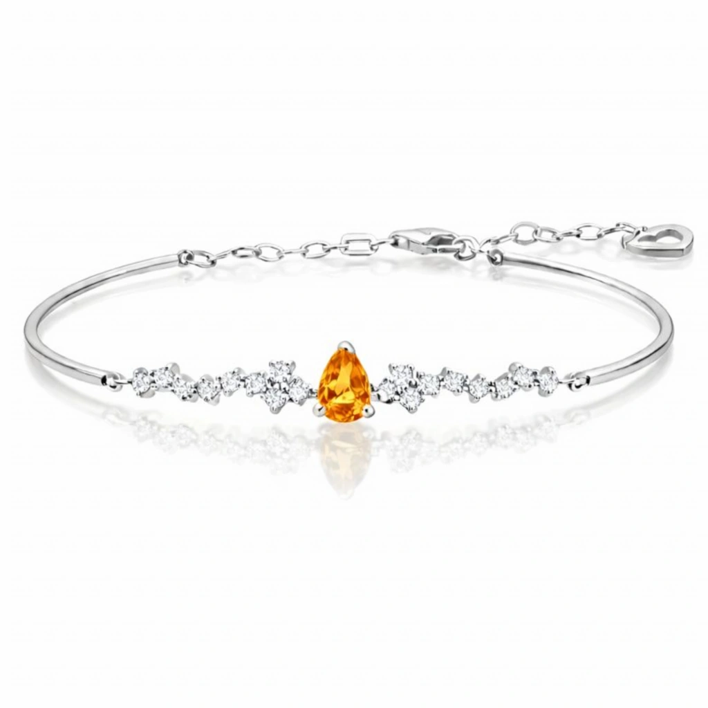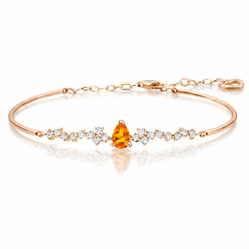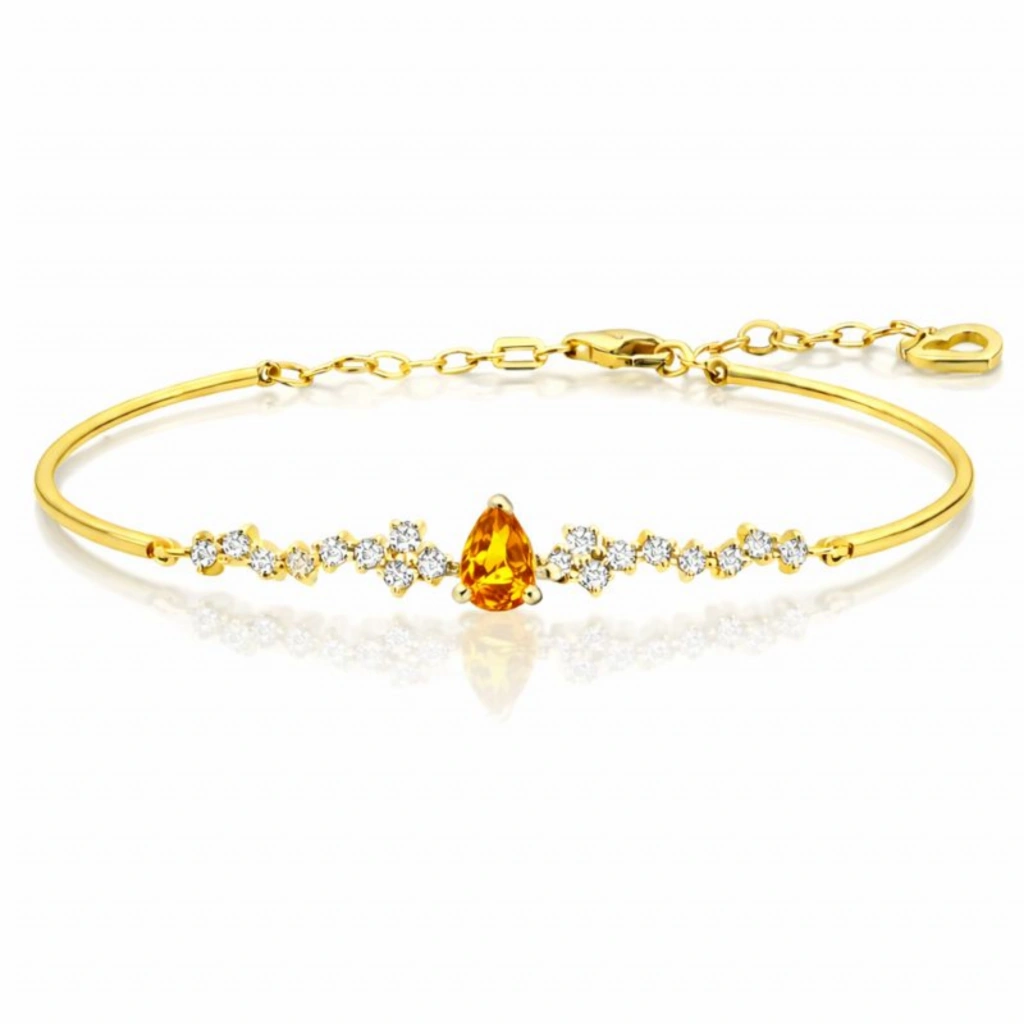 Sitrinin parlak ve sıcak tonlarını pırlantanın zarafetiyle buluşturan bu bileklik, enerjisi yüksek ve modern bir şıklık sunar.