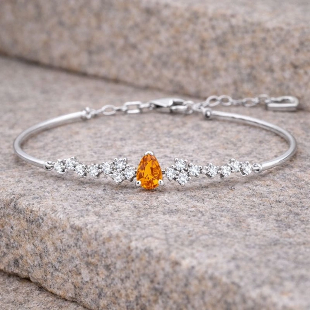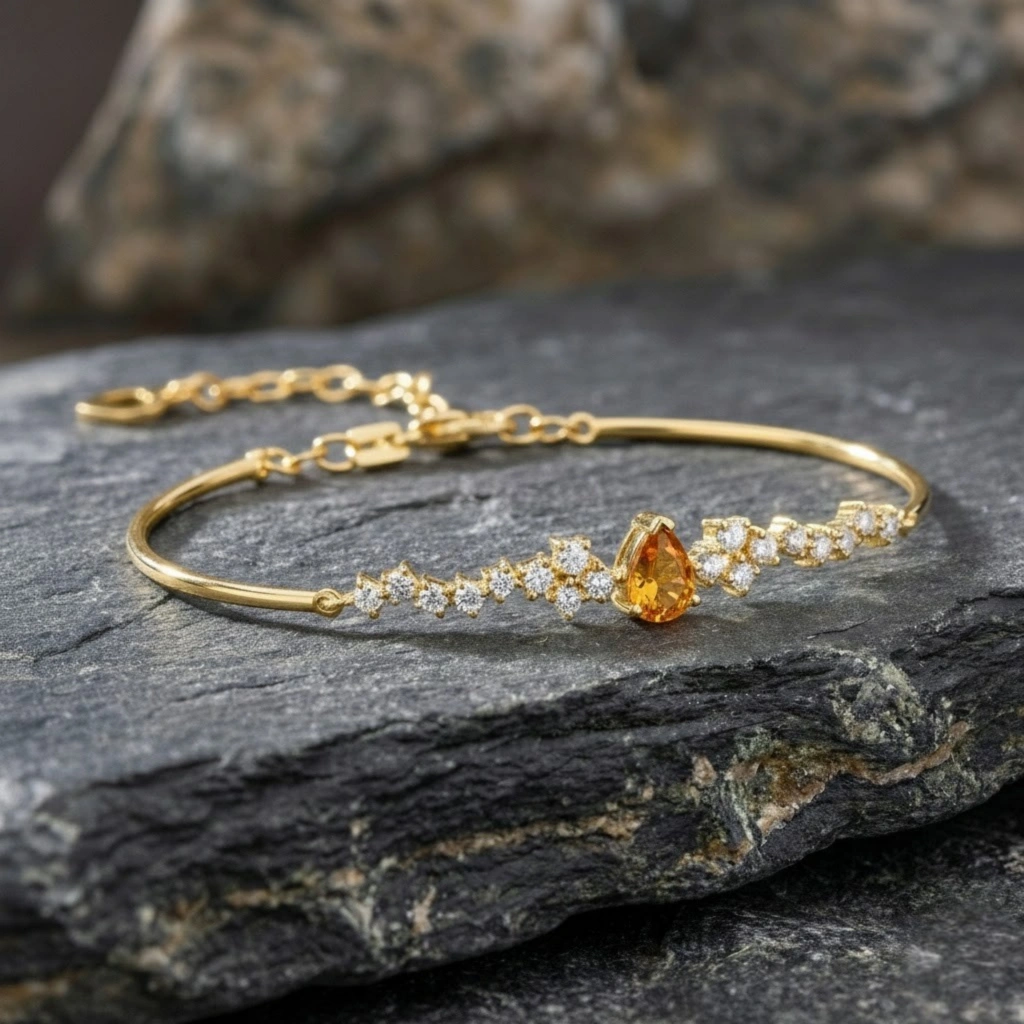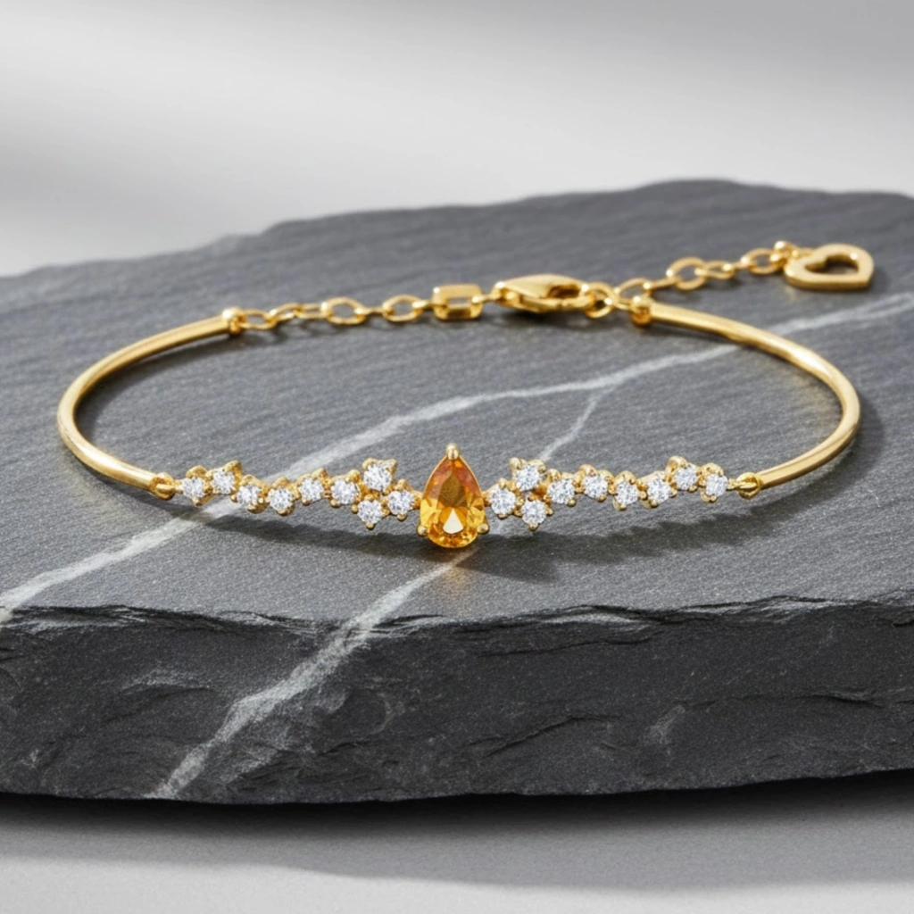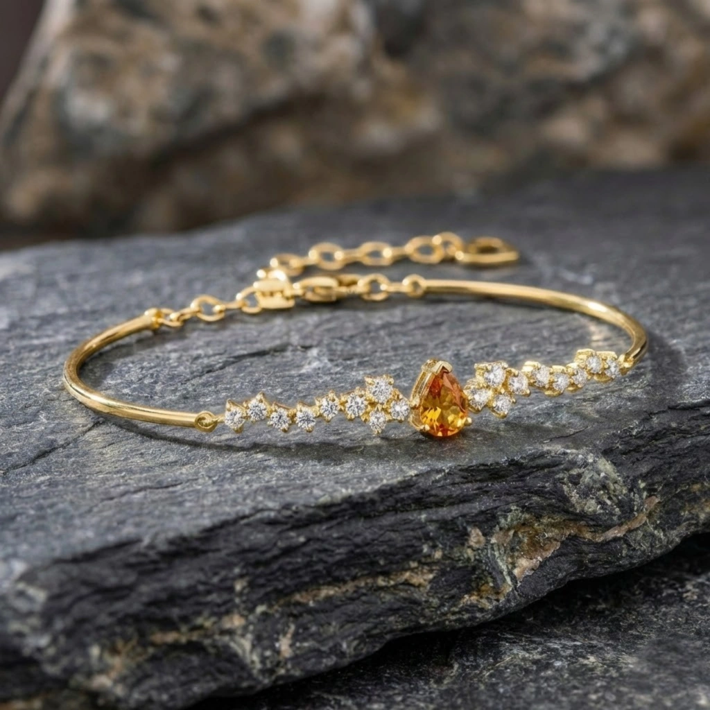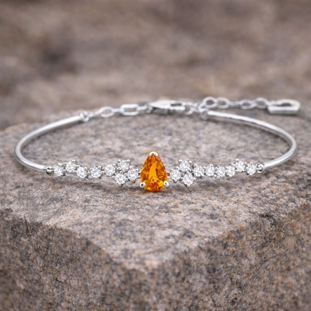 Sitrinin parlak ve sıcak tonlarını pırlantanın zarafetiyle buluşturan bu bileklik, enerjisi yüksek ve modern bir şıklık sunar.