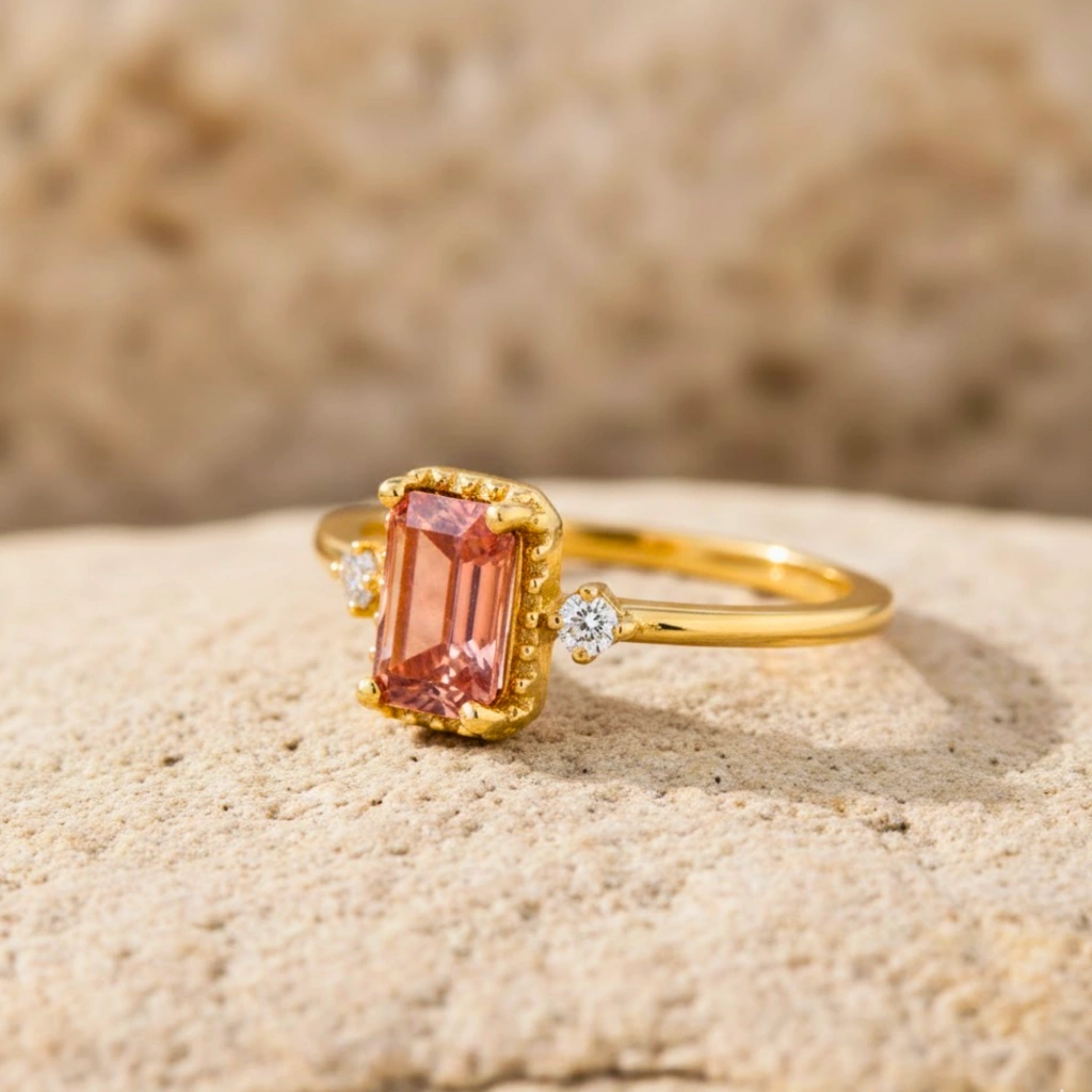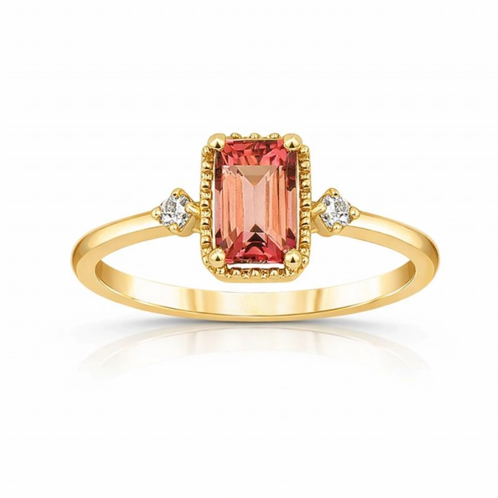0.90 Karat Pembe Turmalin Pırlanta Yüzük, Zümrüt Kesim Altın Yüzük