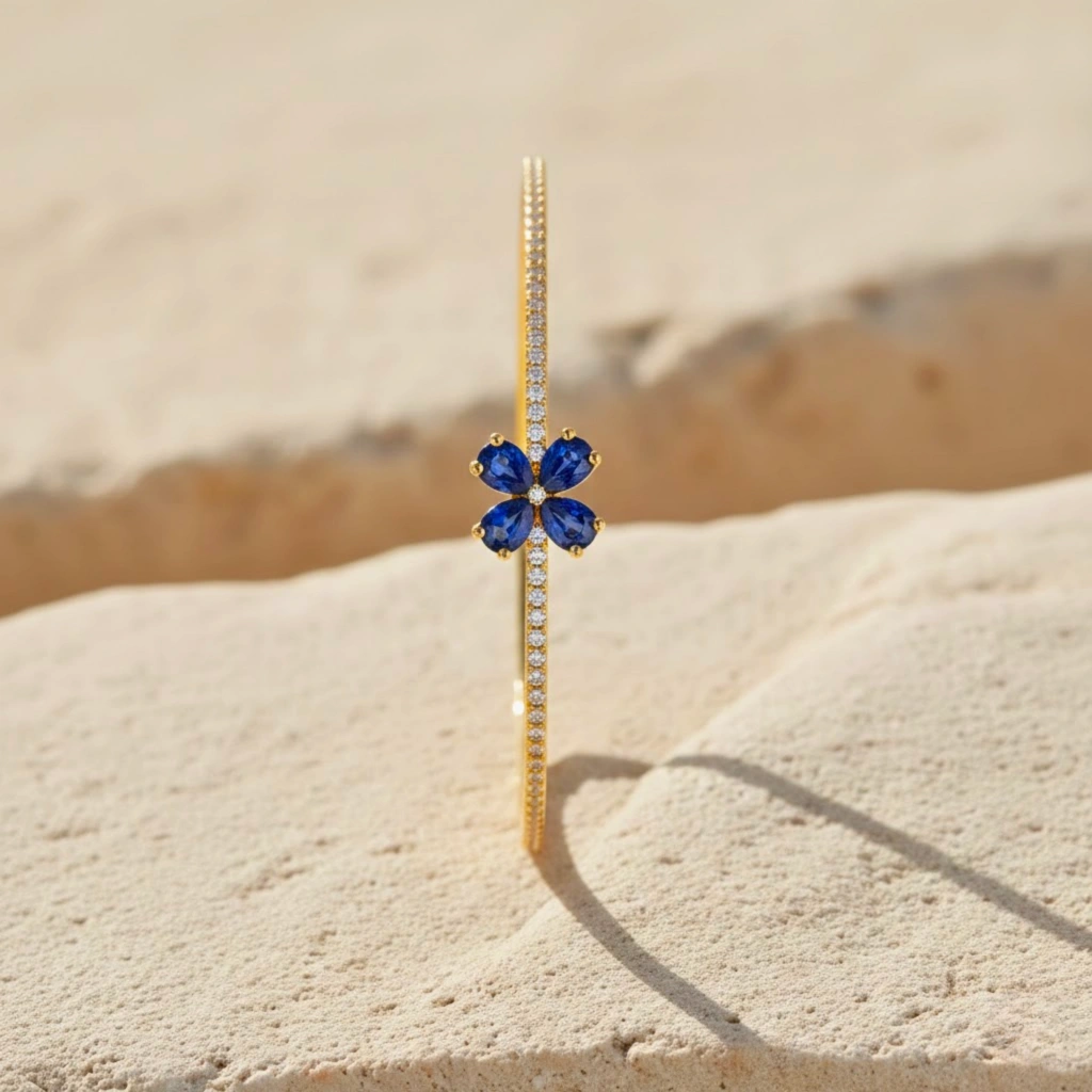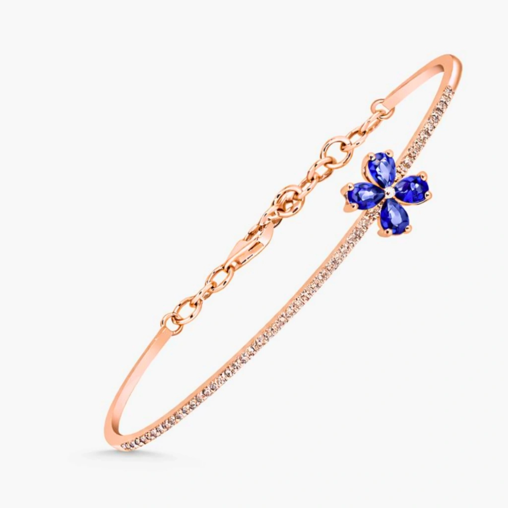 Yonca motifinin zarif sembolizmini safirin derin rengi ve pırlantanın ışıltısıyla bir araya getiren bu bileklik, bilekte dengeli ve sofistike bir duruş sergiler.