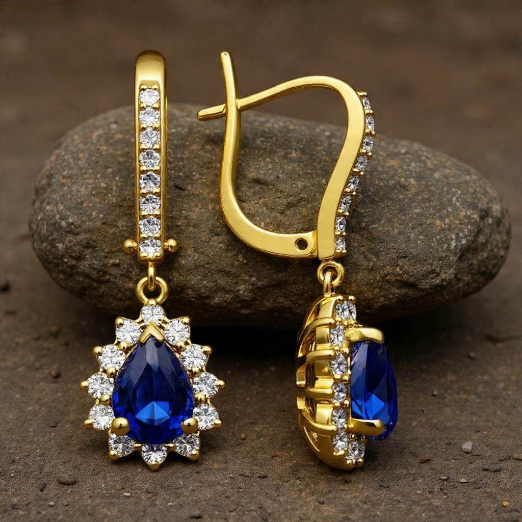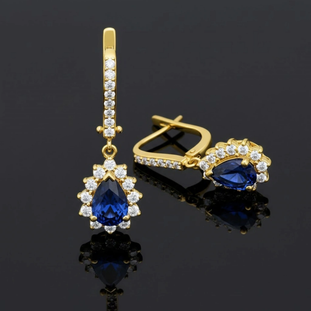 Damla kesim safirin zarif formu ile pırlantanın ışıltısını buluşturan bu küpe, feminen ve sofistike bir duruş sunar.