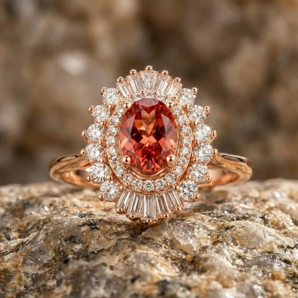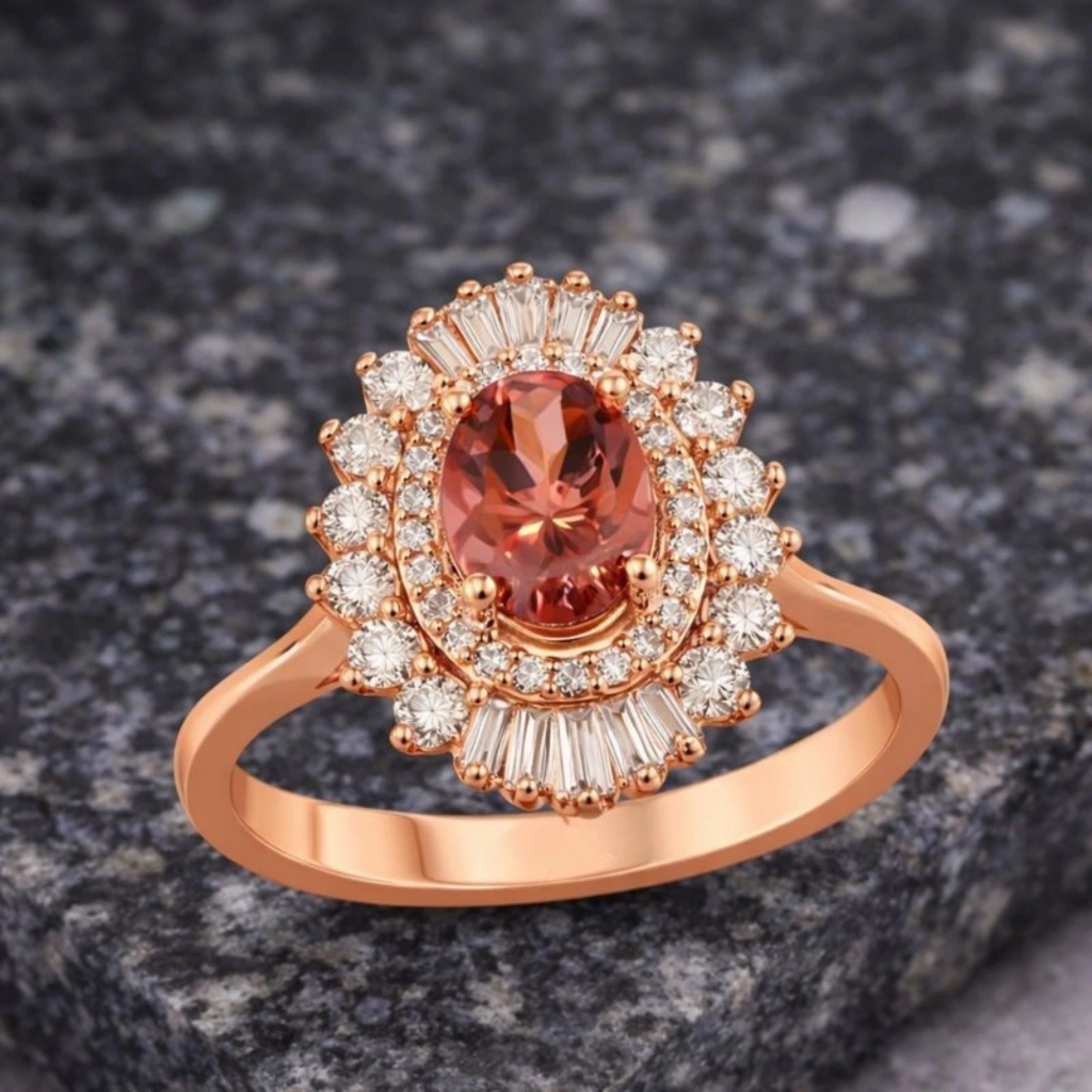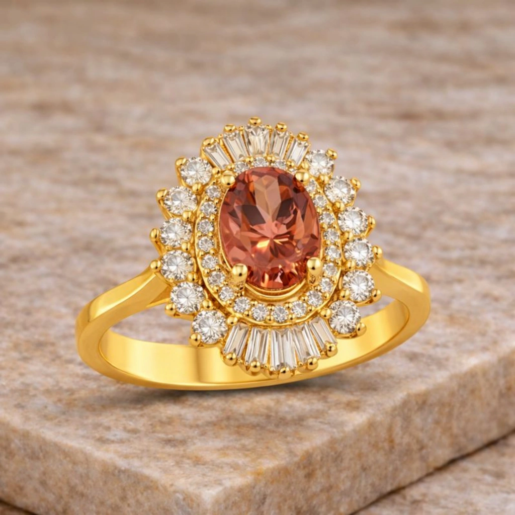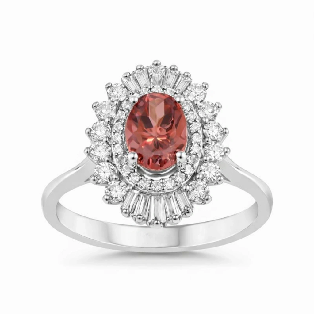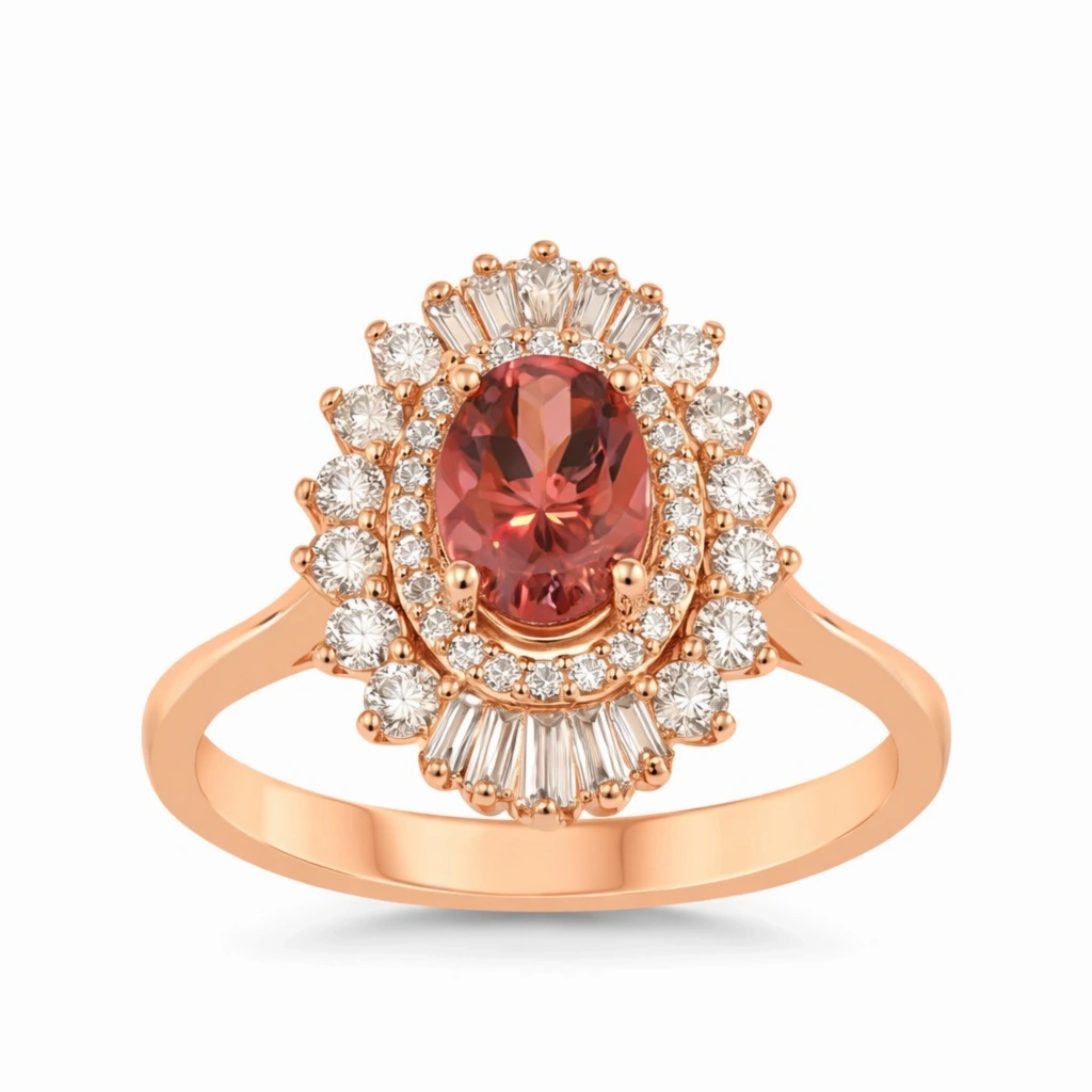Bu göz alıcı anturaj turmalin yüzük, modern zarafeti klasik mücevher estetiğiyle buluşturur. Merkezde yer alan oval kesim turmalin taşı, etrafını saran round ve baget kesim pırlanta detayları ile etkileyici bir ışıltı sunar. Güçlü duruşu ve sofistike tasarımıyla özel davetler, nişan veya unutulmaz hediyeler için kusursuz bir tercihtir. Zarafet, ihtişam ve feminen şıklığı simgeleyen zamansız bir tasarımdır.