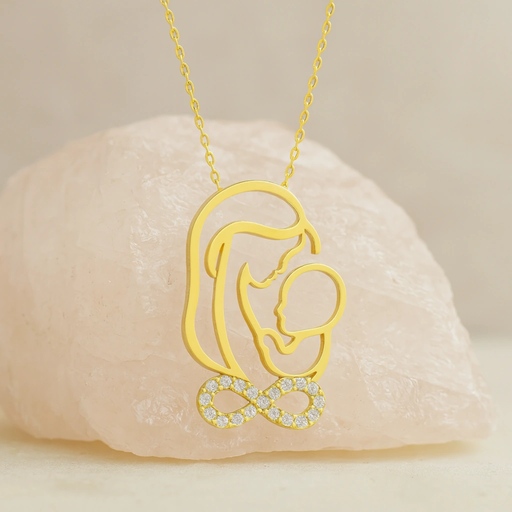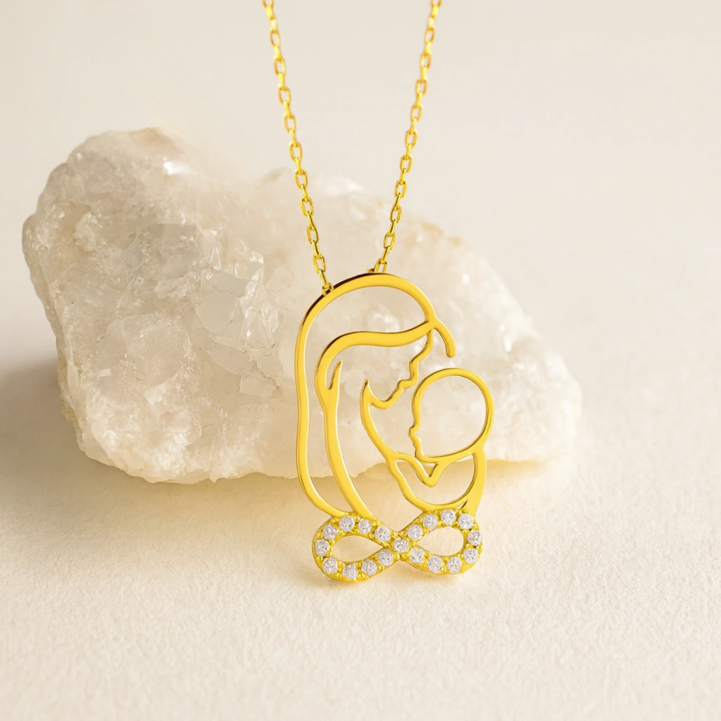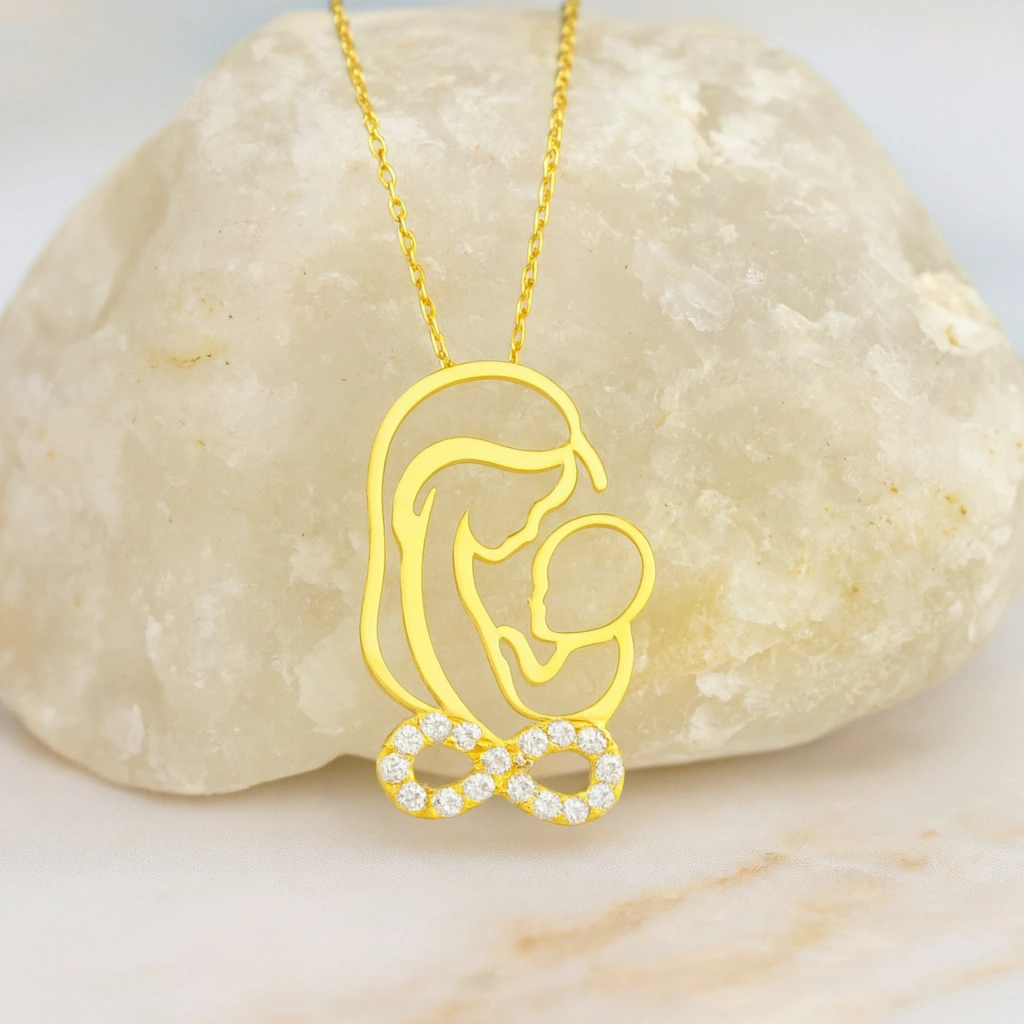 Anne ve bebeğin özel bağını sonsuzluk sembolüyle bir araya getiren bu anne ve bebek sonsuzluk kolye, duygusal anlamı güçlü, zarif ve modern bir tasarımdır. Şefkati, sevgiyi ve yaşamın en değerli bağını temsil eden formu sayesinde hem günlük kullanımda hem de özel anlarda şık bir tamamlayıcı olur. Anlamlı ve kalıcı bir hediye seçeneğidir.