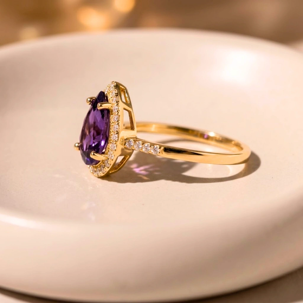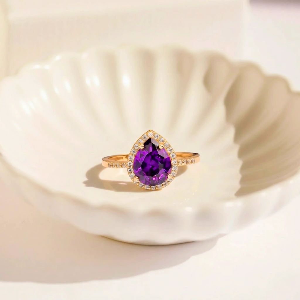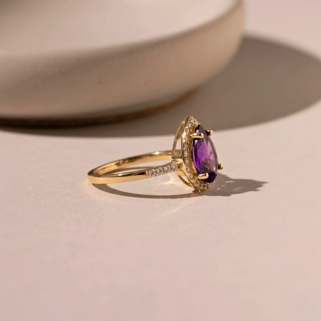Armut kesim ametistin eşsiz mor tonlarını 14 ayar altının zarif dokusuyla bir araya getiren bu özel tasarım, hem romantik hem de modern bir görünüm sunar. Parlak yüzeyi ve dikkat çekici taş detayı sayesinde özel günlerde olduğu kadar günlük şıklıkta da kendini gösteren zarif bir parçadır. Mor taşın ruhu sakinleştiren enerjisi, yüzüğe hem anlam hem de sofistike bir etki katar.