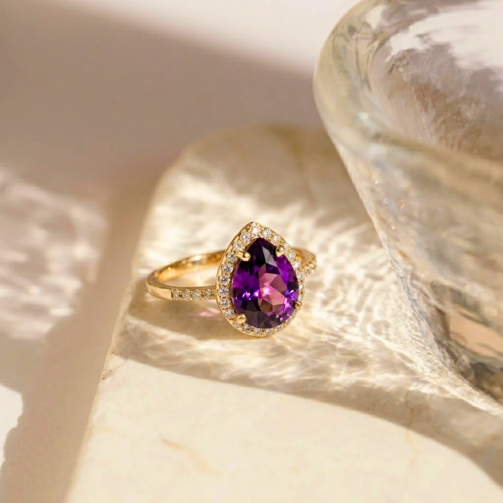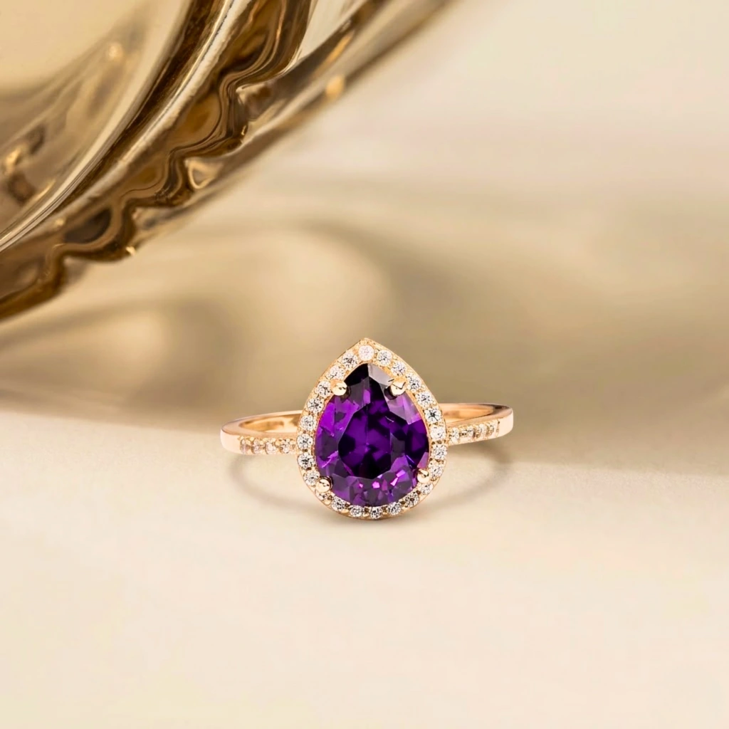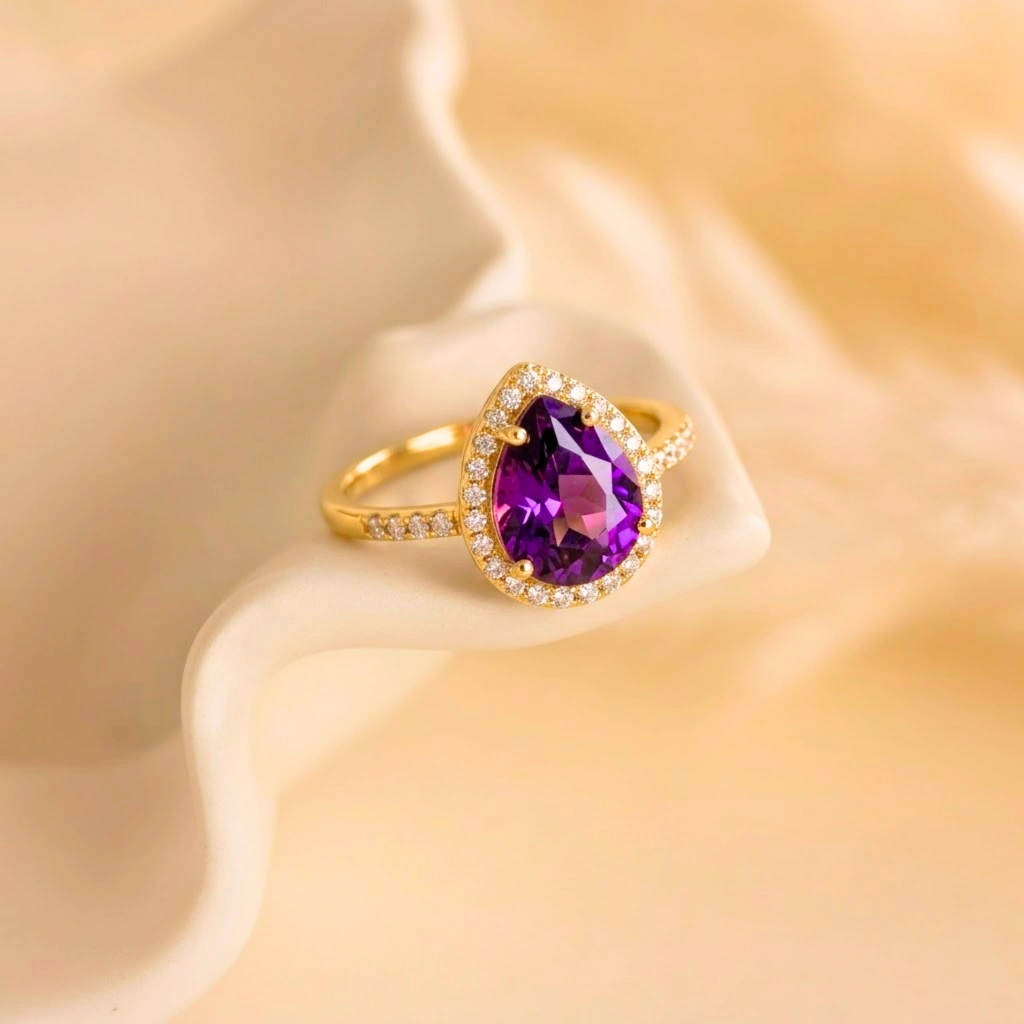 Armut kesim ametistin eşsiz mor tonlarını 14 ayar altının zarif dokusuyla bir araya getiren bu özel tasarım, hem romantik hem de modern bir görünüm sunar. Parlak yüzeyi ve dikkat çekici taş detayı sayesinde özel günlerde olduğu kadar günlük şıklıkta da kendini gösteren zarif bir parçadır. Mor taşın ruhu sakinleştiren enerjisi, yüzüğe hem anlam hem de sofistike bir etki katar.