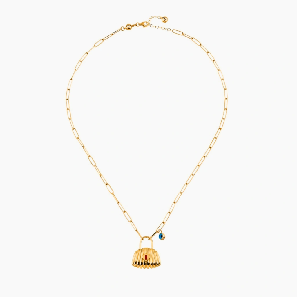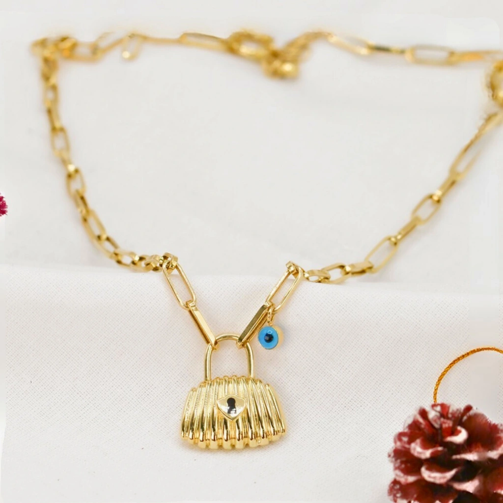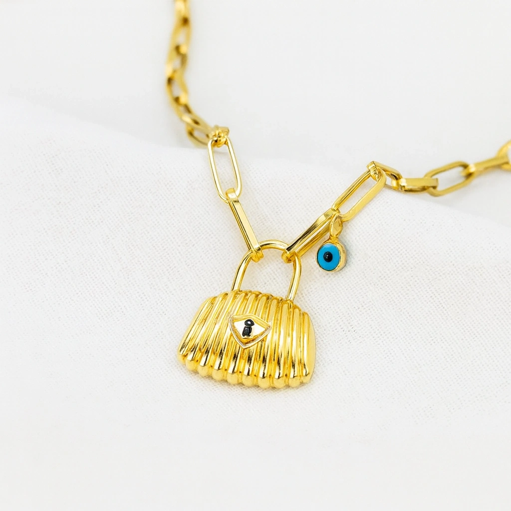 14 ayar altından üretilen bu ataç zincirli nazarlık kilit kolye, modern çizgisi ve güçlü sembolik tasarımıyla öne çıkar. Ataç formundaki zincirin zamansız duruşu, kilit detayının koruyucu nazarlık sembolüyle birleşerek hem şık hem de anlamlı bir görünüm sunar. Günlük stilinize modern bir dokunuş katarken, özel günlerde de göz alıcı bir tamamlayıcıdır.