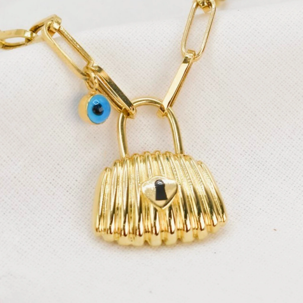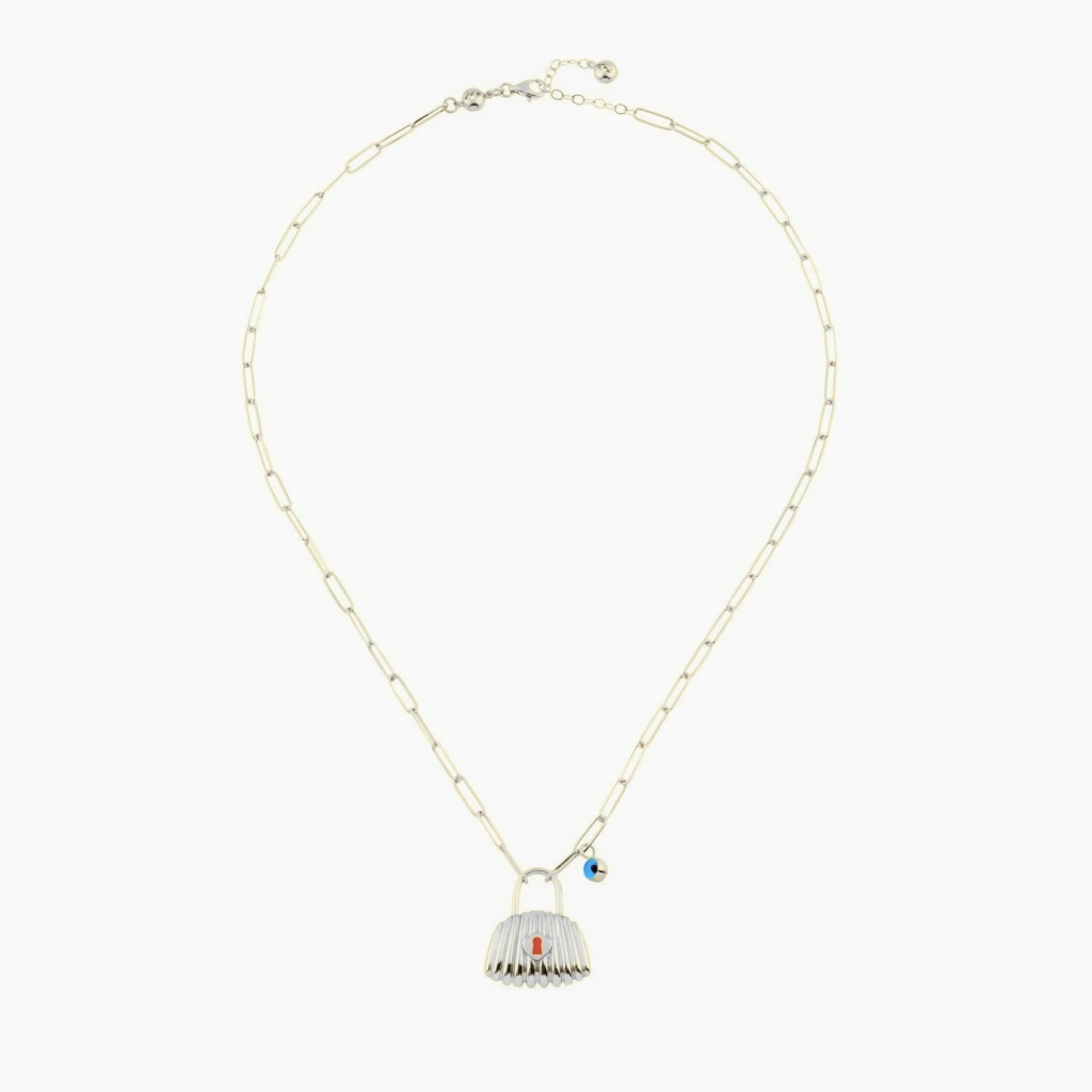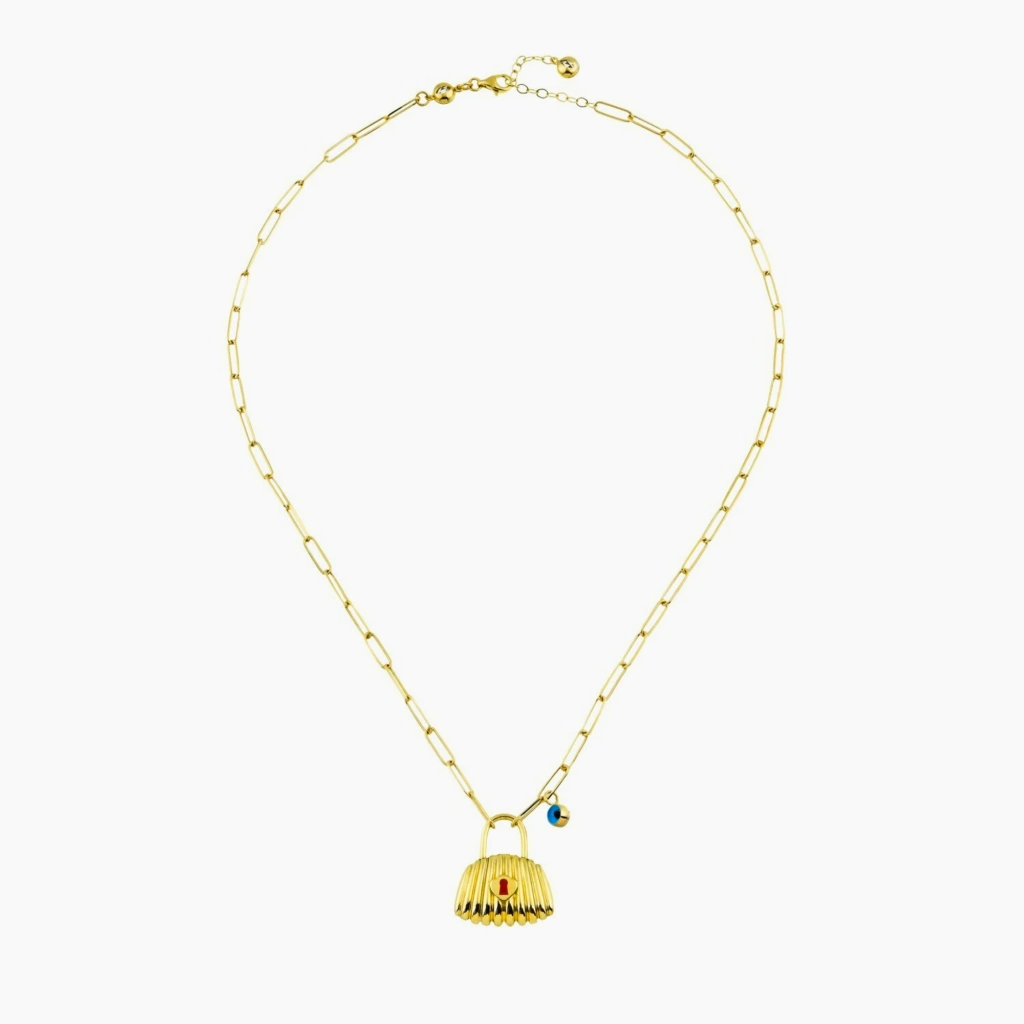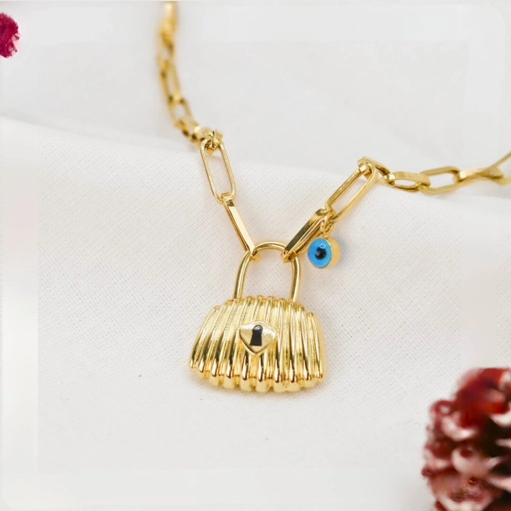14 ayar altından üretilen bu ataç zincirli nazarlık kilit kolye, modern çizgisi ve güçlü sembolik tasarımıyla öne çıkar. Ataç formundaki zincirin zamansız duruşu, kilit detayının koruyucu nazarlık sembolüyle birleşerek hem şık hem de anlamlı bir görünüm sunar. Günlük stilinize modern bir dokunuş katarken, özel günlerde de göz alıcı bir tamamlayıcıdır.