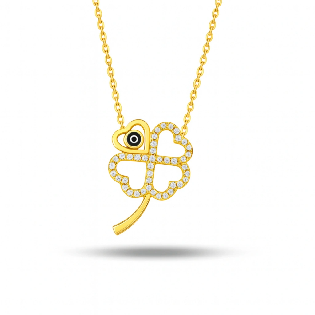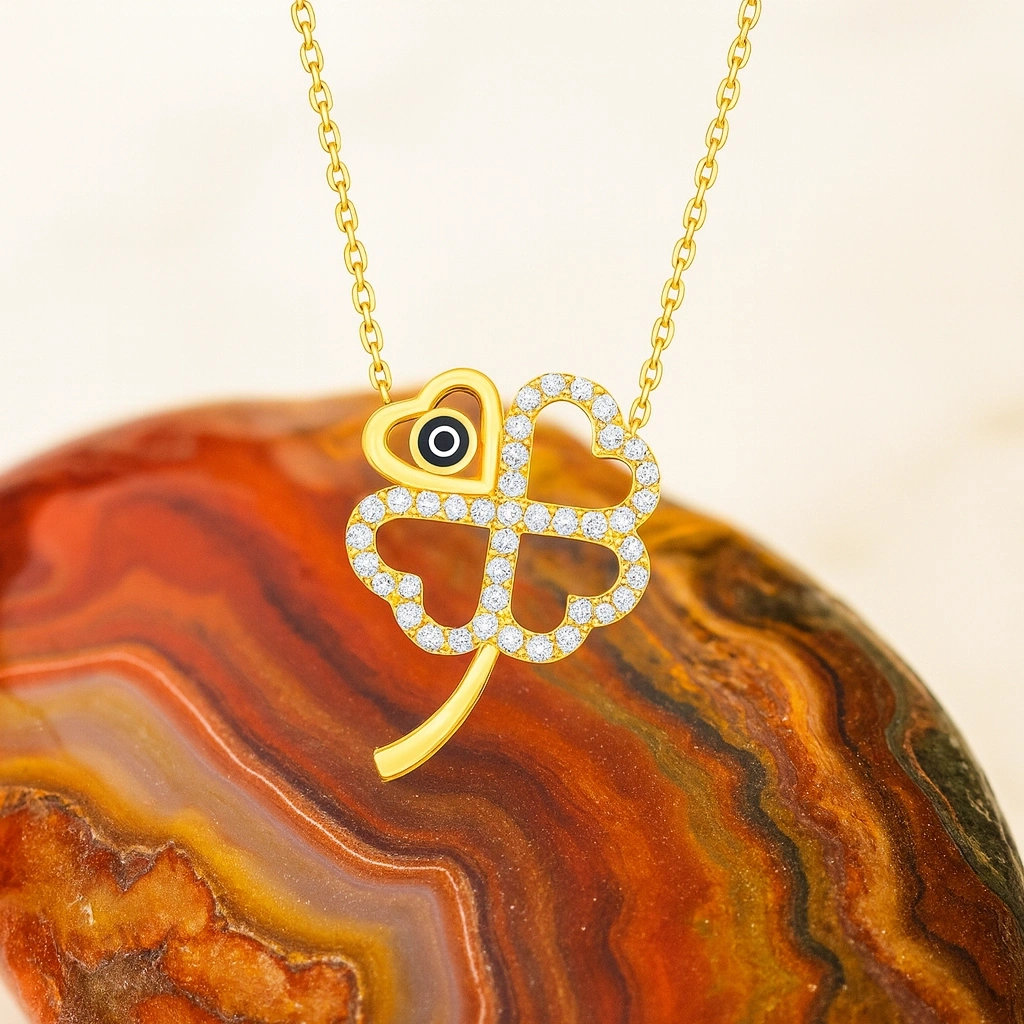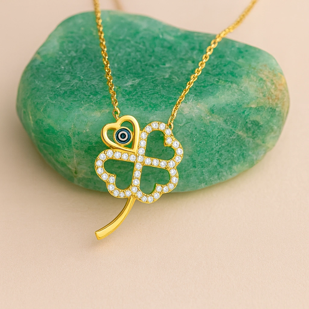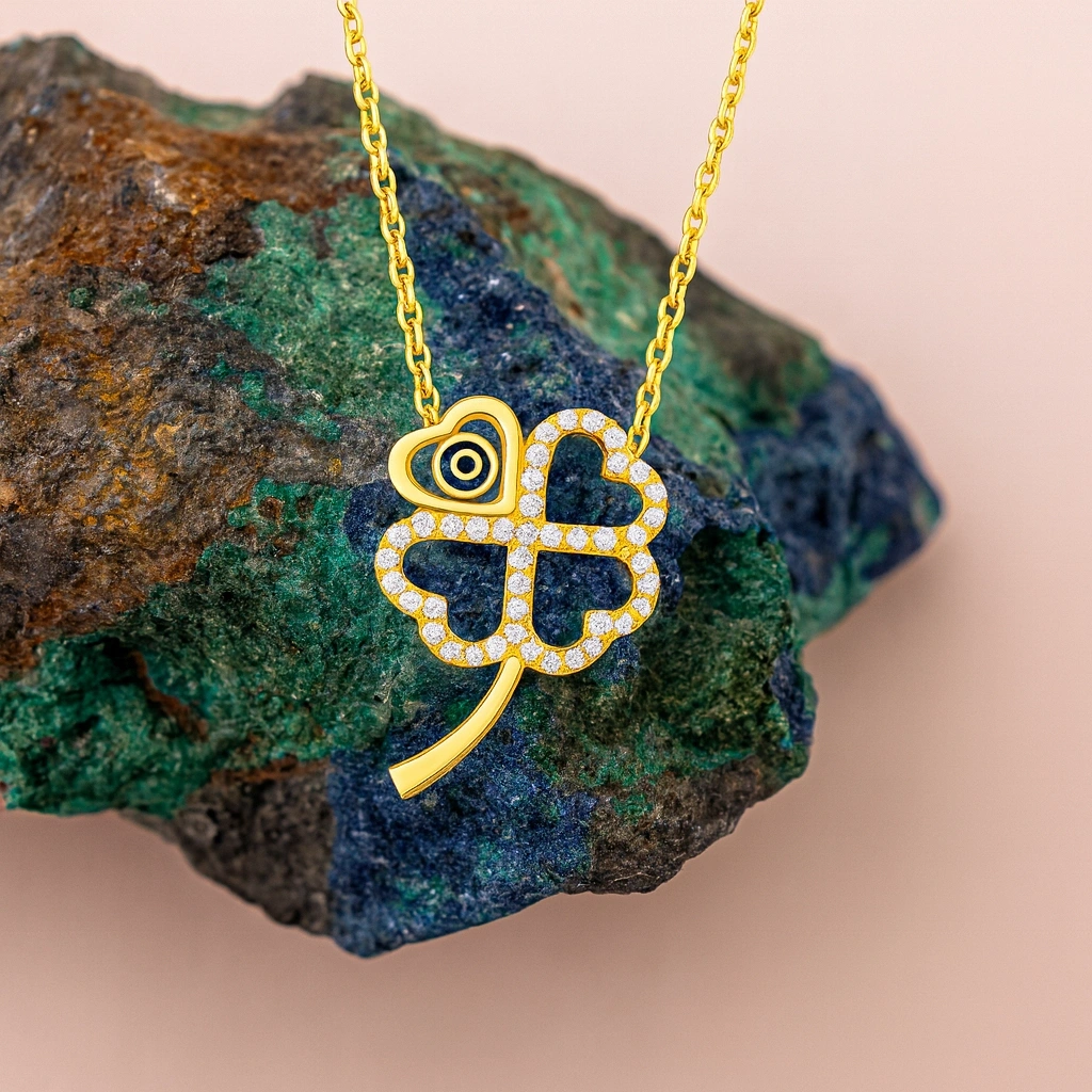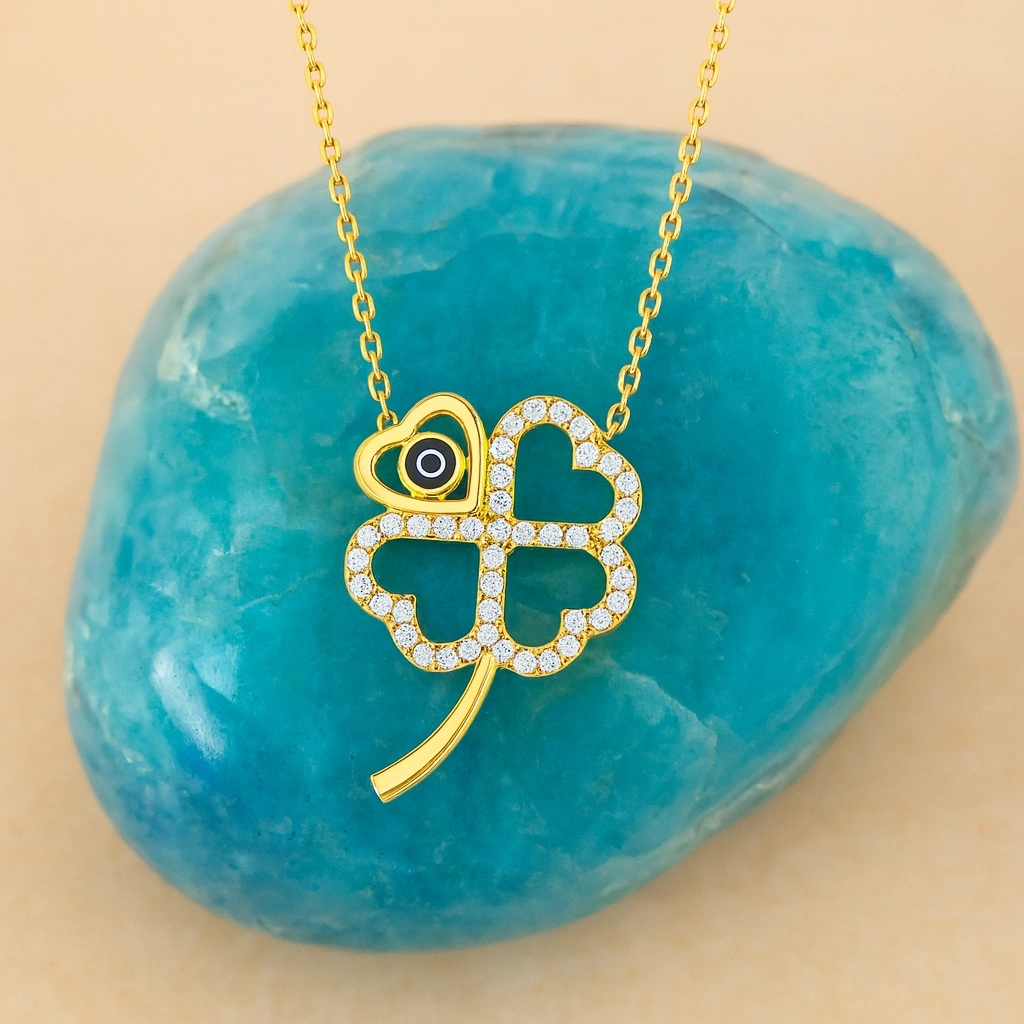 Şans ve koruyucu enerji sembolü olan dört yapraklı yonca figürü, nazar boncuğu detayıyla birleşerek hem estetik hem de anlamlı bir tasarım sunar. Minimalist ve zarif çizgileri sayesinde günlük kullanımda ve özel anlarda stilinize sofistike bir dokunuş ekler. 14 ayar altının parlak yüzeyi tasarımın detaylarını ön plana çıkarır.
