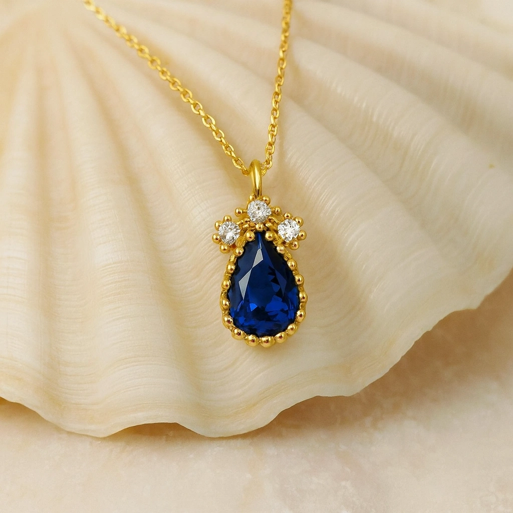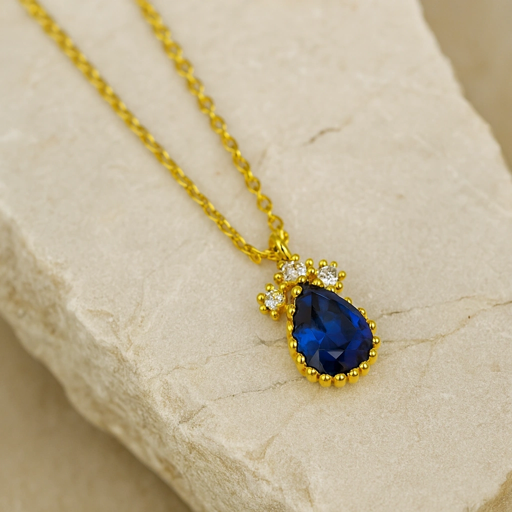 Bu zarif damla tasarım kolye, mavi safirin büyüleyici derinliğiyle birleşerek sofistike ve göz alıcı bir görünüm sunar. Modern minimalizmi klasik zarafetle buluşturan tasarım, günlük şıklığa ve özel anlara anlamlı bir ışıltı katmak için idealdir. 14 ayar altının sıcak tonları, safirin etkileyici mavi yansımasını mükemmel şekilde tamamlar.