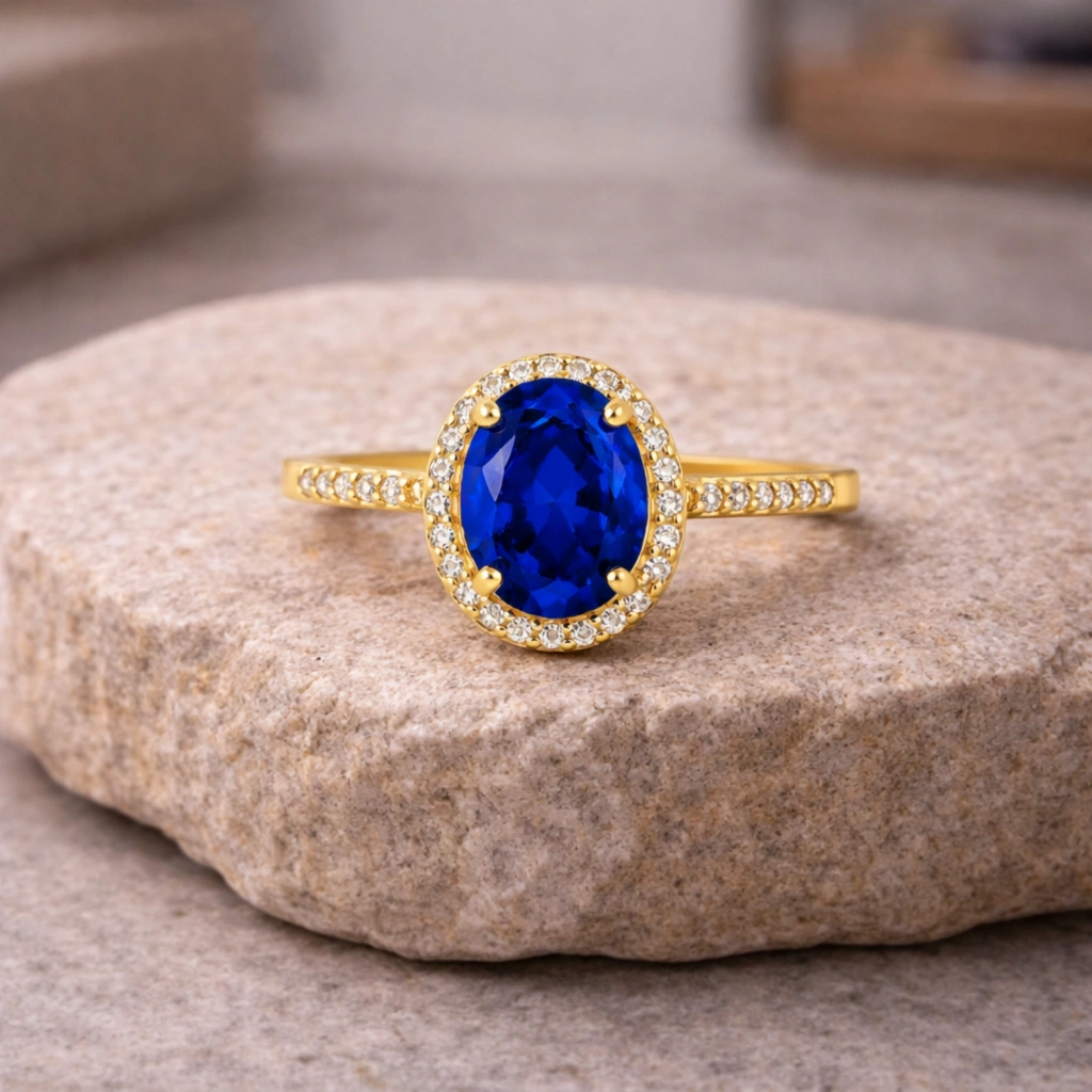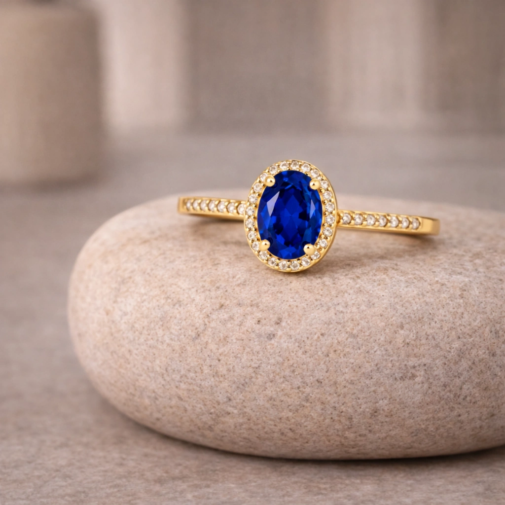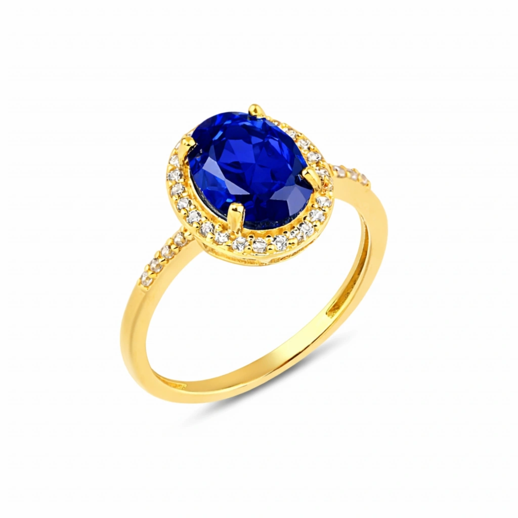 Oval kesim mavi safirin zarif ve asil görünümünü sade altın form ile buluşturan bu yüzük, klasik ve zamansız bir estetik sunar.