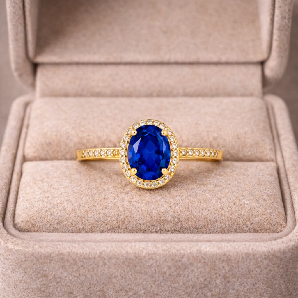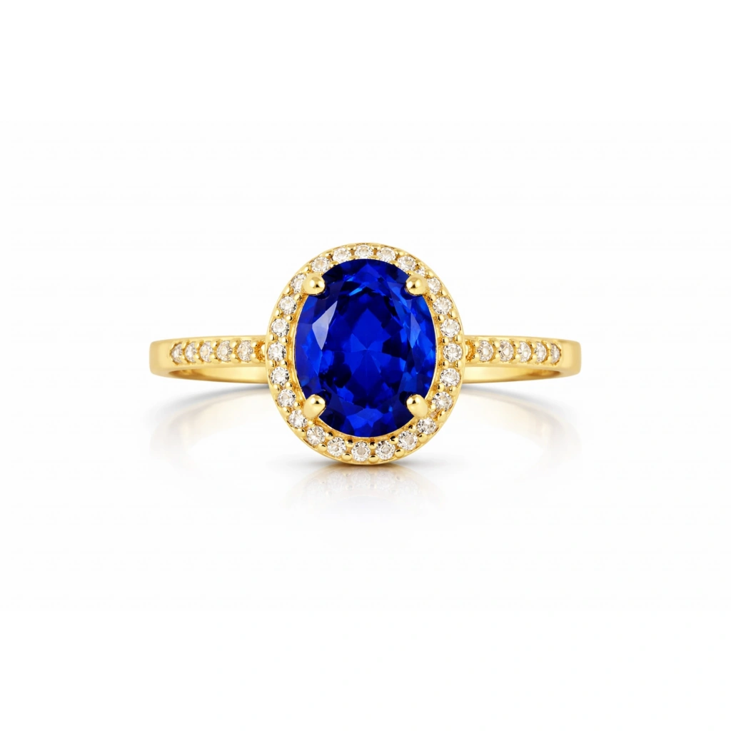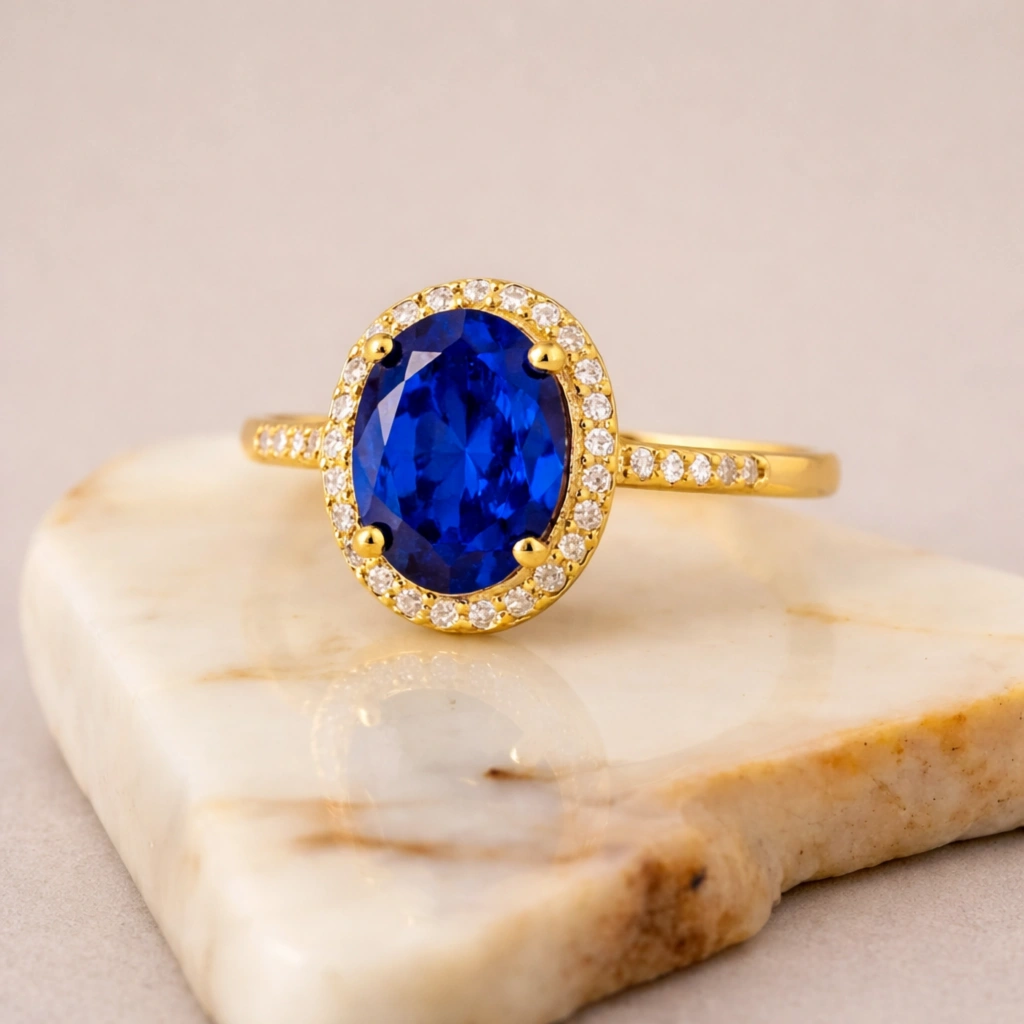Oval kesim mavi safirin zarif ve asil görünümünü sade altın form ile buluşturan bu yüzük, klasik ve zamansız bir estetik sunar.