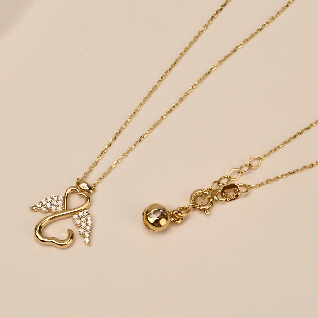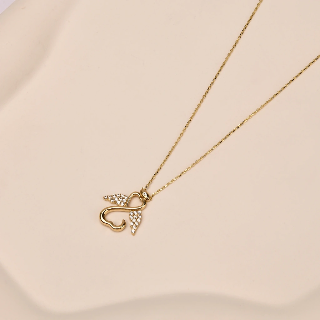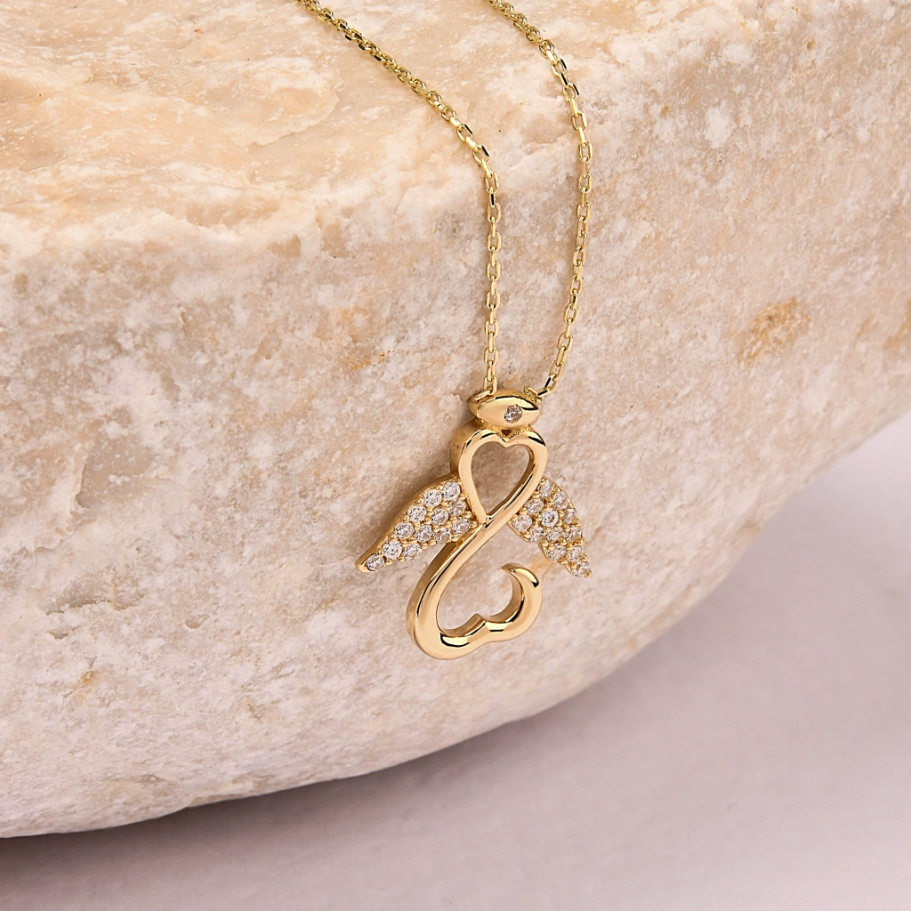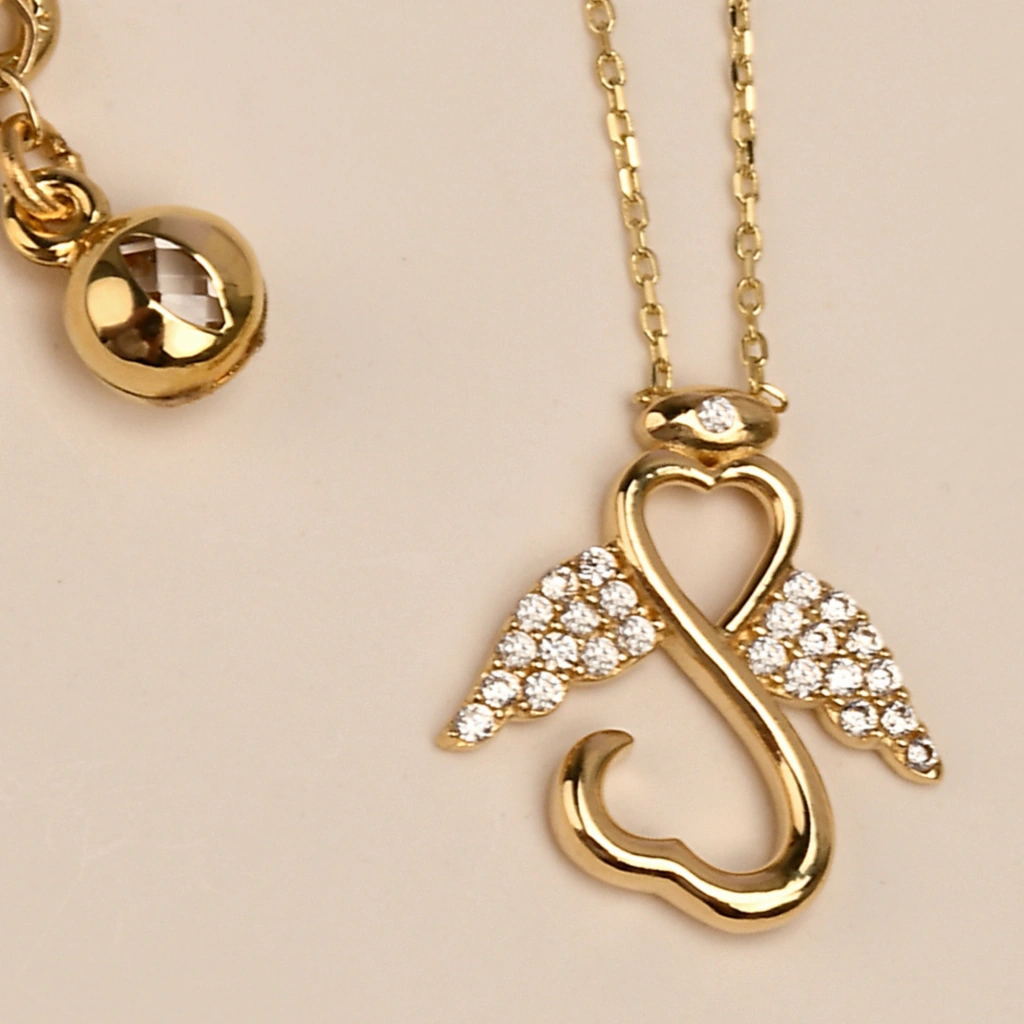 Şans ve koruyucu enerji sembolü olan melek figürü, zarif detaylarla tasarlanmış bu kolyede hayat buluyor. 14 ayar altının parlak yüzeyi ile birleşen tasarım, hem günlük kullanımda hem de özel anlarda şıklığınızı tamamlayan anlamlı bir aksesuardır. Minimal ve sofistike çizgileri ile stilinize zarafet katıyor.