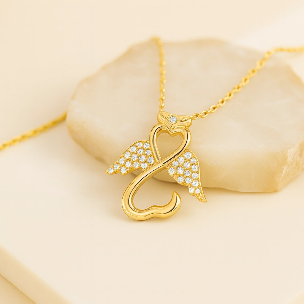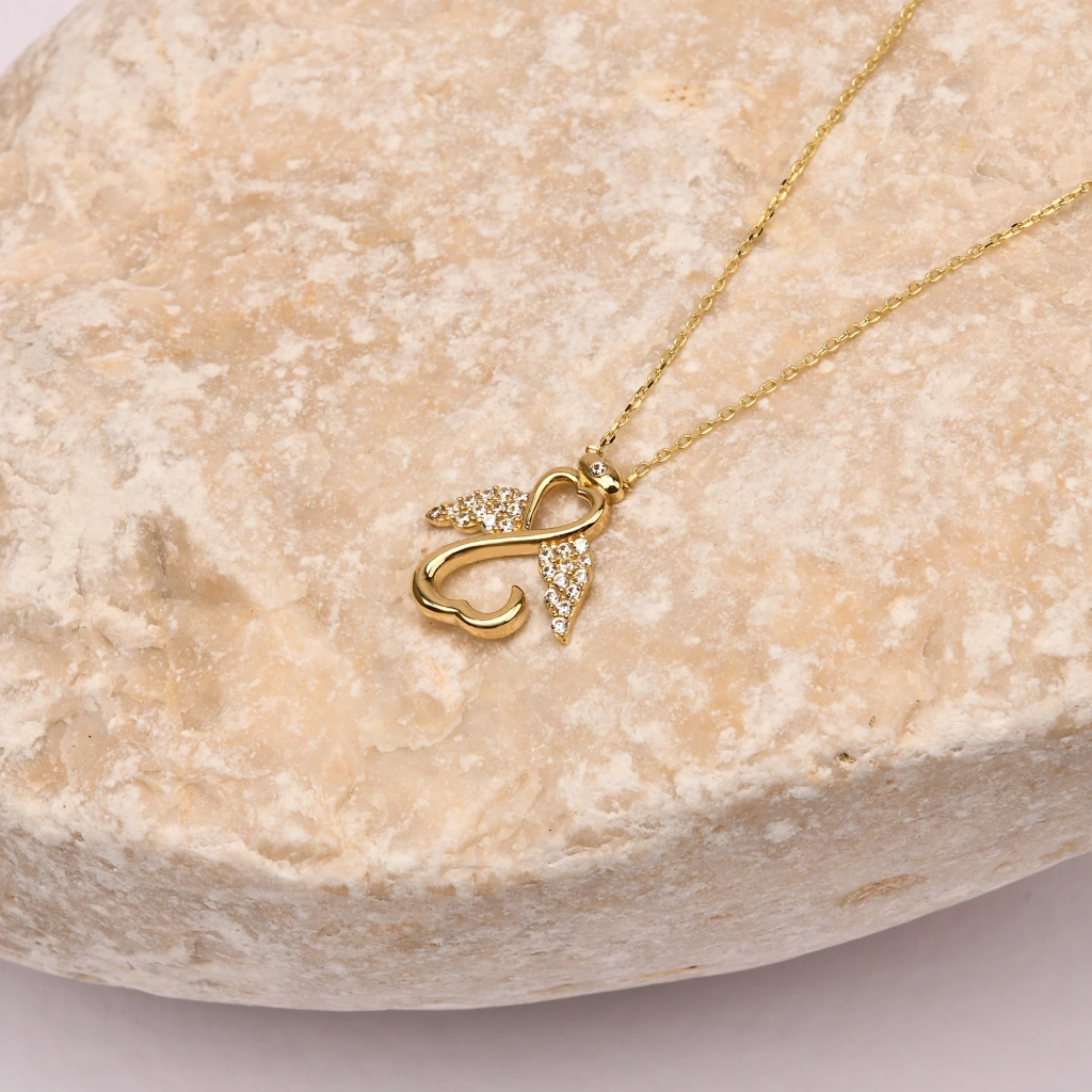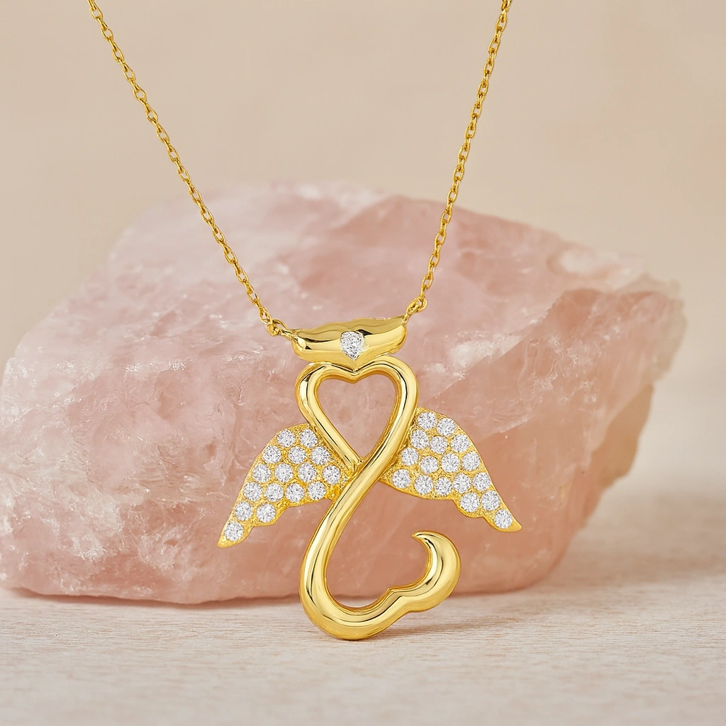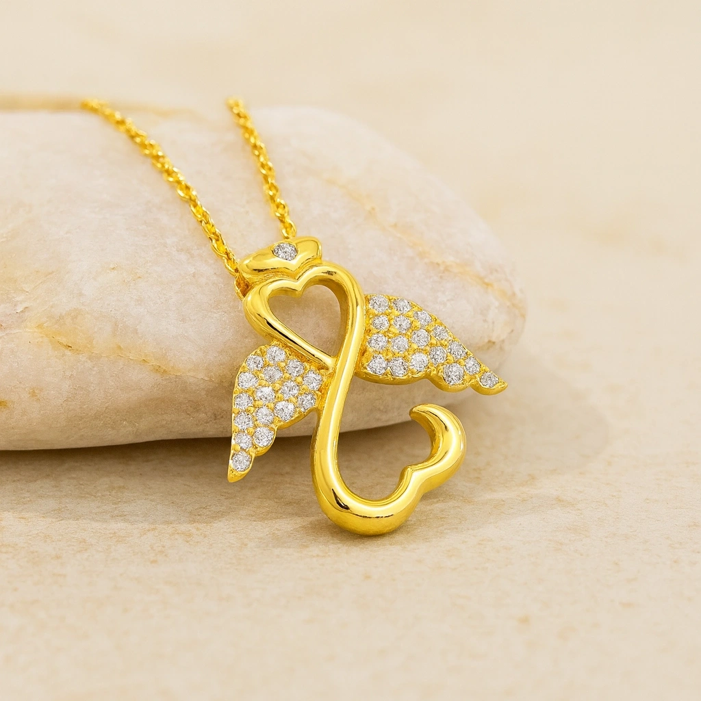 Şans ve koruyucu enerji sembolü olan melek figürü, zarif detaylarla tasarlanmış bu kolyede hayat buluyor. 14 ayar altının parlak yüzeyi ile birleşen tasarım, hem günlük kullanımda hem de özel anlarda şıklığınızı tamamlayan anlamlı bir aksesuardır. Minimal ve sofistike çizgileri ile stilinize zarafet katıyor.