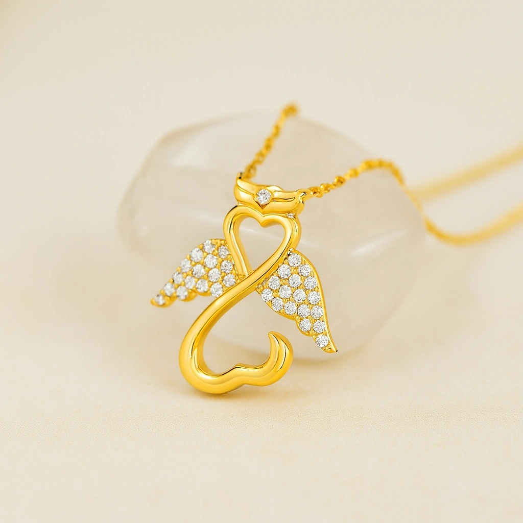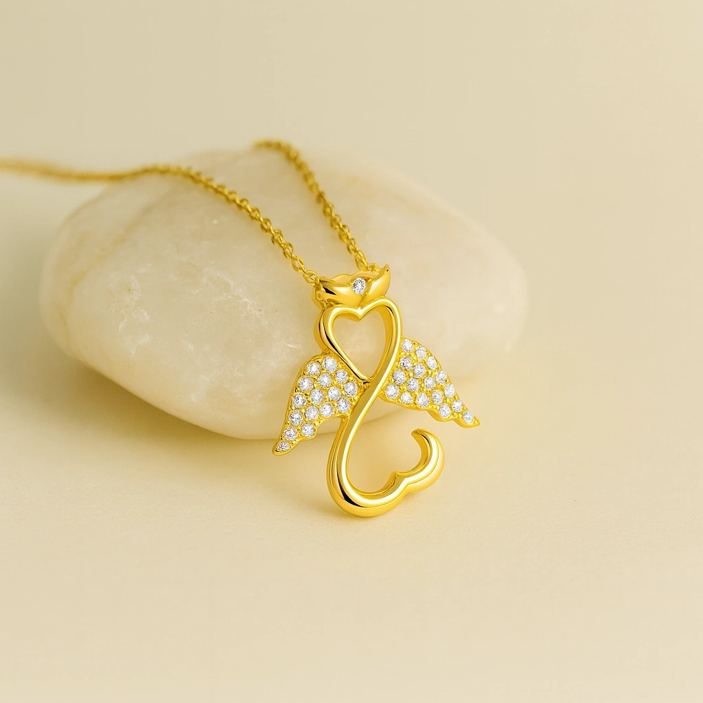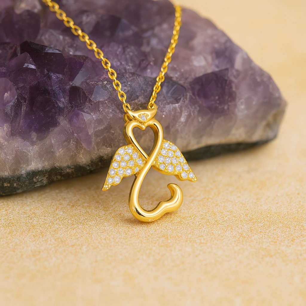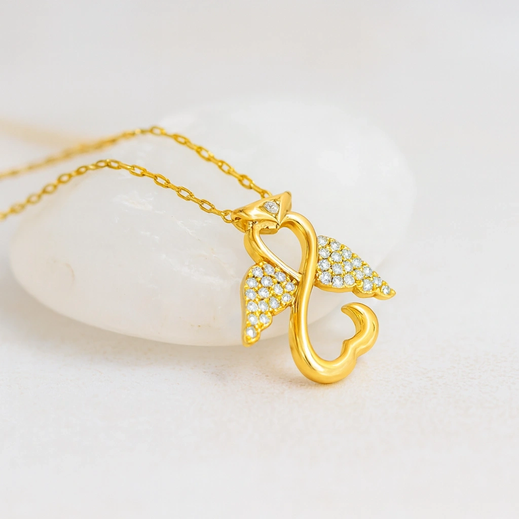 Şans ve koruyucu enerji sembolü olan melek figürü, zarif detaylarla tasarlanmış bu kolyede hayat buluyor. 14 ayar altının parlak yüzeyi ile birleşen tasarım, hem günlük kullanımda hem de özel anlarda şıklığınızı tamamlayan anlamlı bir aksesuardır. Minimal ve sofistike çizgileri ile stilinize zarafet katıyor.