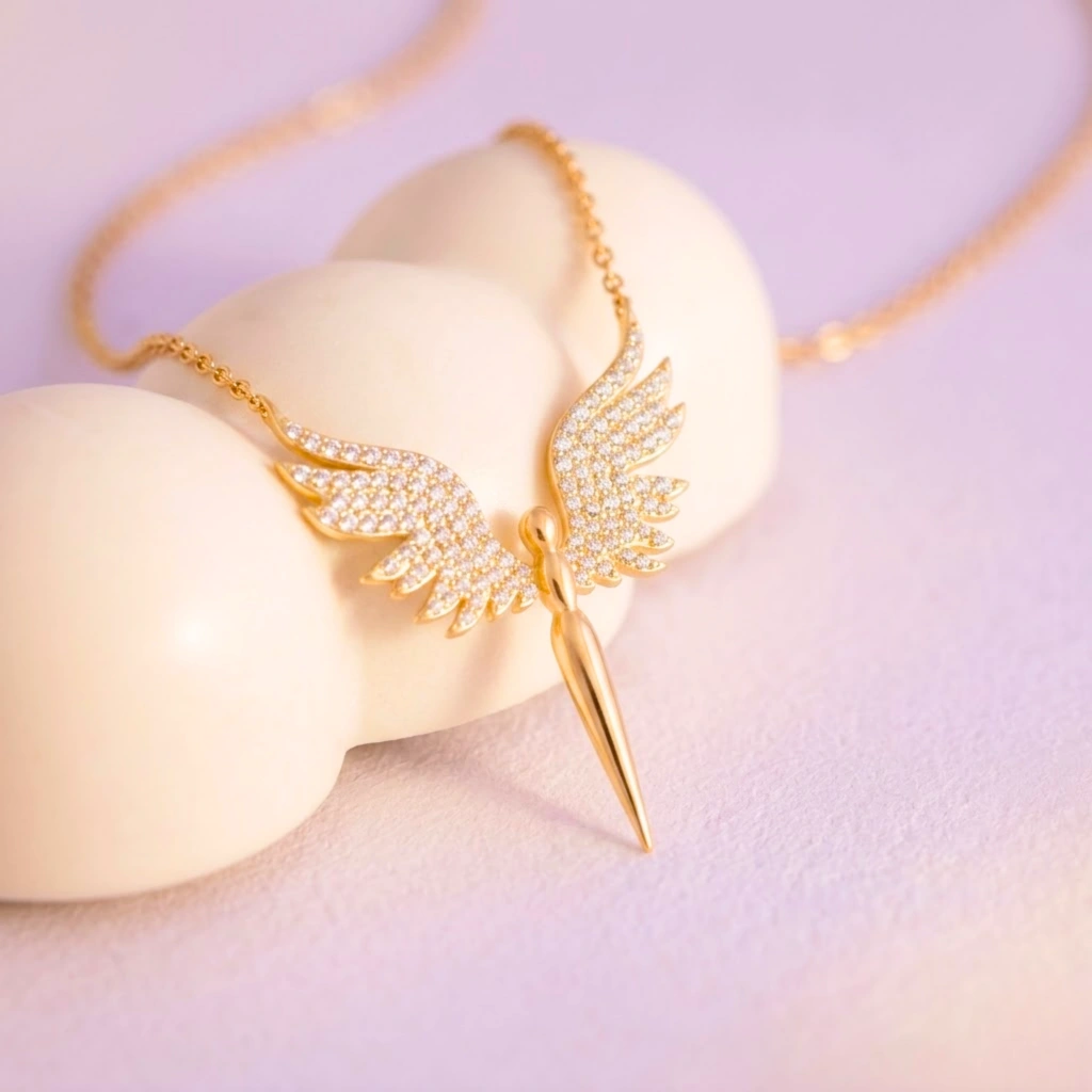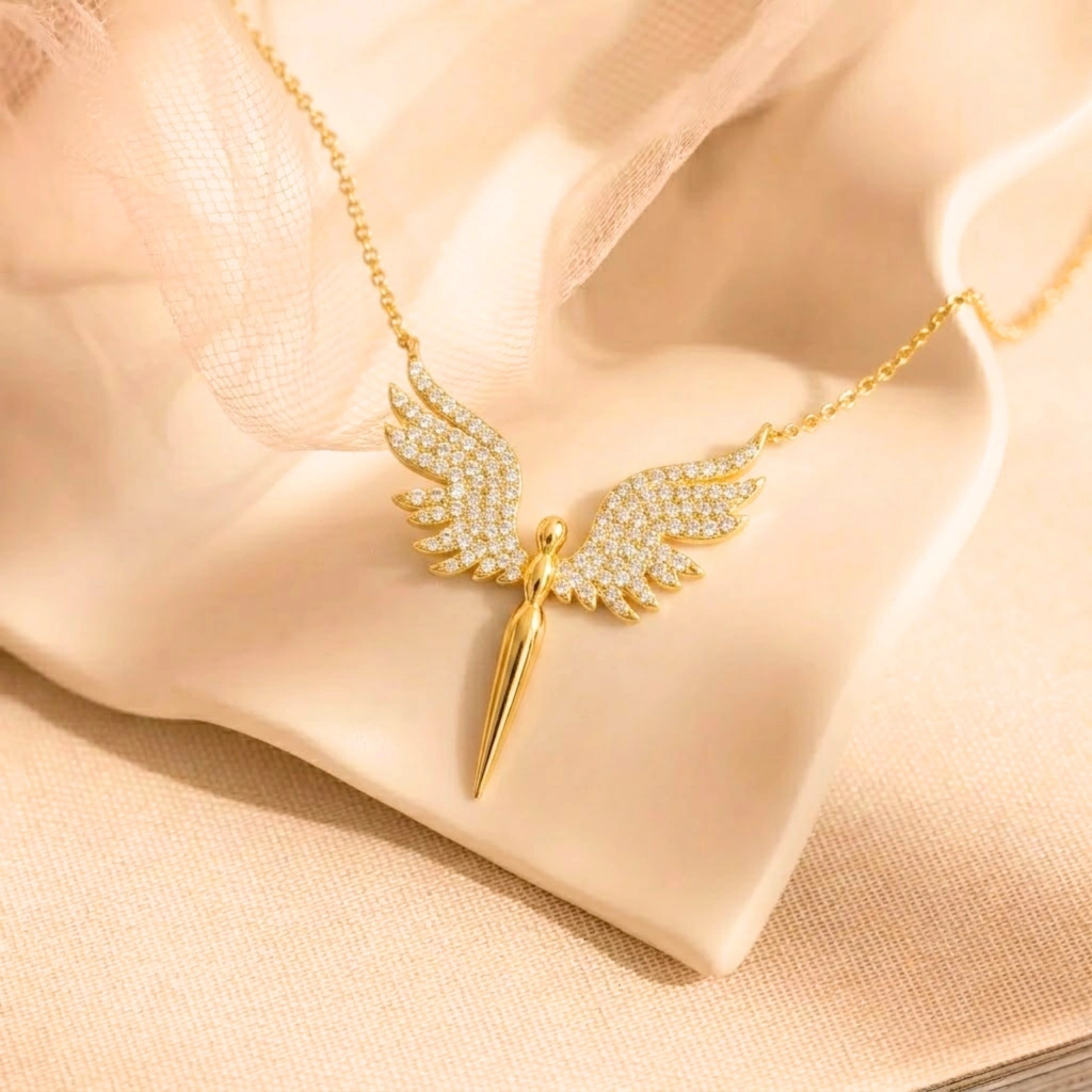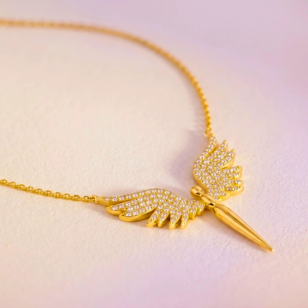 Bu zarif melek kolye, maneviyatı ve içsel gücü temsil eder. Özenle işlenmiş kanatlar ve hafif ışıltısıyla stilinize şıklık katarken derin anlam taşır. Günlük kullanım için uygundur ve size veya sevdiklerinize her zaman koruma ve rehberliğin yakın olduğunu hatırlatır.