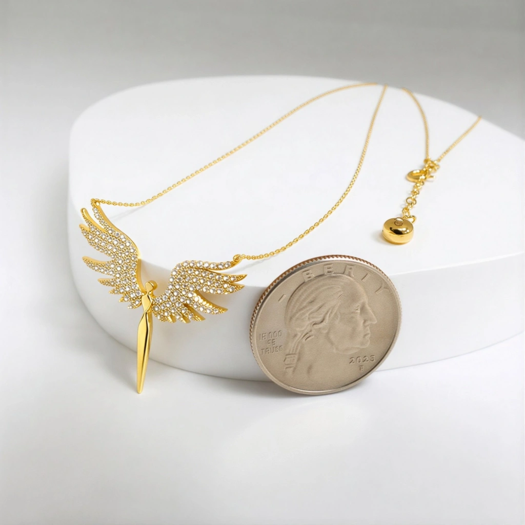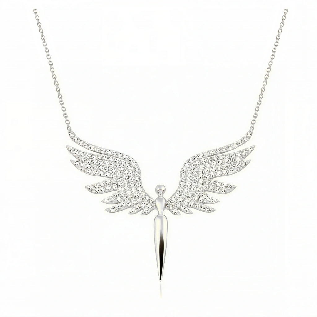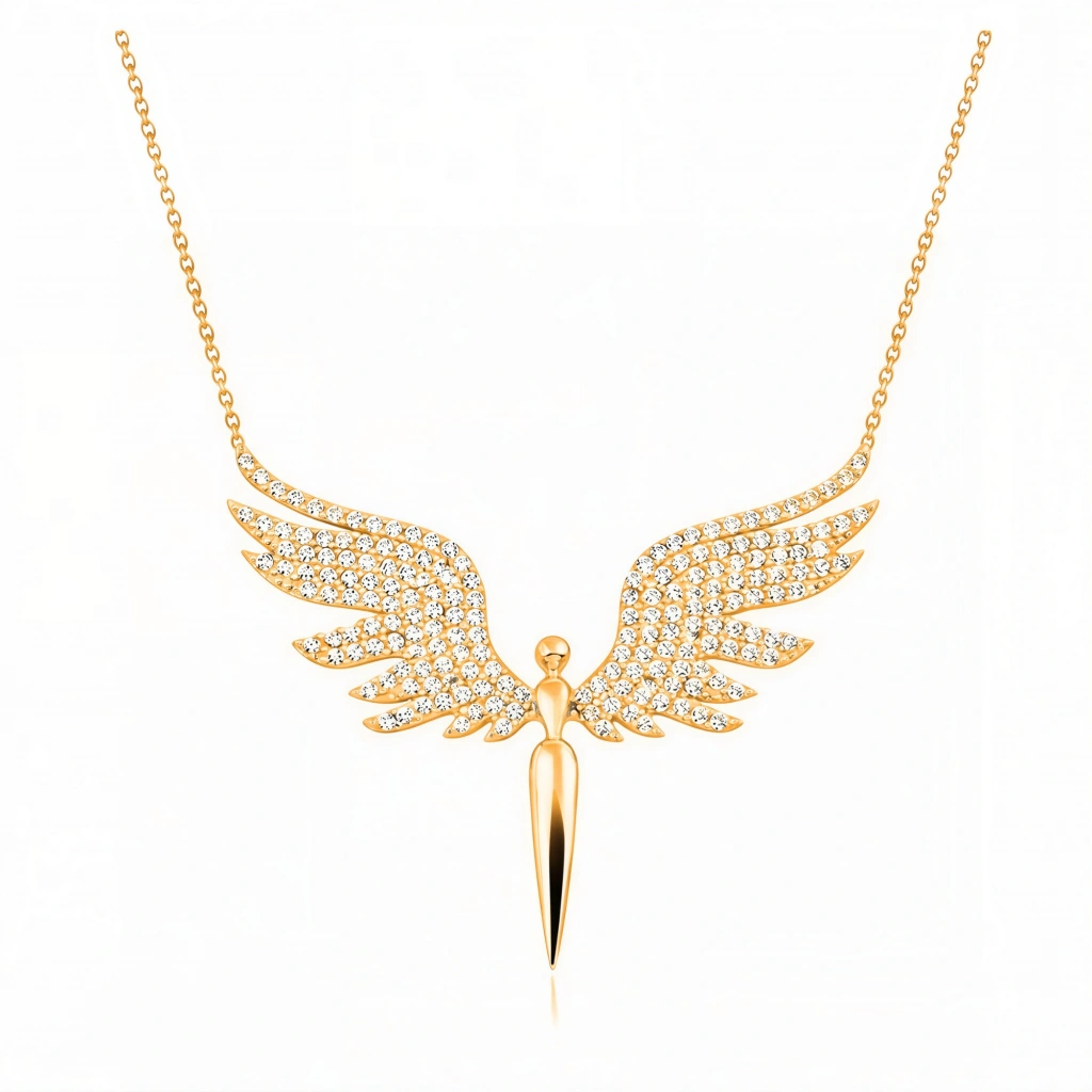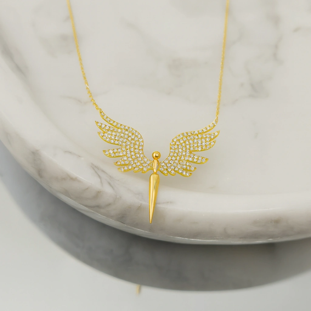 Bu zarif melek kolye, maneviyatı ve içsel gücü temsil eder. Özenle işlenmiş kanatlar ve hafif ışıltısıyla stilinize şıklık katarken derin anlam taşır. Günlük kullanım için uygundur ve size veya sevdiklerinize her zaman koruma ve rehberliğin yakın olduğunu hatırlatır.