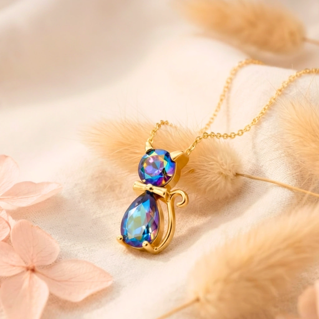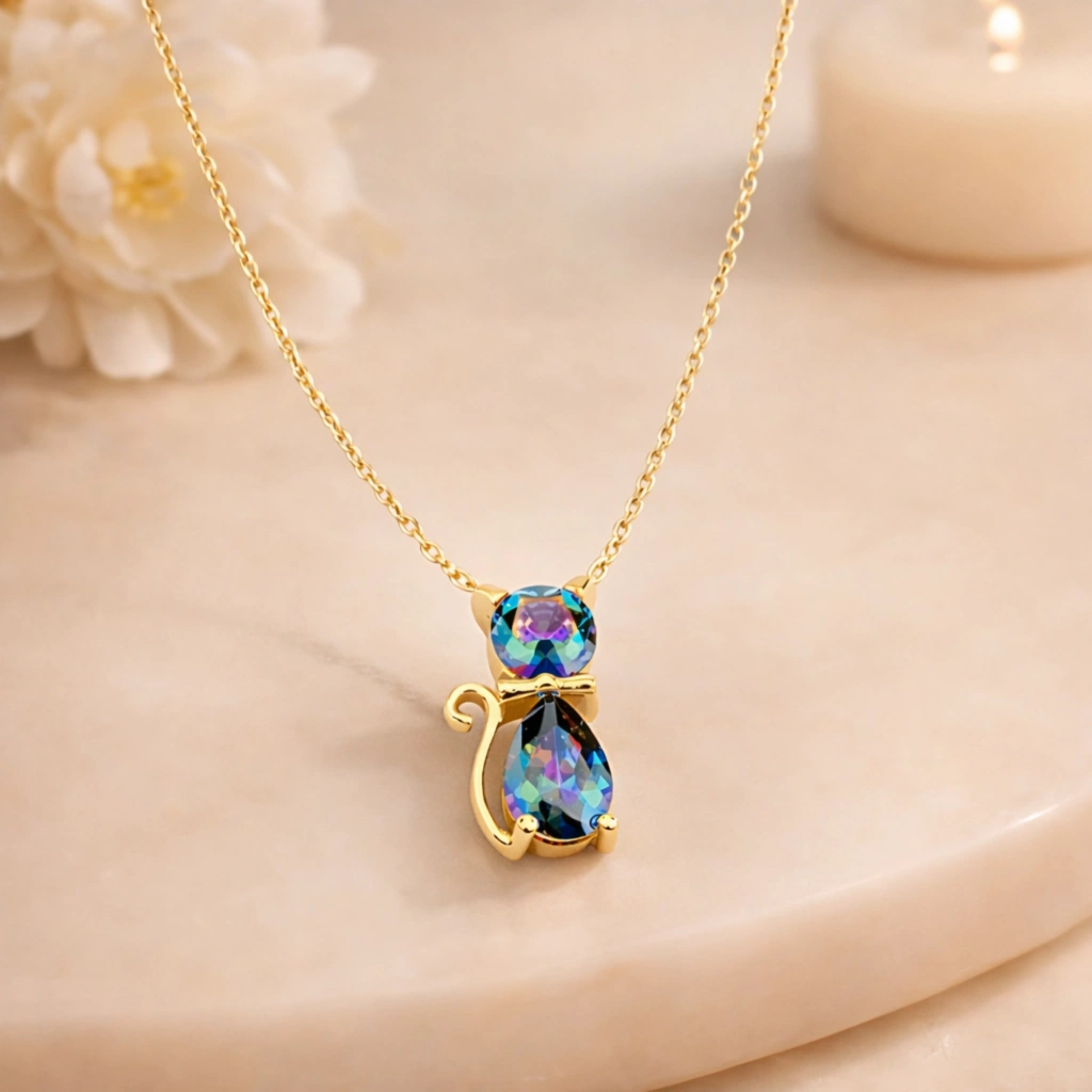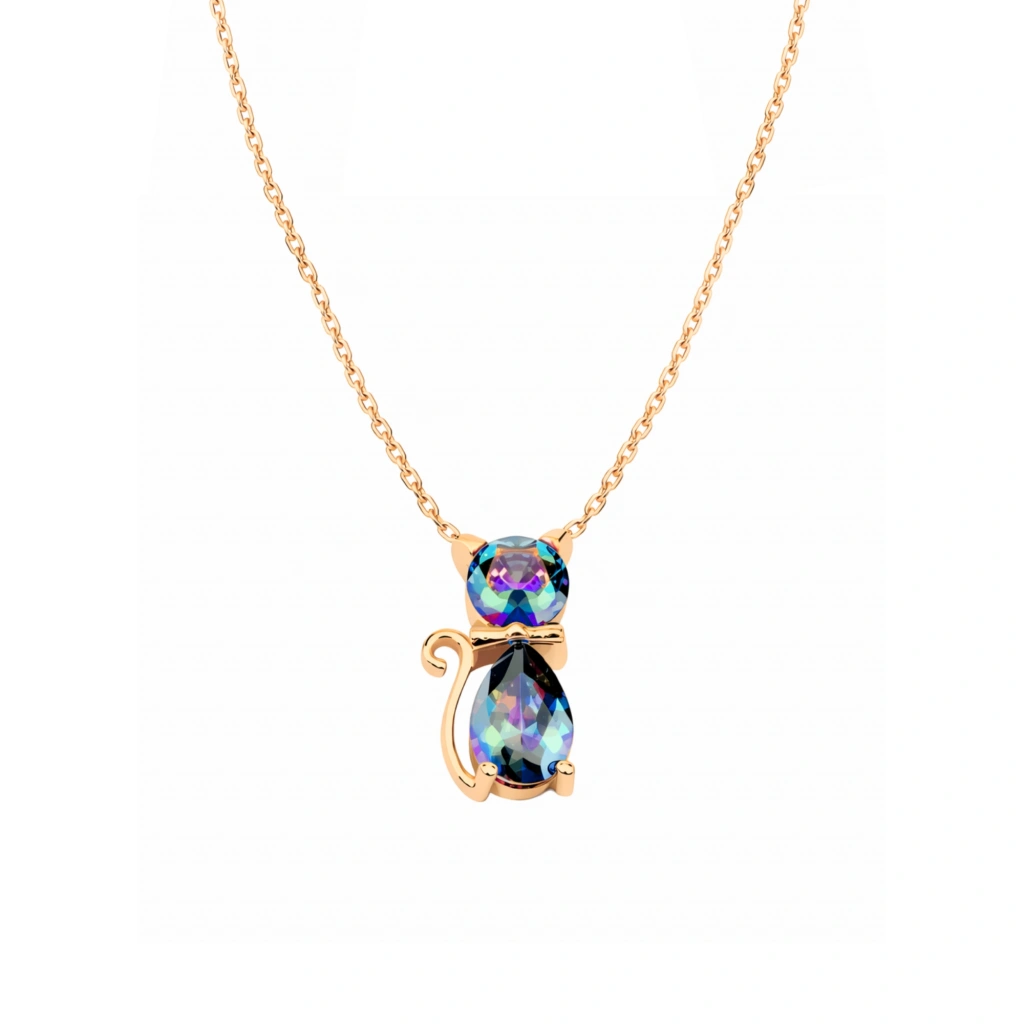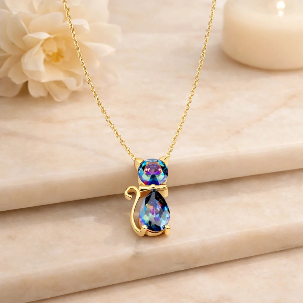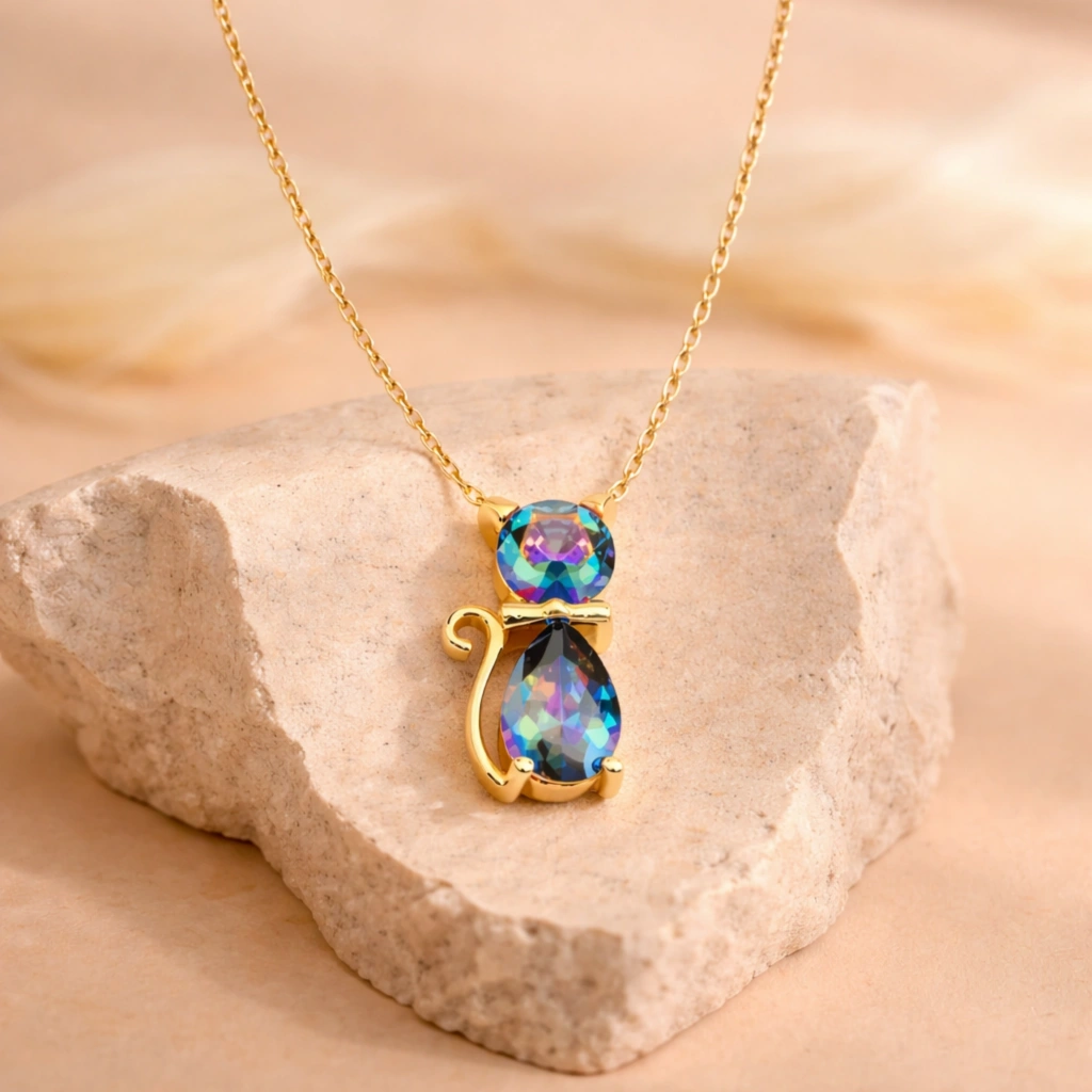 Kedi formunun zarif ve sevimli siluetini mistik topaz taşın renk geçişli ışıltısıyla buluşturan bu kolye, özgün ve dikkat çekici bir stil sunar.