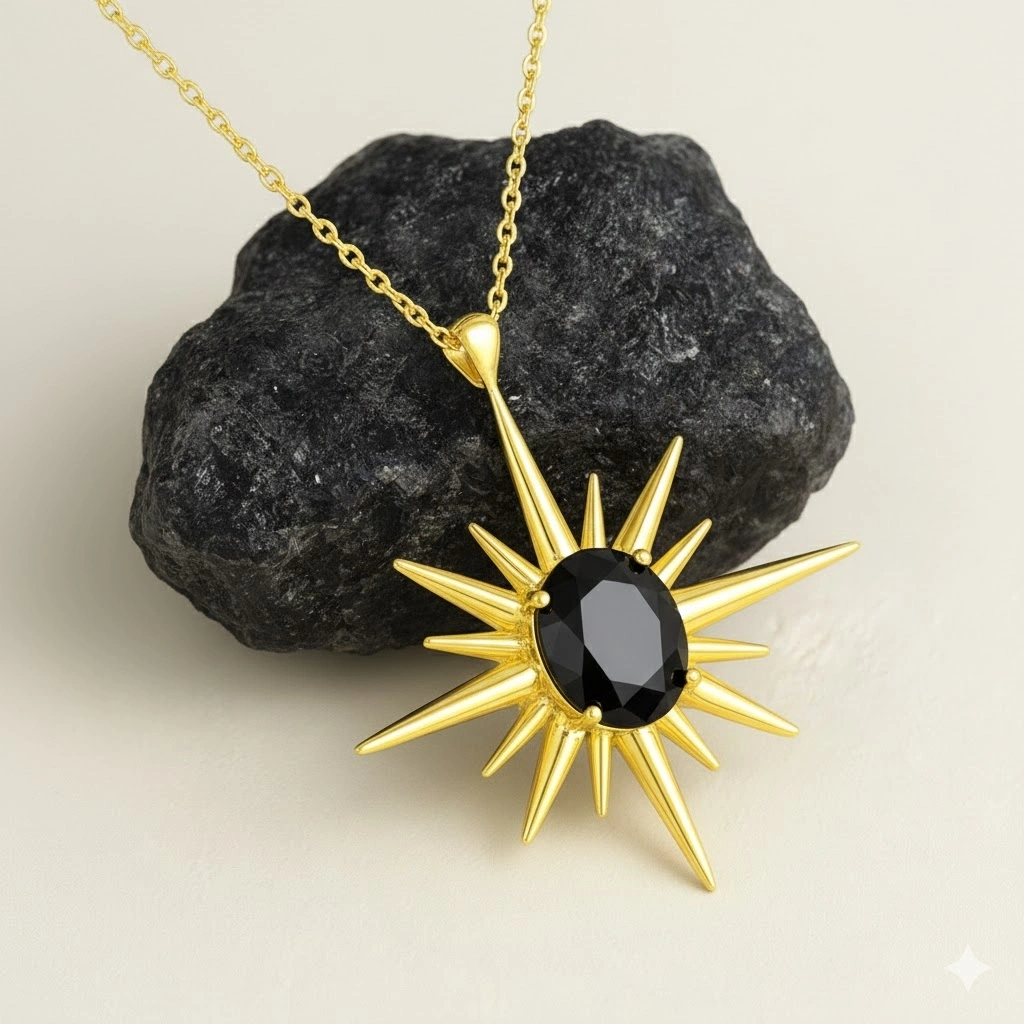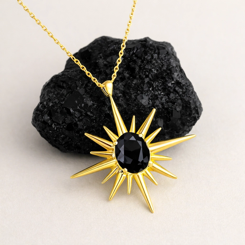 Derin siyah tonlara sahip oniks taşı ile altının sıcak rengi arasında oluşan kontrast, kolyeye güçlü ve sofistike bir karakter kazandırır.