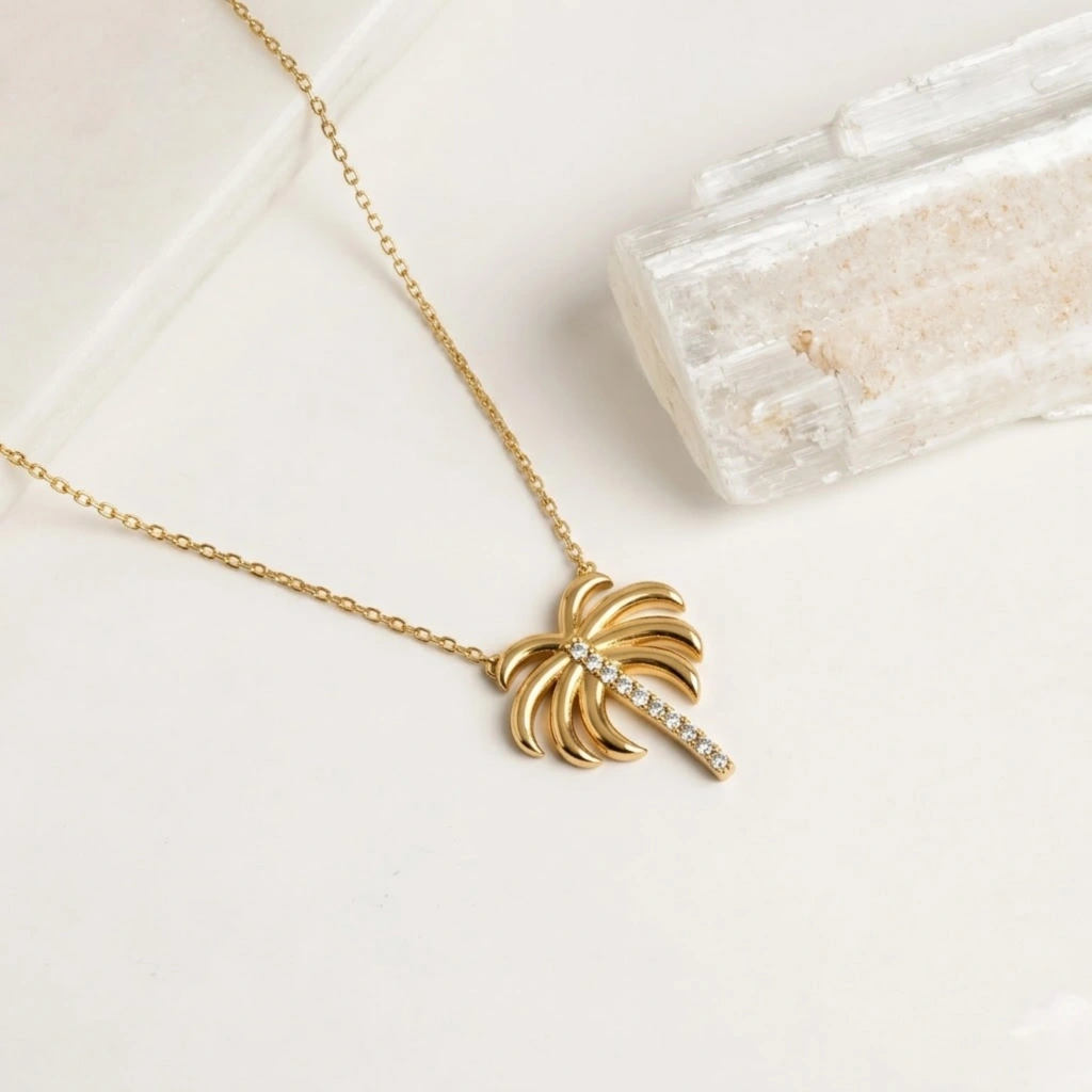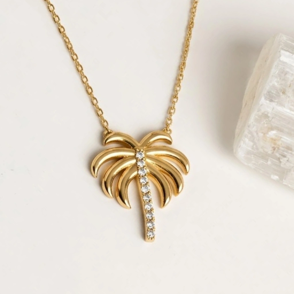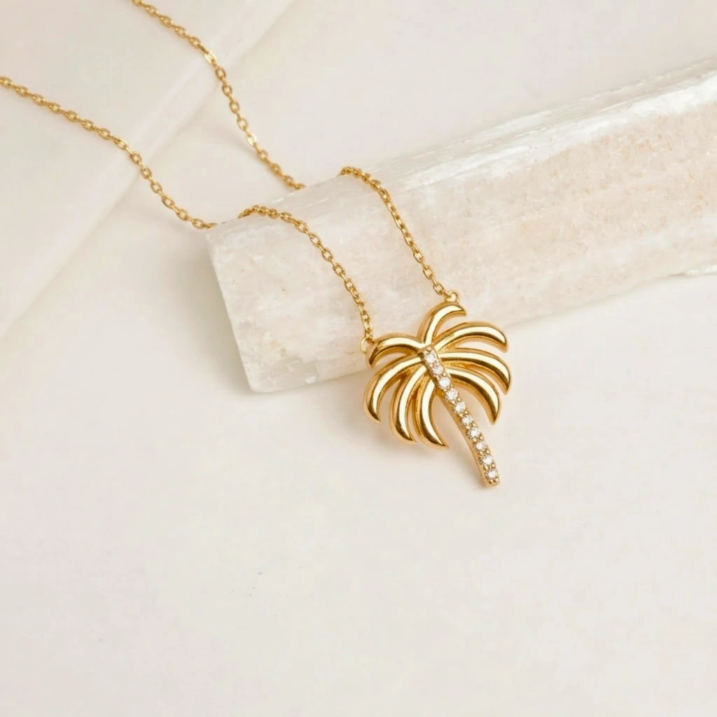 Bu zarif palmiye kolye, modern minimalizmi tropikal bir dokunuşla buluşturur. İnce palmiye ağacı formu ve sade altın tasarımıyla günlük kullanım, yaz kombinleri veya anlamlı hediyeler için mükemmel bir tercihtir. Her anı özgürlük, huzur ve zarafetle tamamlayan özel bir tasarımdır.