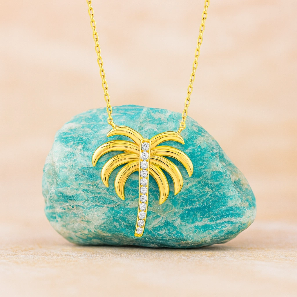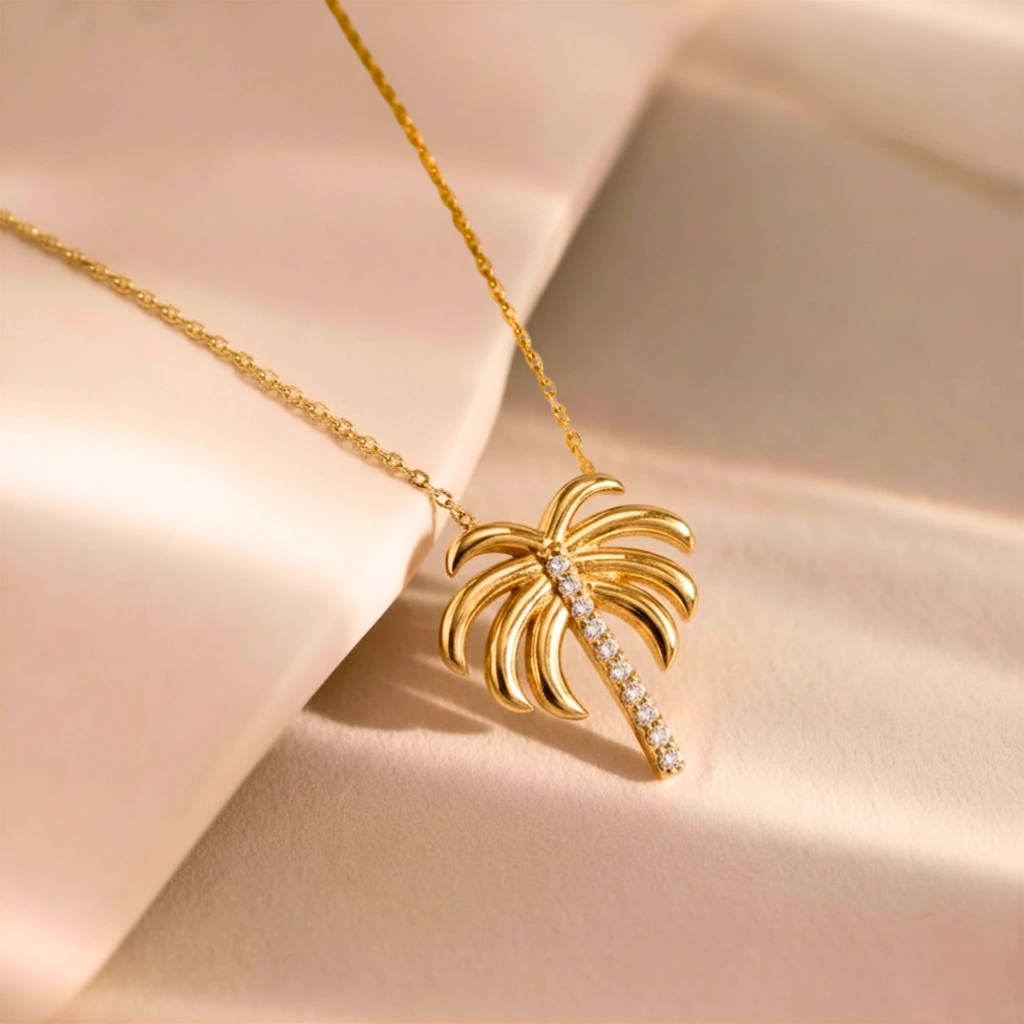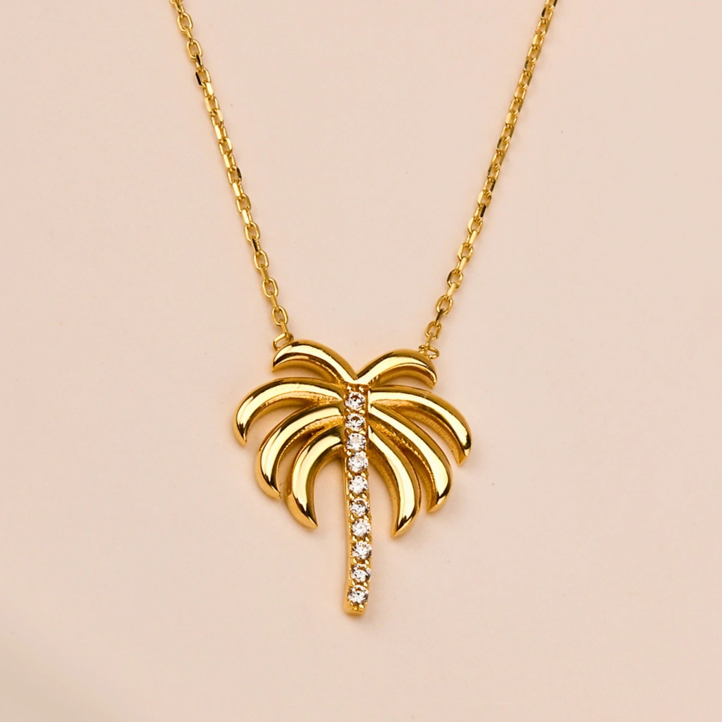 Bu zarif palmiye kolye, modern minimalizmi tropikal bir dokunuşla buluşturur. İnce palmiye ağacı formu ve sade altın tasarımıyla günlük kullanım, yaz kombinleri veya anlamlı hediyeler için mükemmel bir tercihtir. Her anı özgürlük, huzur ve zarafetle tamamlayan özel bir tasarımdır.