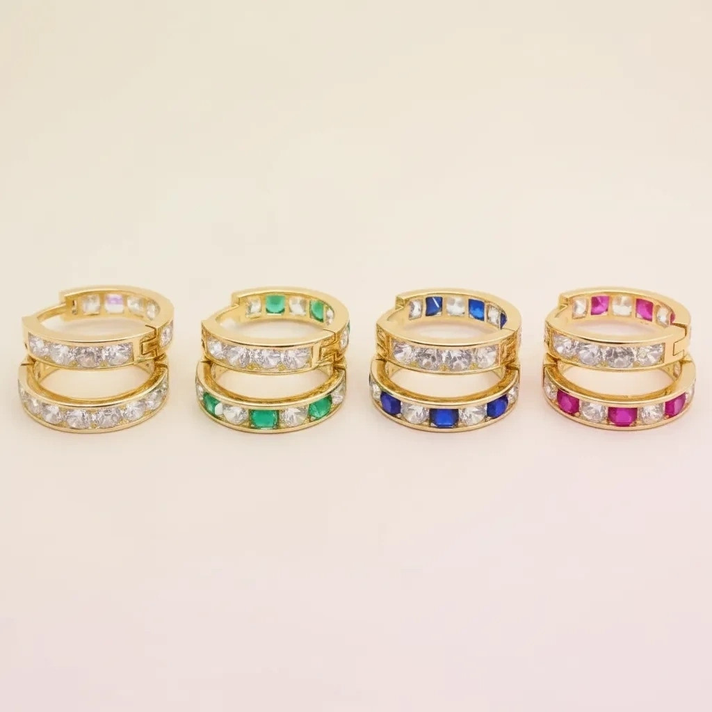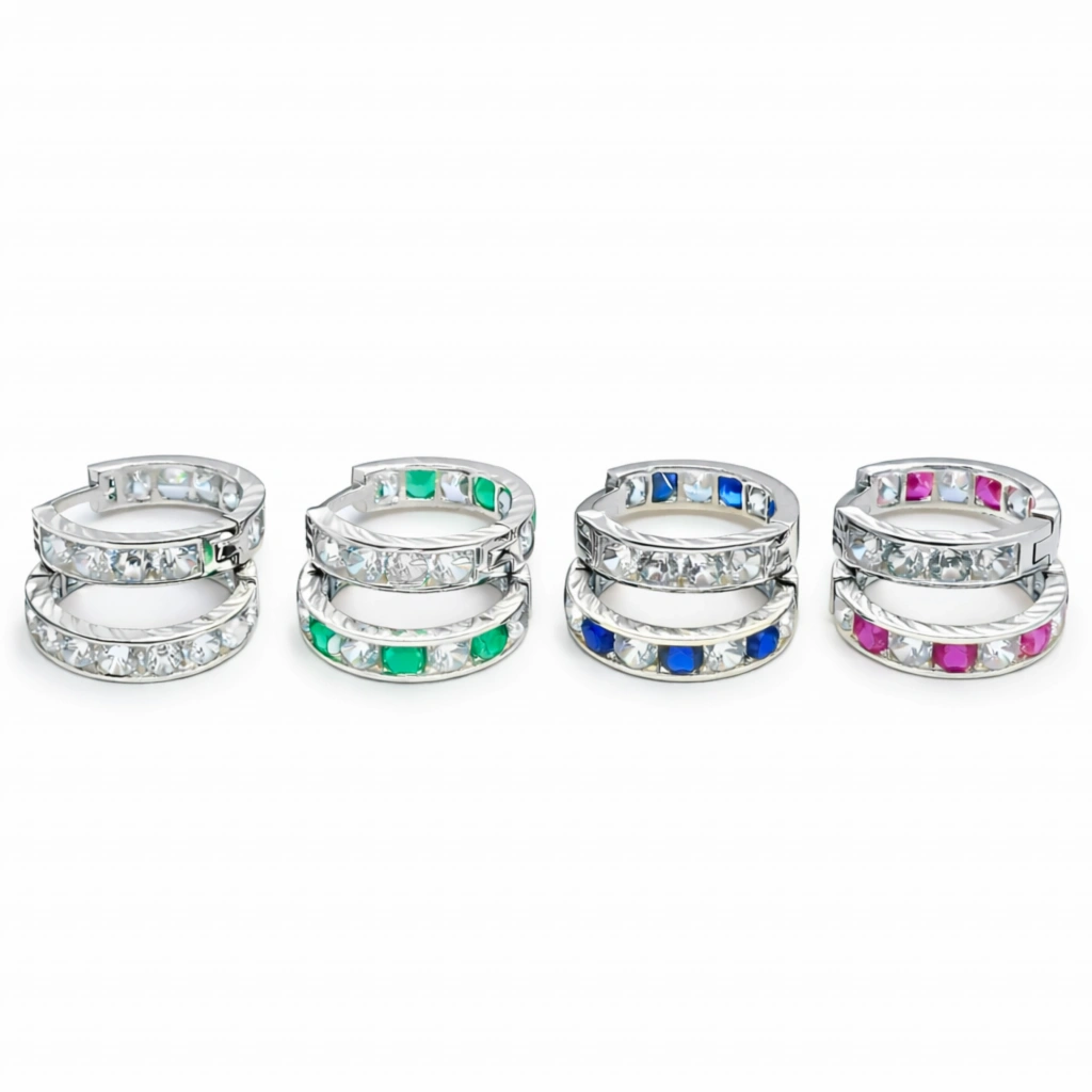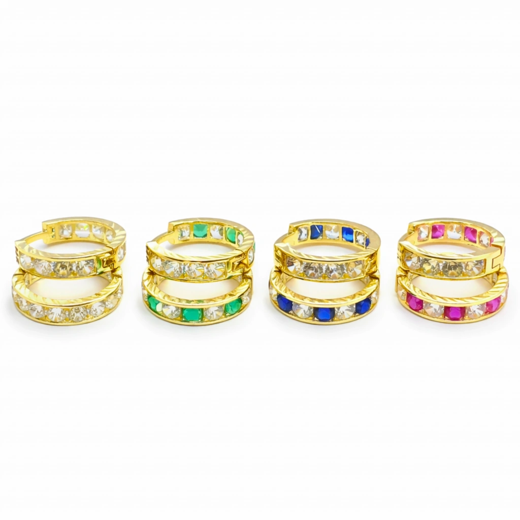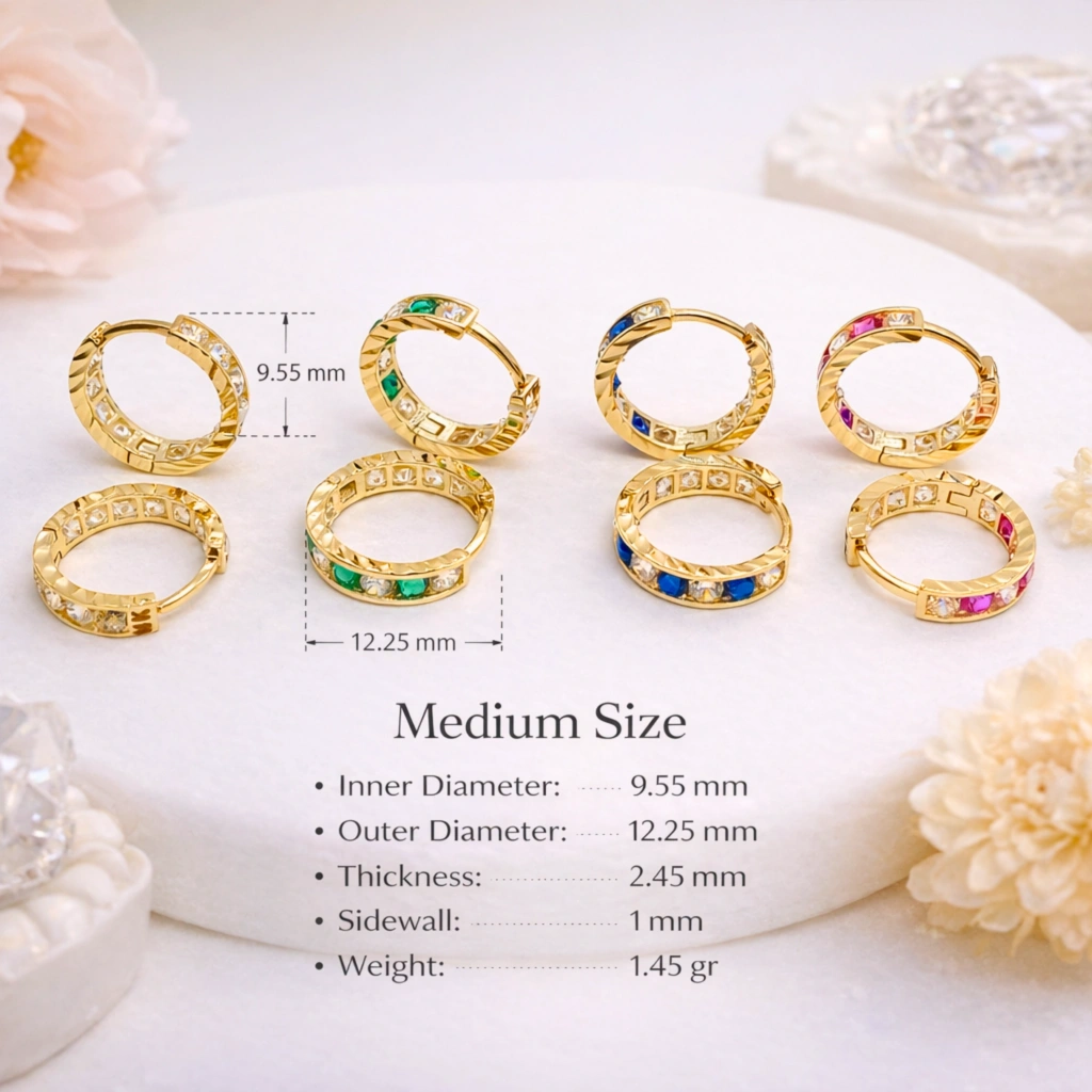 Orta boy halka formu ve renkli taş detayları ile tasarlanan bu küpe, canlı ve modern bir stil sunar.