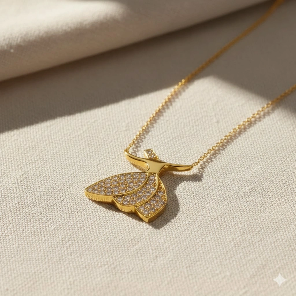 Semazen figürünün manevi anlamını zarif çizgilerle yansıtan bu 14 Ayar Altın Semazen Kolye, sadeliği ve ruhani sembolizmi bir araya getirir. Her anınıza derinlik katan bu özel tasarım, stilinizde anlamlı bir iz bırakır.