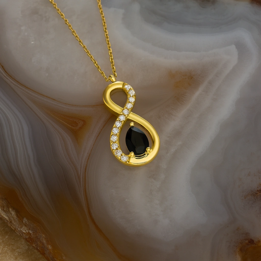 Güç, zarafet ve sonsuzluğu simgeleyen siyah oniks sonsuzluk kolye, modern ve şık tasarımıyla stilinize etkileyici bir dokunuş katar. Siyah oniks taşının derin tonu ve altın detaylarla birleşen formu, günlük kullanımda ve özel anlarda göz alıcı bir tamamlayıcı sunar. Her anı anlam, şıklık ve zarafetle taçlandıran bu kolye, hem kendiniz hem de sevdikleriniz için ideal bir hediyedir.