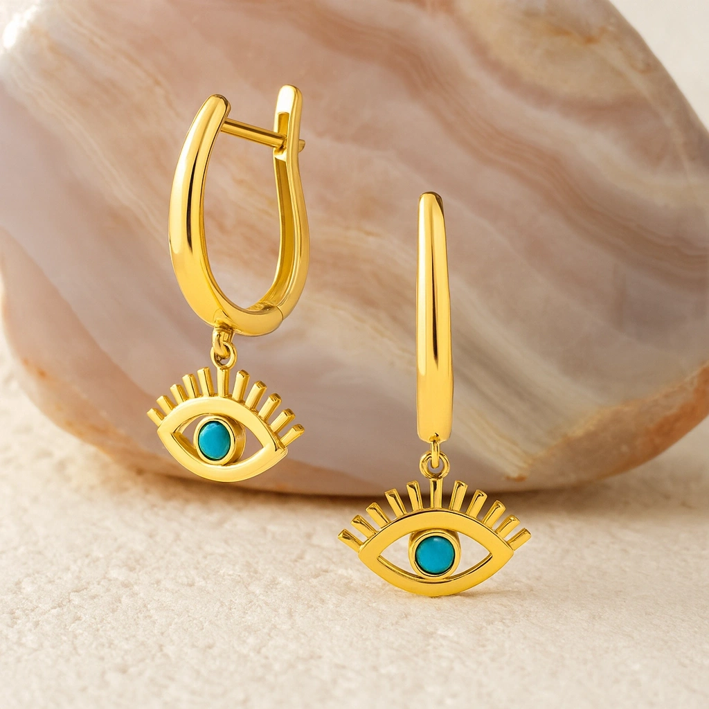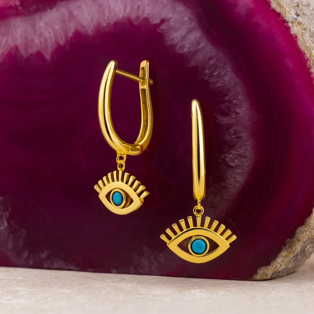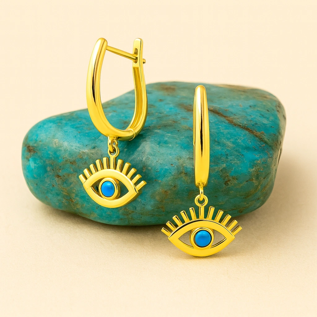 Turkuaz taşının canlı ve ferahlatıcı tonlarını yansıtan bu sallantı küpe, hem modern hem de zarif bir görünüm sunar. İnce tasarımı ve hareketli yapısıyla günlük şıklığı tamamlayan, özel anlarda ise dikkat çeken bir aksesuardır. 14 ayar altının parlak dokusu, turkuaz taşının canlı mavisini öne çıkararak sofistike bir görünüm sağlar.