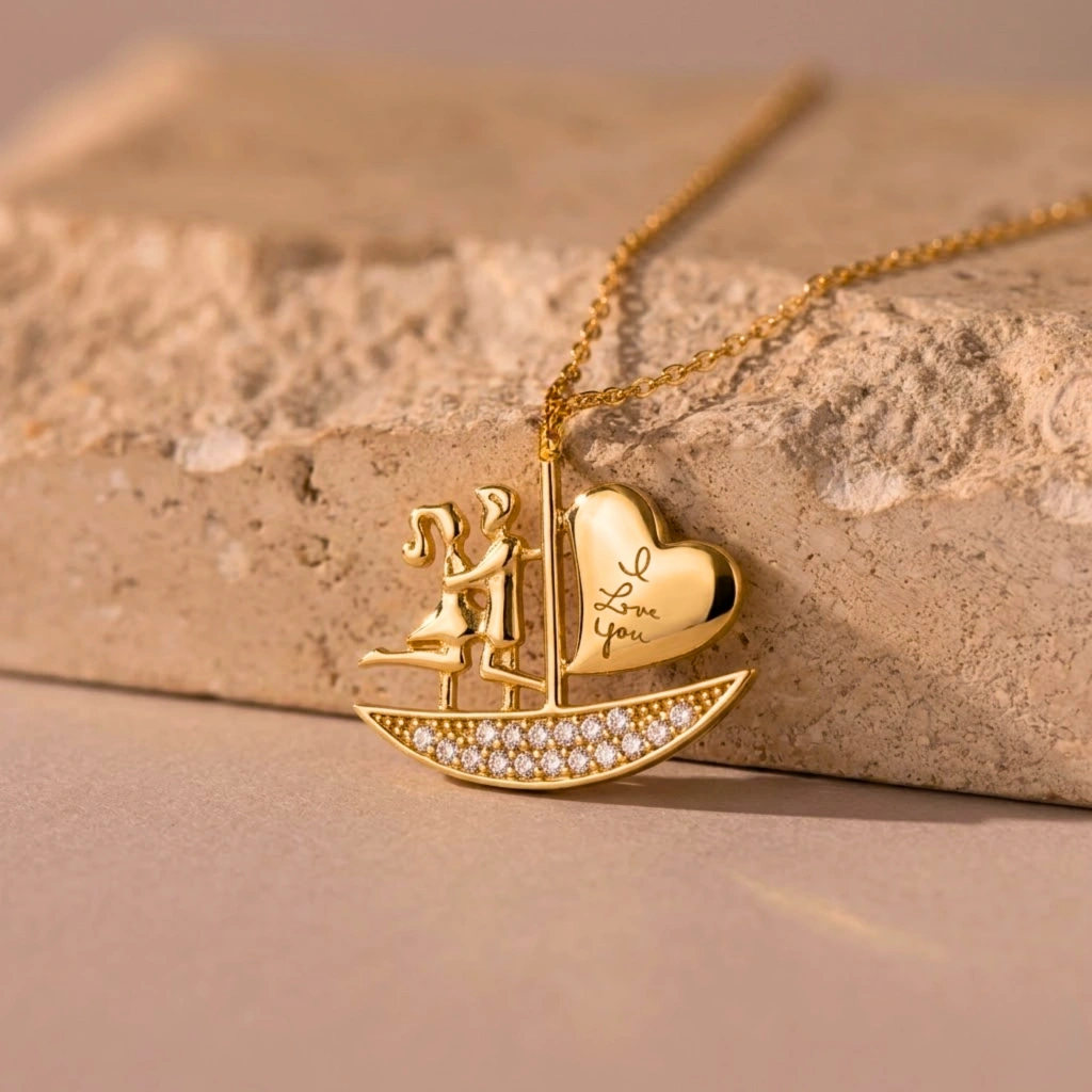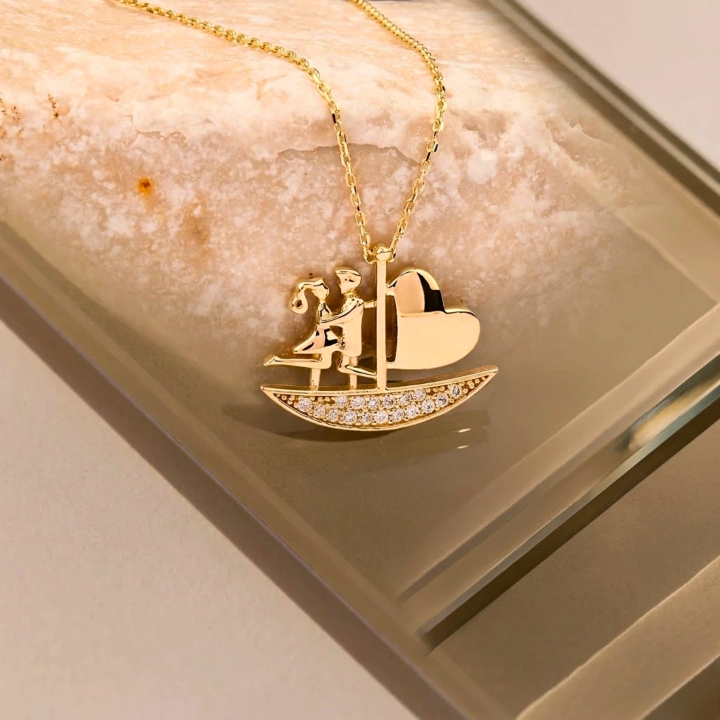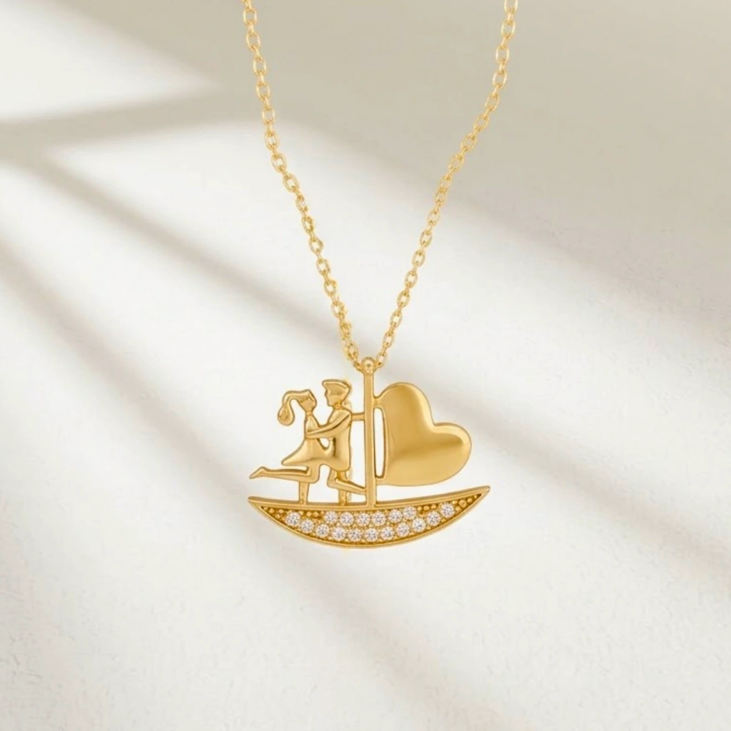 Bu zarif yelkenli kalp kolye, modern minimalizmi romantik ve anlam yüklü bir tasarımla buluşturur. Kalp formu içinde yelkenli figüründen ilham alan özel tasarımı ve sade altın yapısı sayesinde günlük kullanım, kombinleme veya anlamlı hediyeler için mükemmel bir tercihtir. Birlikte yol alma, sevgi ve bağlılığı simgeleyen zamansız bir tasarımdır.