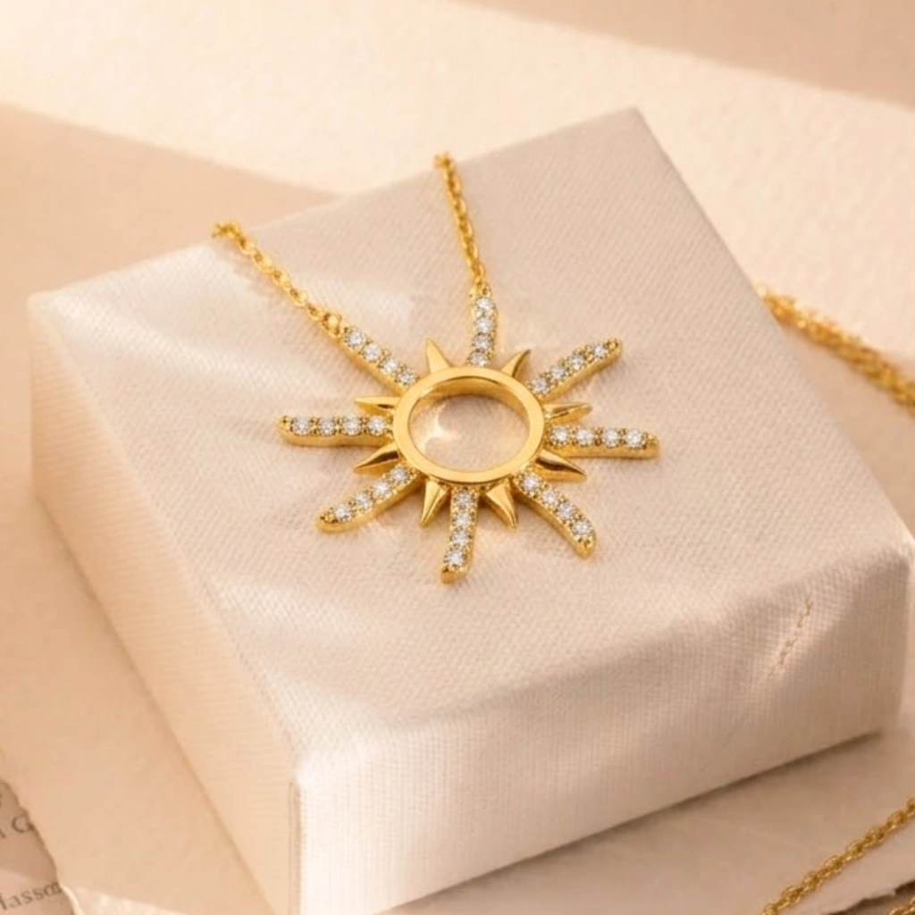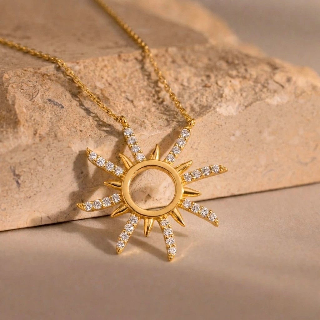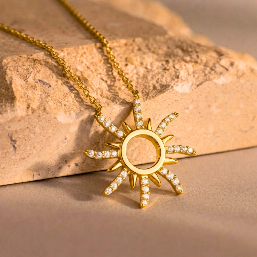 Şimdi Keşfedin: Sıcak ve güçlü güneş sembolünü taşıyan bu altın kolyeyi keşfedin.