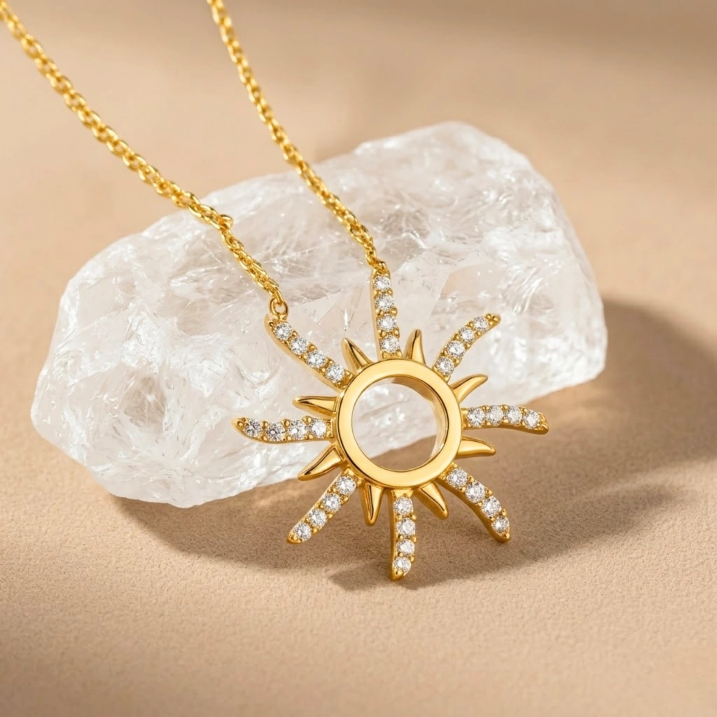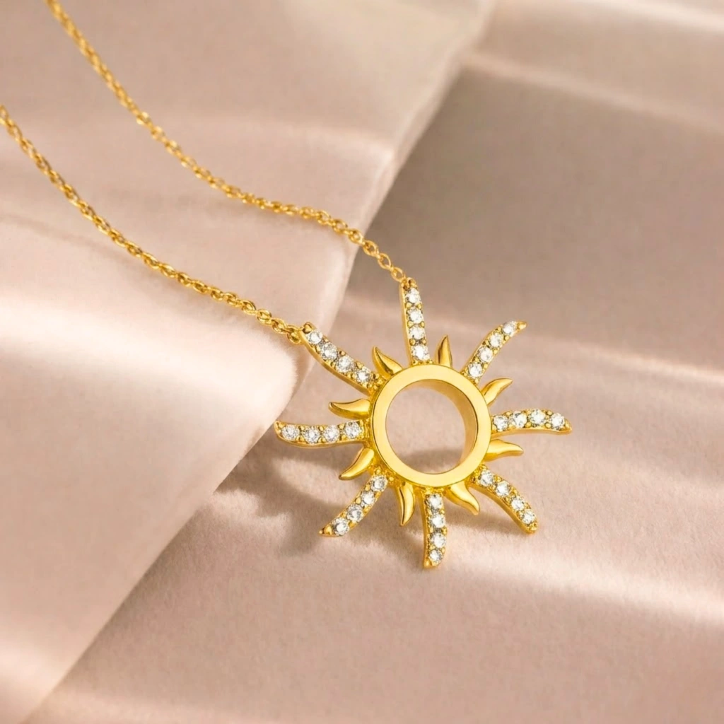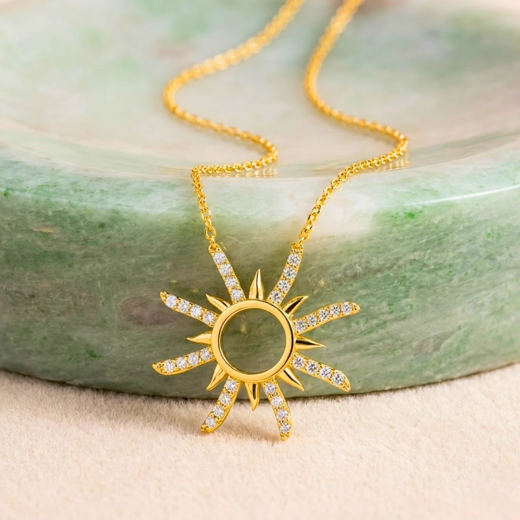 Şimdi Keşfedin: Sıcak ve güçlü güneş sembolünü taşıyan bu altın kolyeyi keşfedin.