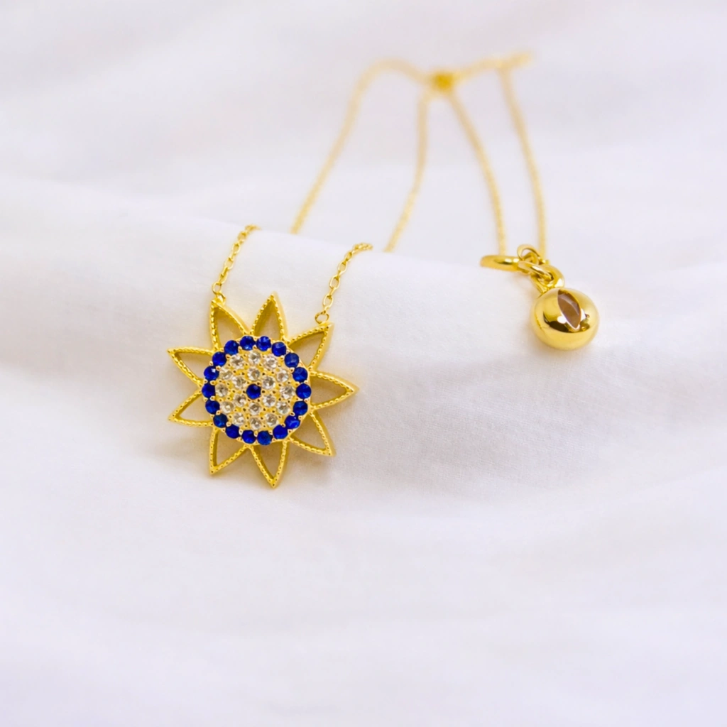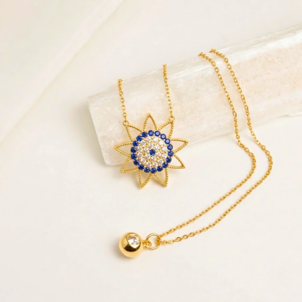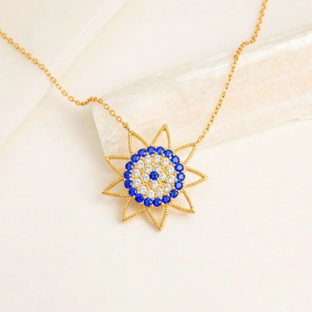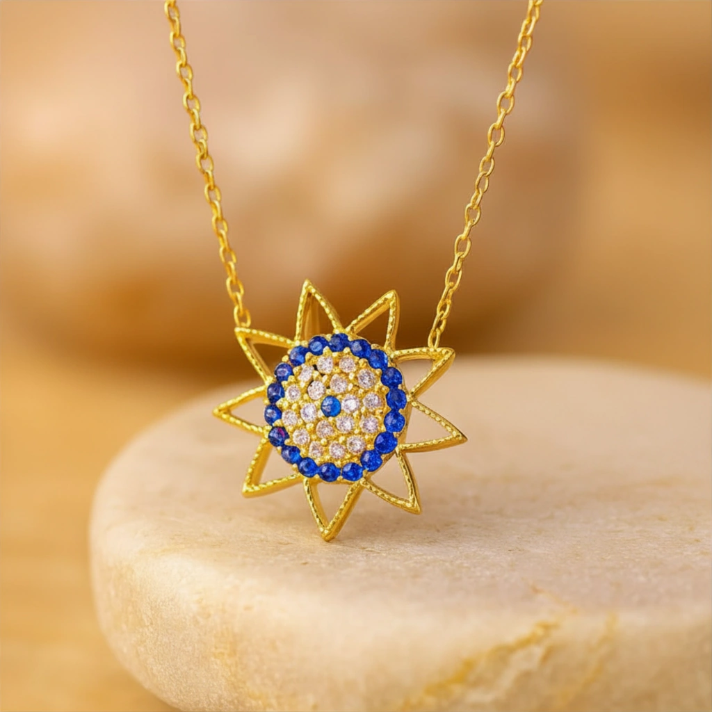 Şimdi Keşfedin: Safirin göz alıcı tonlarıyla tasarlanan bu güneş kolyesiyle stilinize ışık katın.