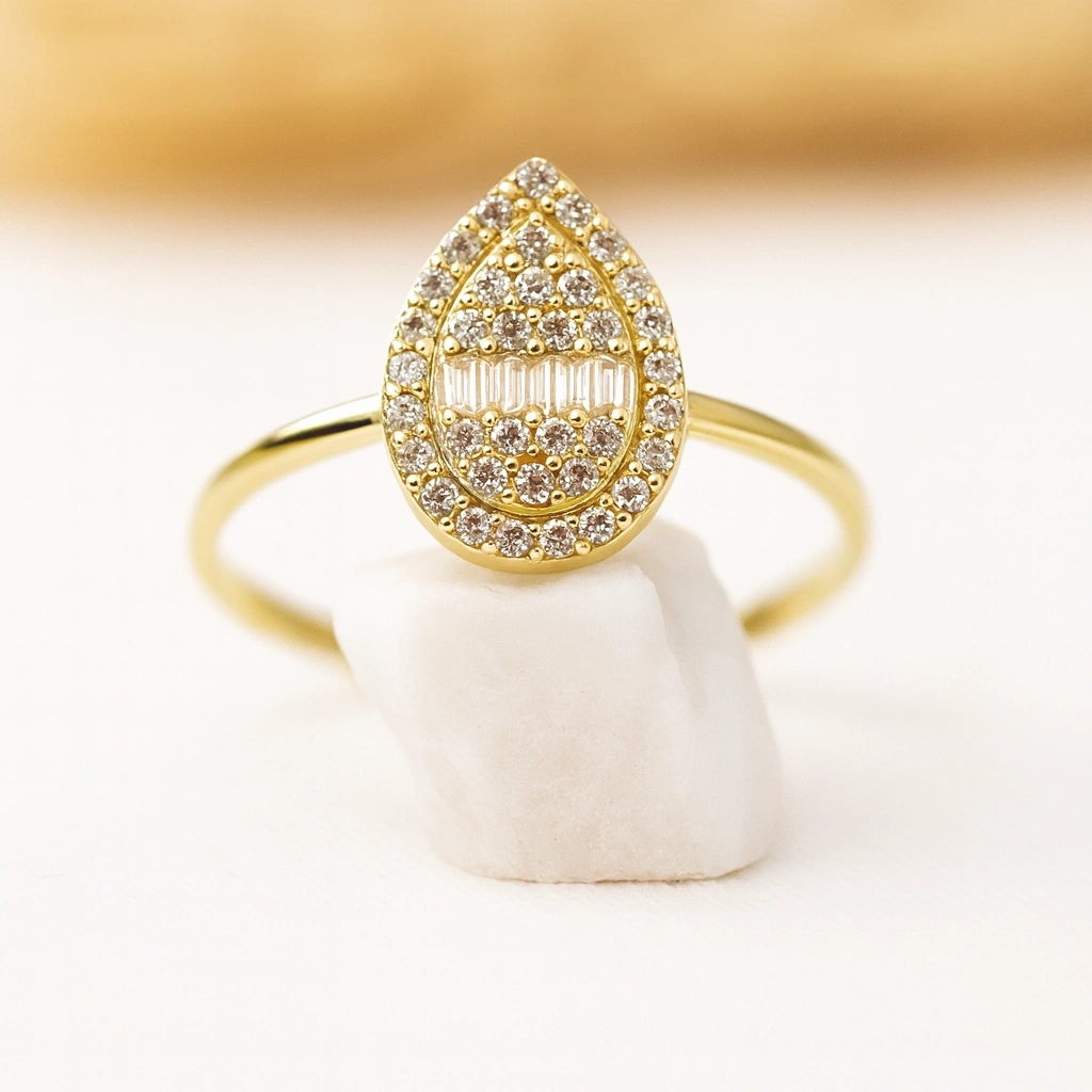 This elegant baguette and pear-cut birthstone ring blends modern minimalism with timeless romance ?. Its delicate teardrop design and sleek gold band make it perfect for engagements, stacking, or heartfelt gifts. A graceful piece that symbolizes love, clarity, and meaningful connection in every moment ✨.