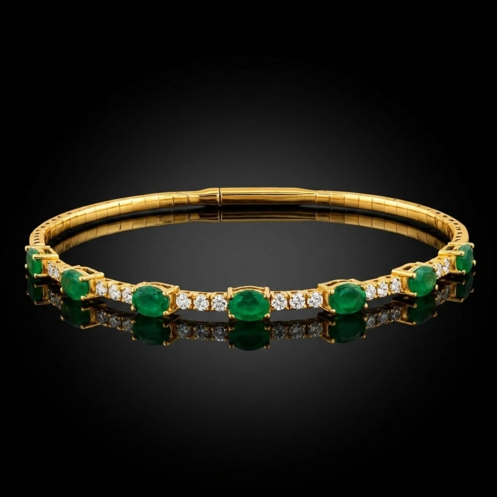 Suyolu formunun kesintisiz zarafetini yeşil zümrüdün asil tonu ve pırlantanın ışıltısıyla bir araya getiren bu bilezik, bilekte güçlü ve sofistike bir etki yaratır.