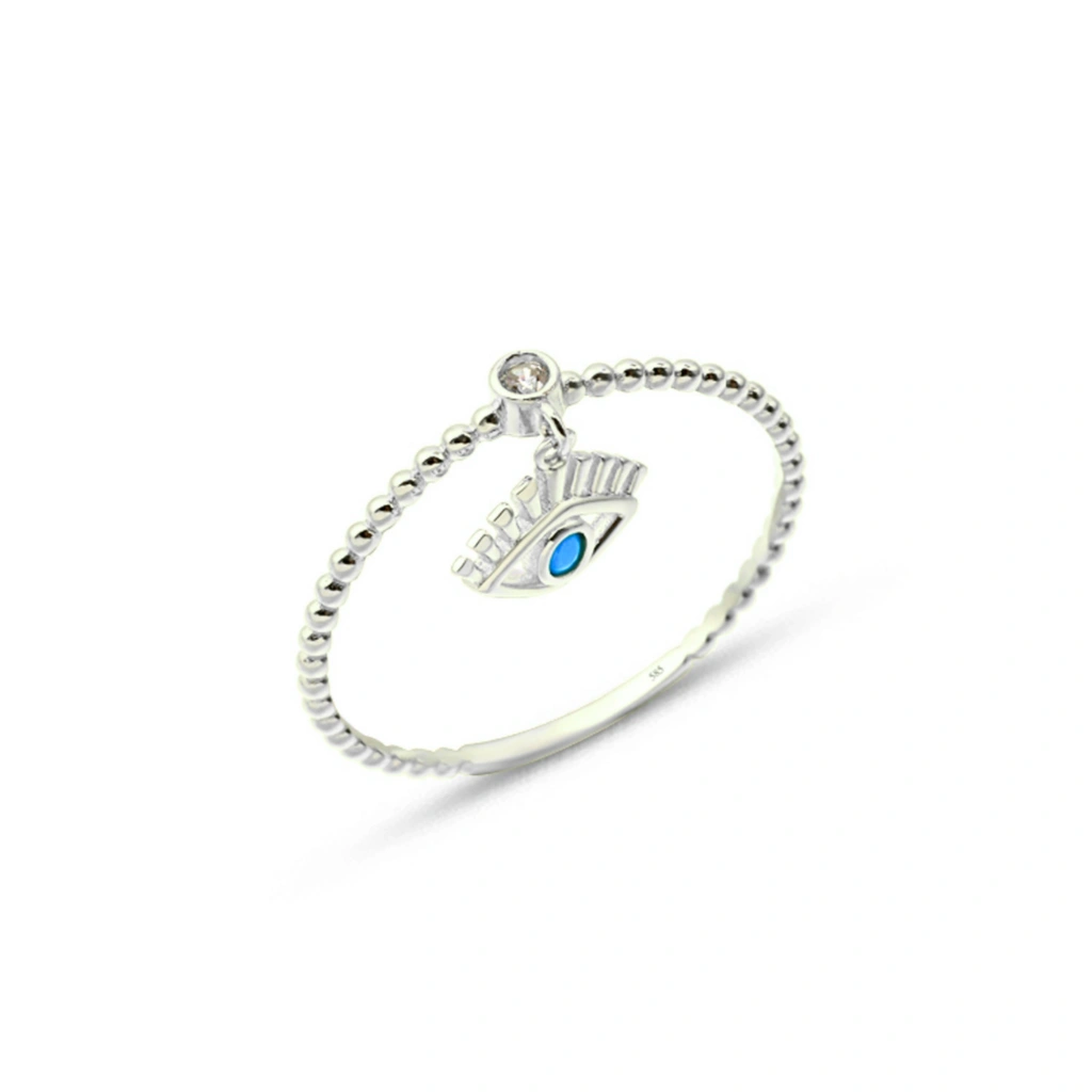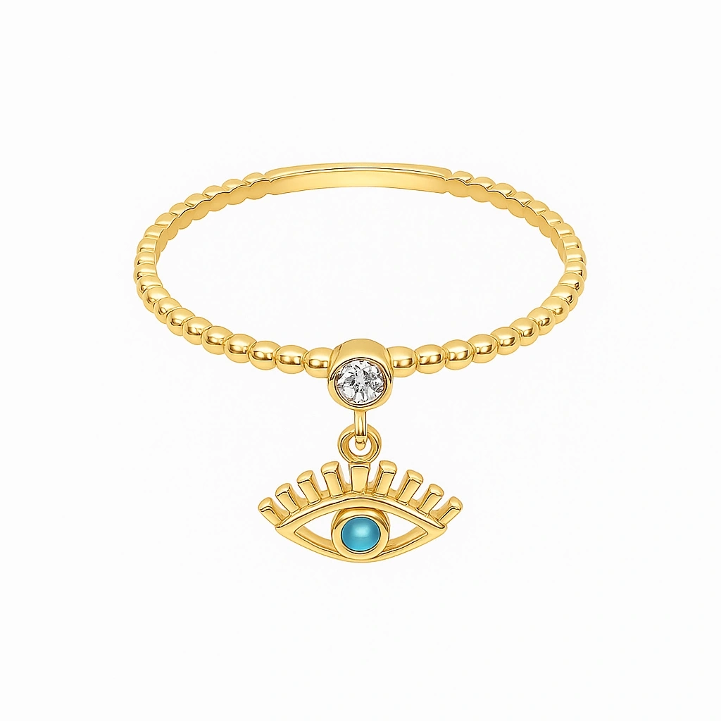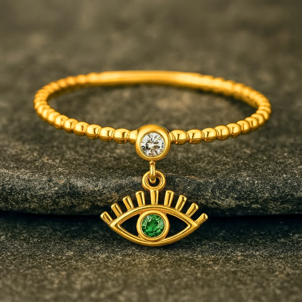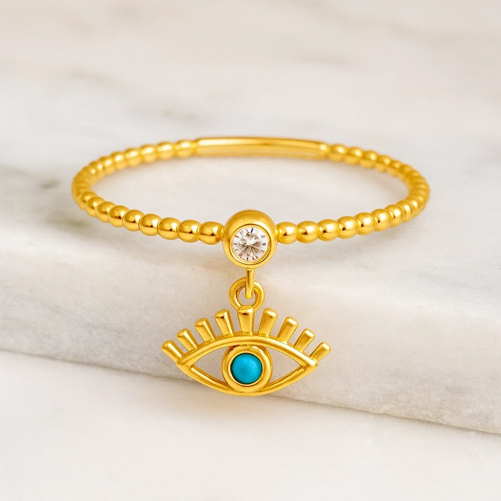 Design: Elegant twisted band with a delicate dangling evil eye charm for a modern and symbolic touch.