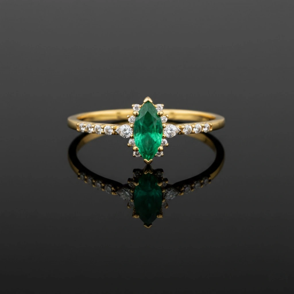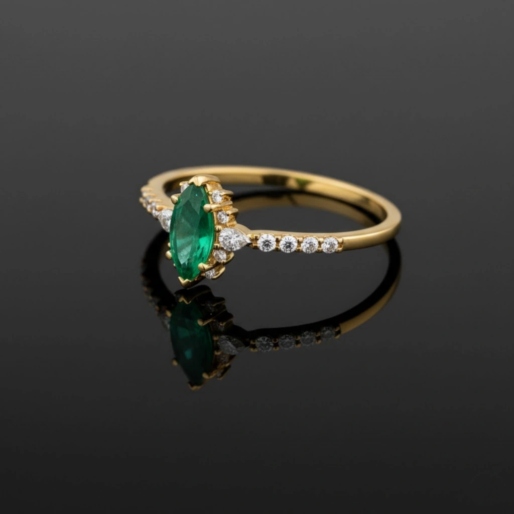 Combining the elegant silhouette of a marquise-cut emerald with the refined sparkle of diamonds, this ring offers a graceful and sophisticated appearance.