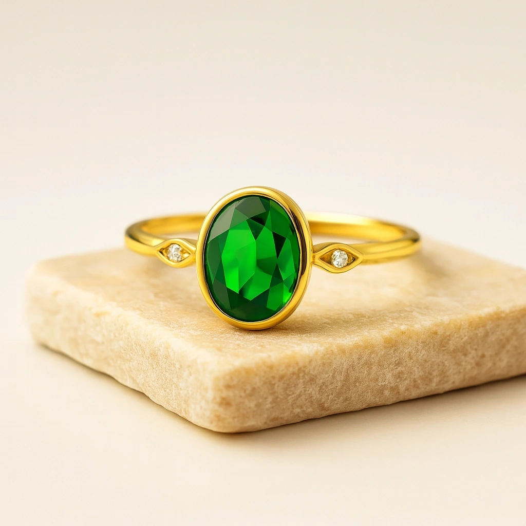 Doğanın canlı enerjisini taşıyan oval kesim zümrüt yüzük, zarif formu ve modern görünümüyle her stile uyum sağlayan özel bir parçadır. Zümrüdün etkileyici yeşil tonu, altının sıcak ışıltısıyla birleşerek hem günlük kullanıma hem de özel anlara sofistike ve anlamlı bir dokunuş katar.