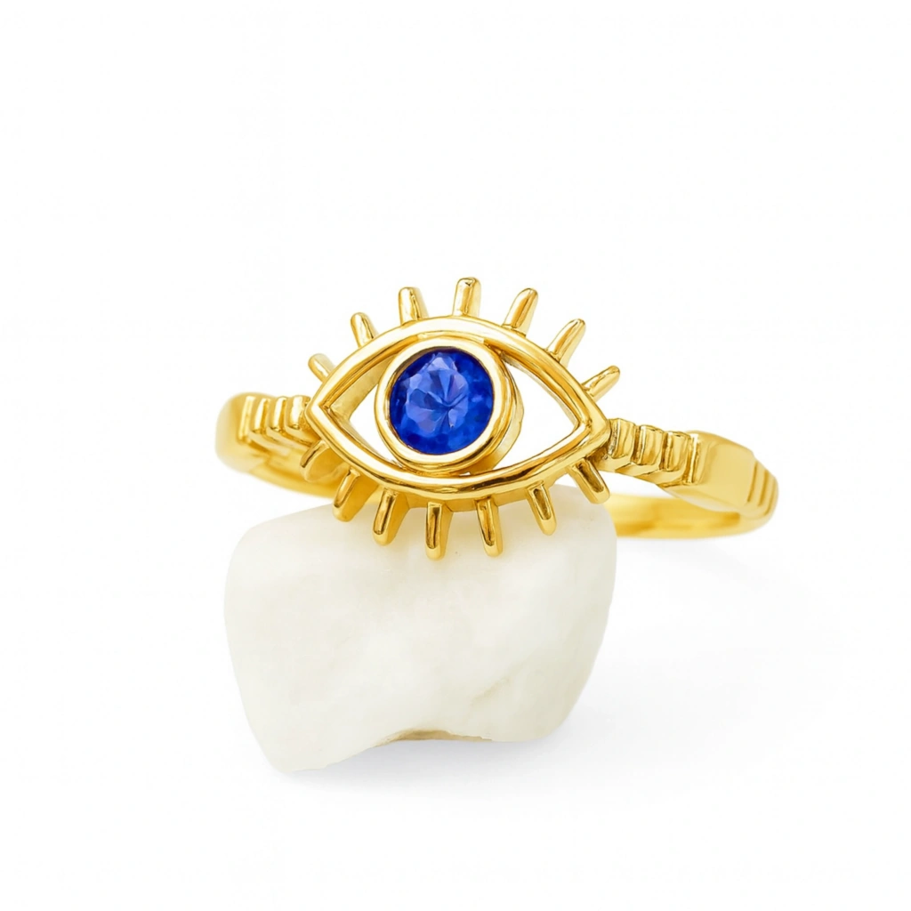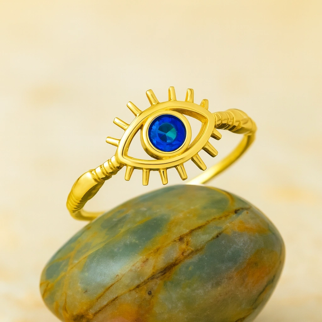 This elegant eye-shaped ring combines the deep brilliance of blue sapphire with a modern yet mystical design. Its minimalist form and striking eye detail make it a meaningful choice for those who appreciate symbolic jewelry. The bright shine of 14K solid gold ensures a perfect fit for both daily wear and special moments.
