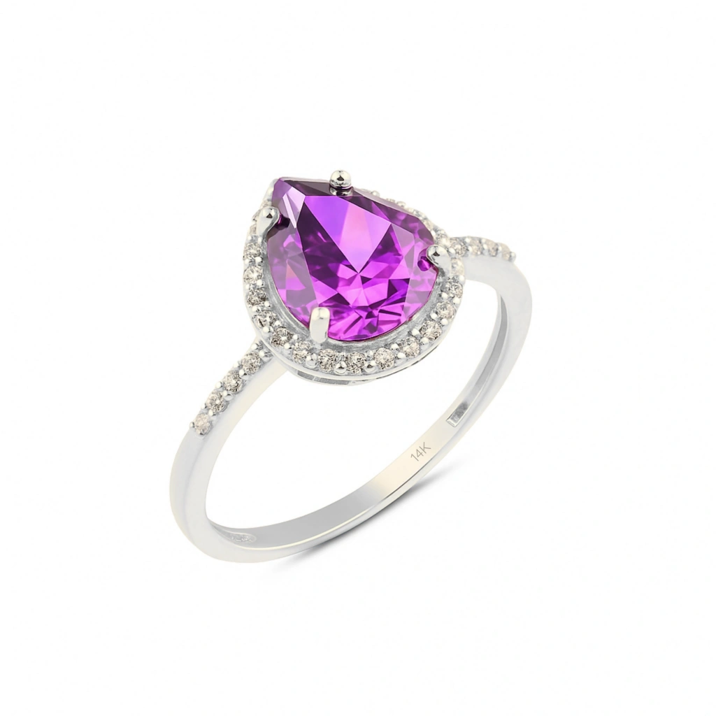 This exquisite design unites the enchanting purple tones of pear-cut amethyst with the refined shine of 14K solid gold. Its vibrant gemstone and polished gold band create a romantic yet modern look, making it an ideal choice for both special occasions and everyday elegance. The calming and expressive energy of purple gemstones adds depth and meaning to this graceful piece.